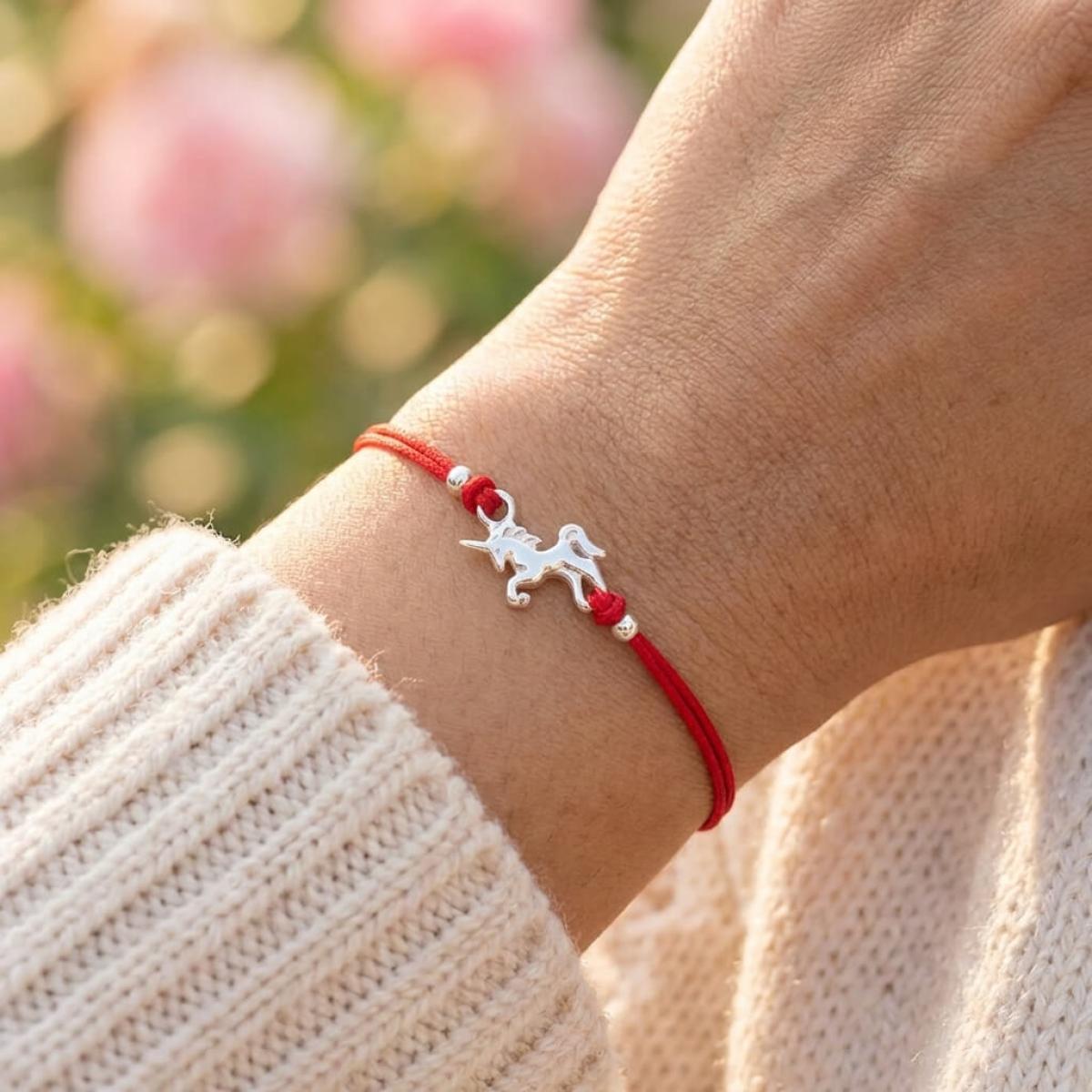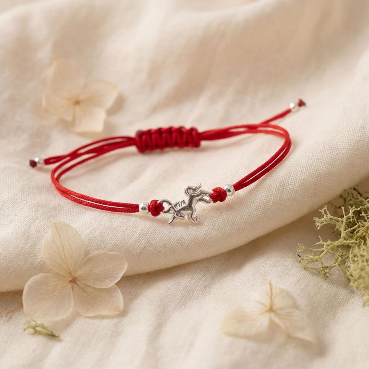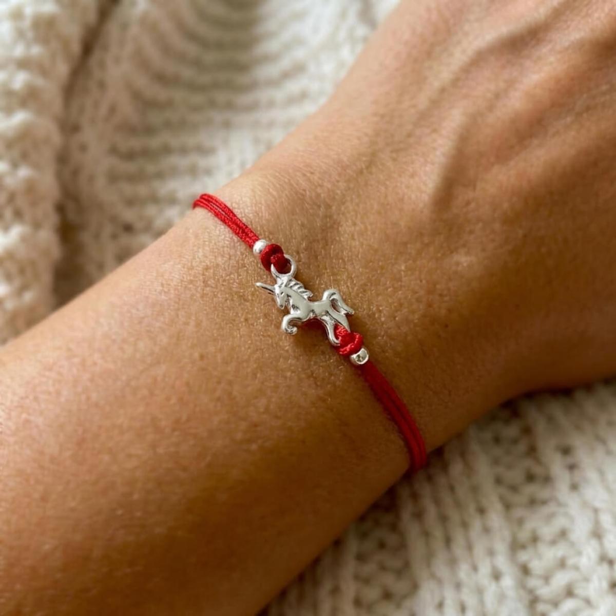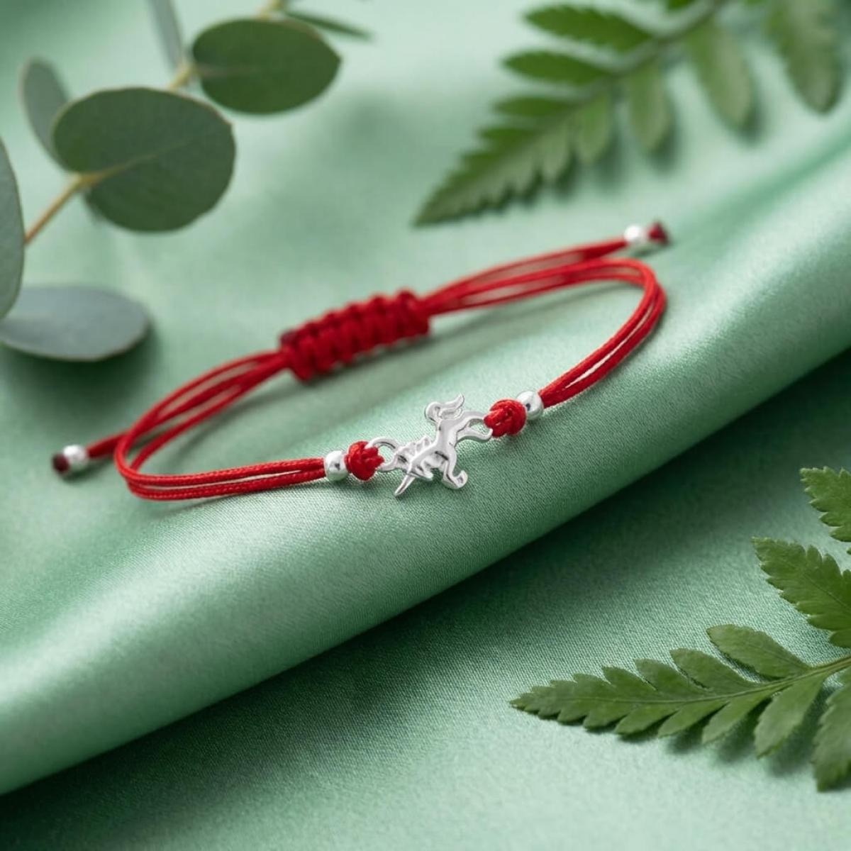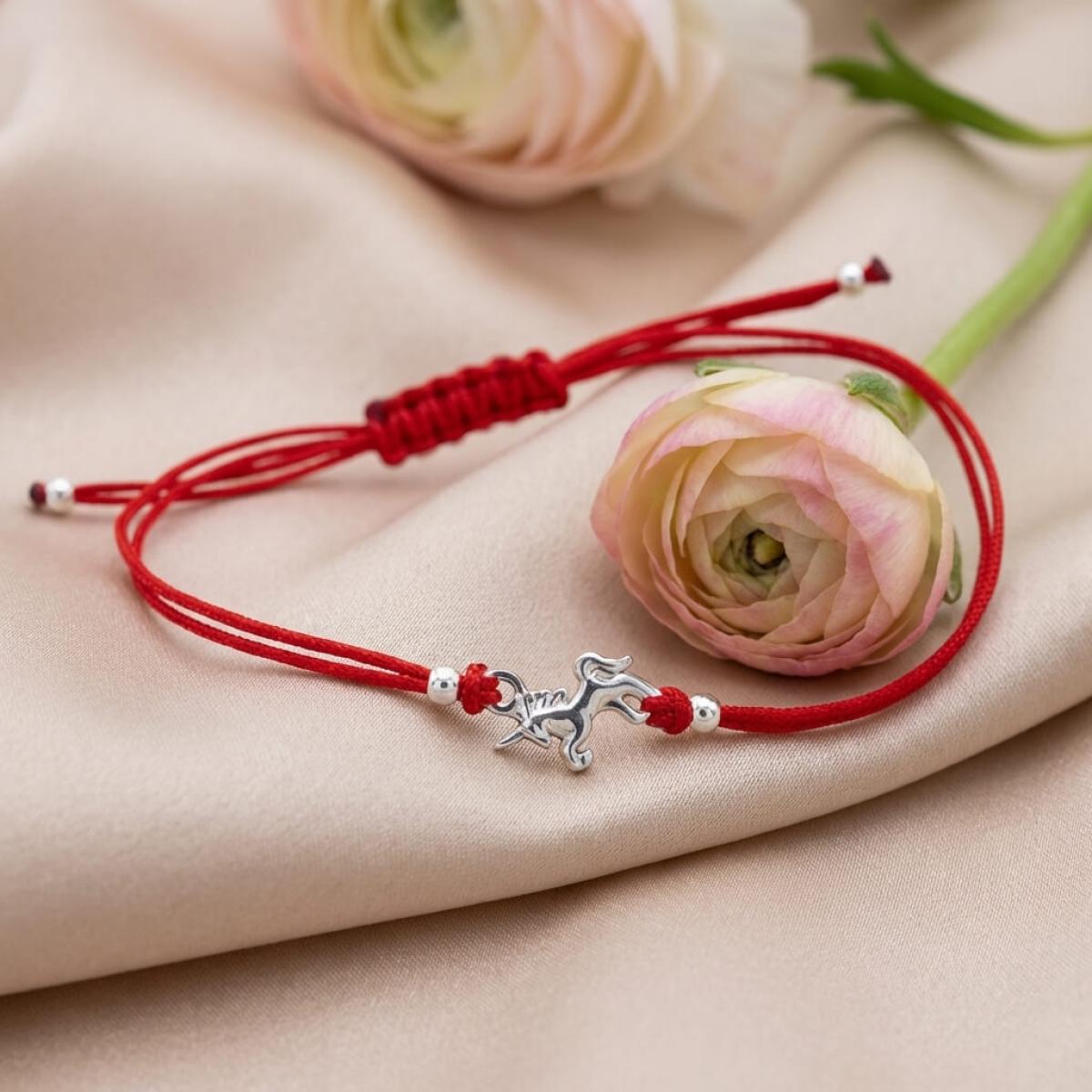 Гривна с червен конец и сребърен елемент еднорог