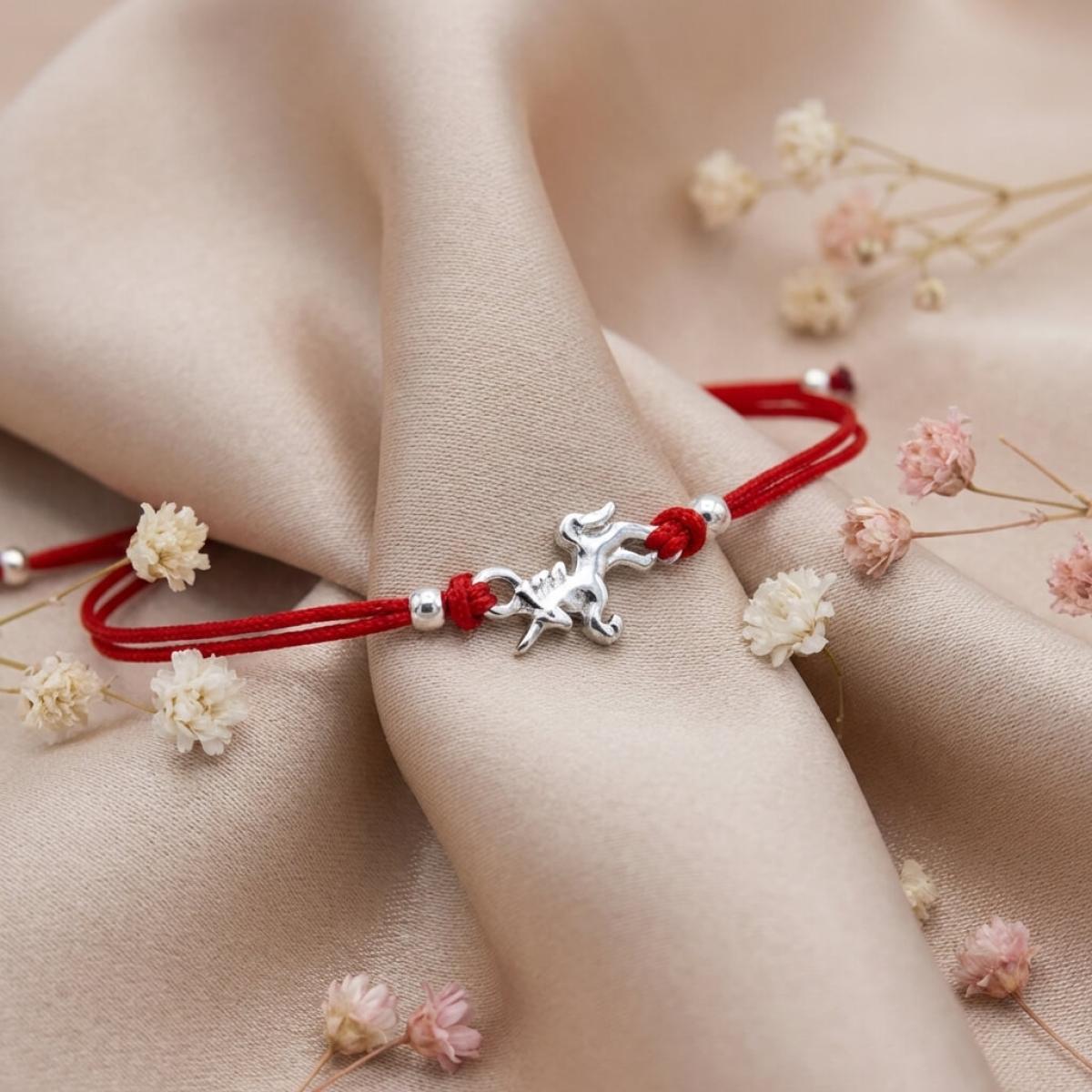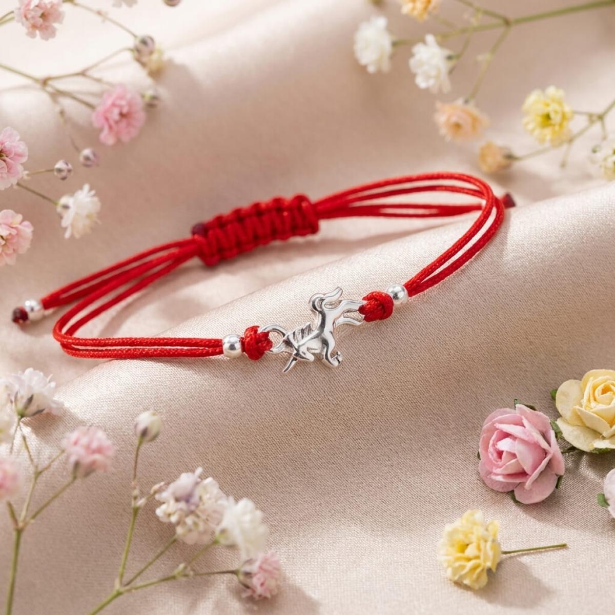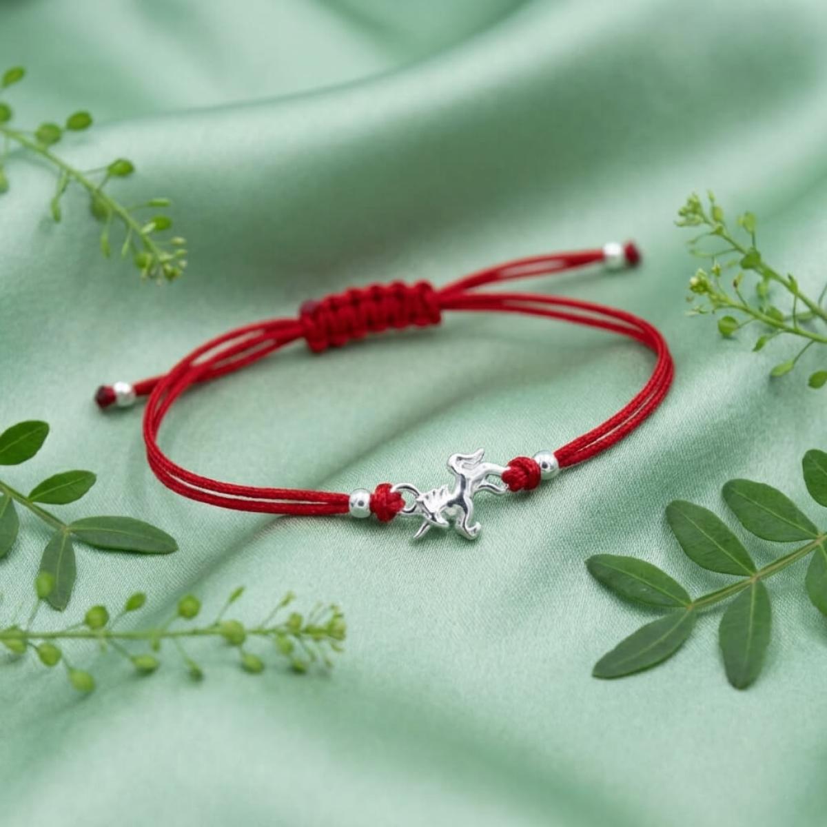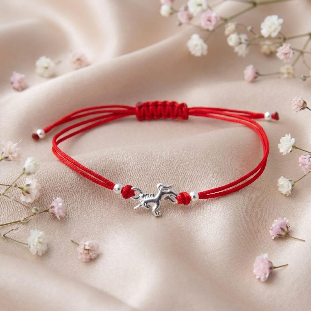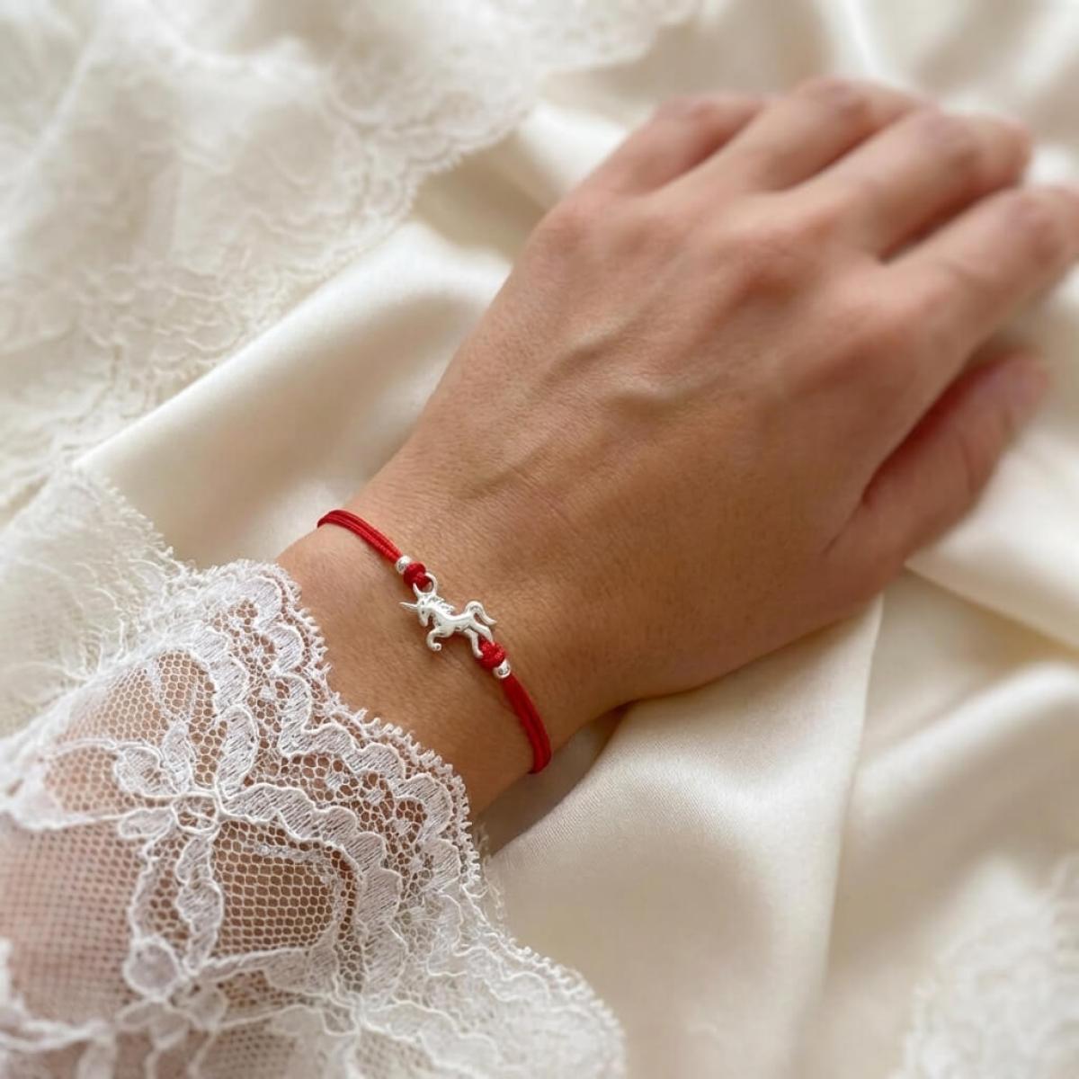 Гривна с червен конец и сребърен елемент еднорог