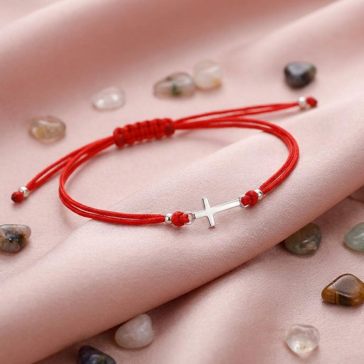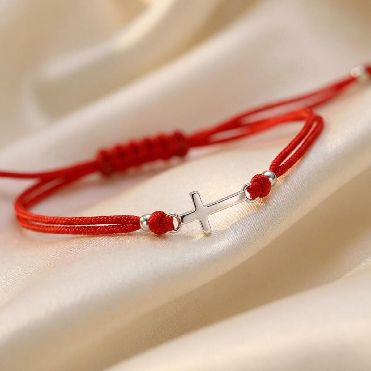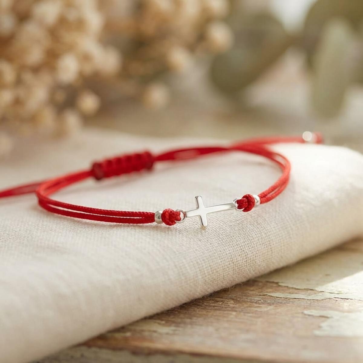 Едва ли има по-уместно решение от това кръстът да бъде декорация на един мощен амулет, какъвто е конецът в червено. Всеки от двата елемента сам по себе си е символ на закрила, като кръстчето показва упование в закрилата на самия Бог. Изделието е един чудесен начин да осигурите защита на любим човек – дете или възрастен.