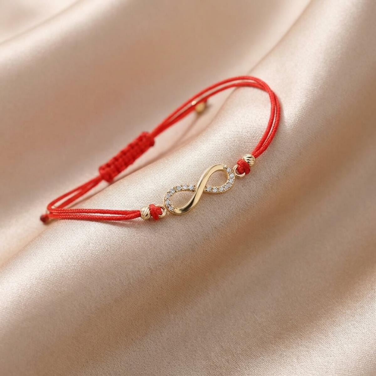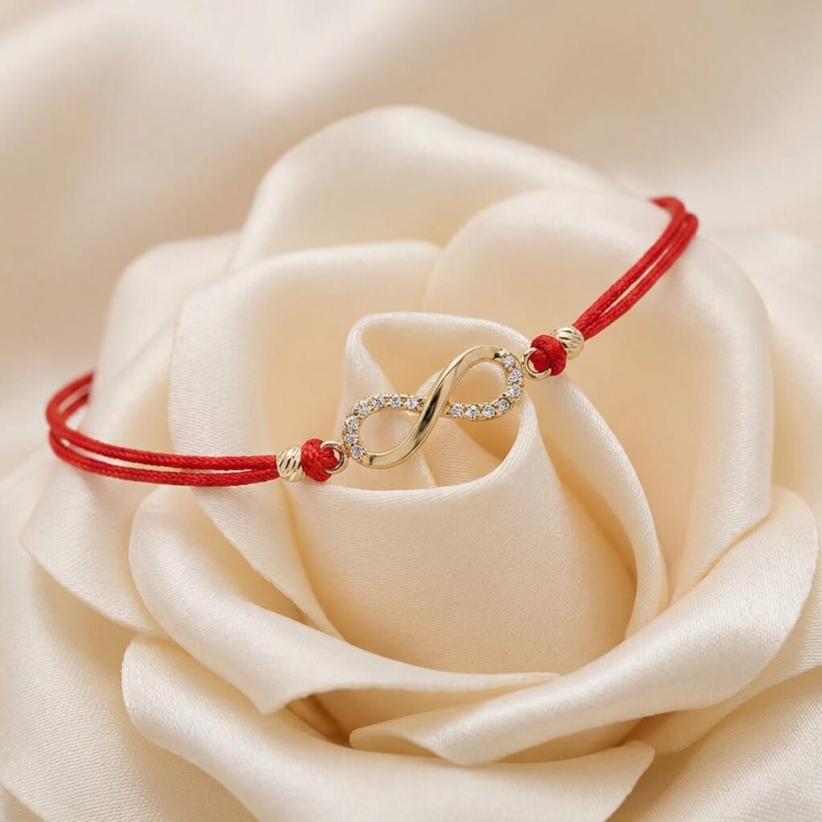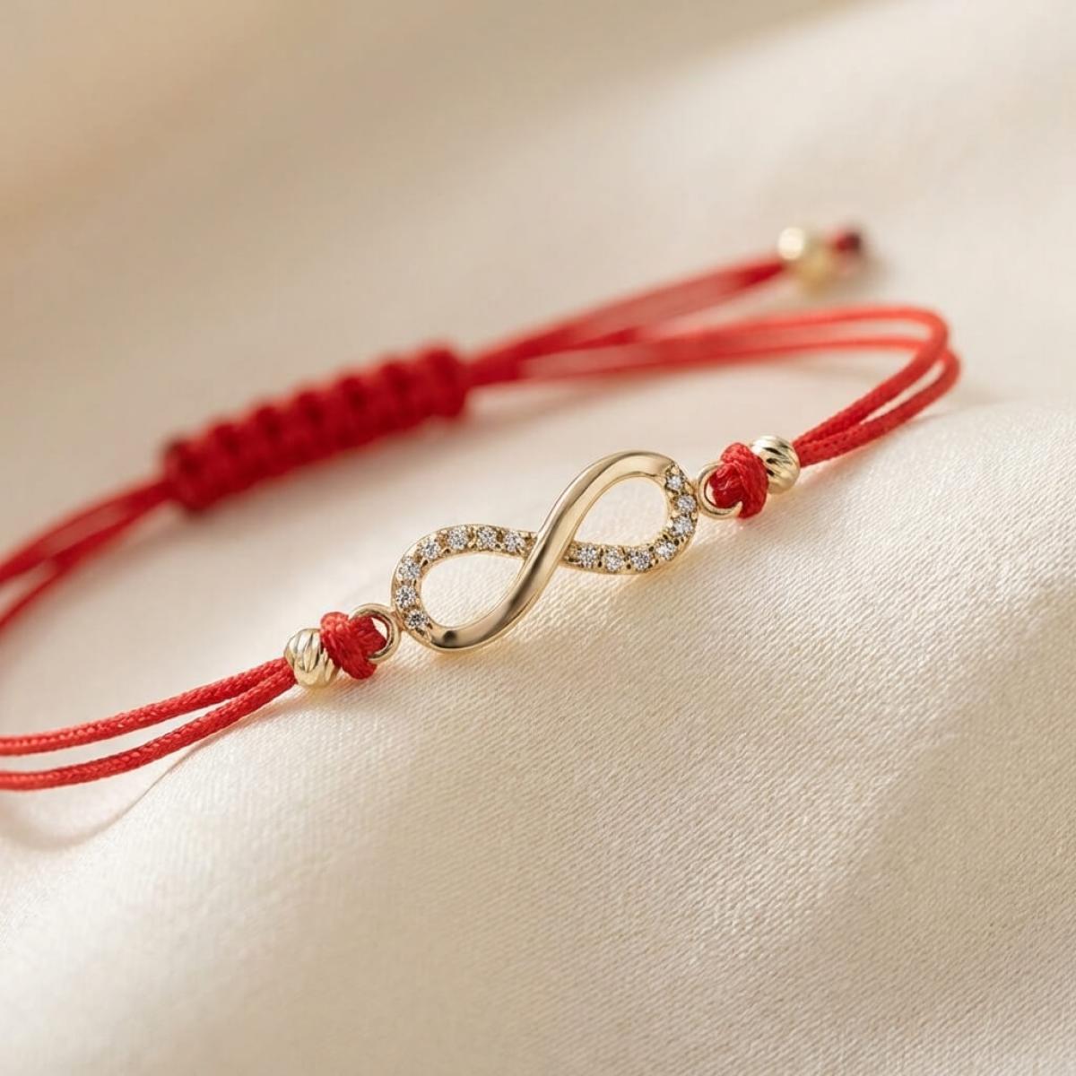 Гривна с червен конец и златен елемент безкрайност