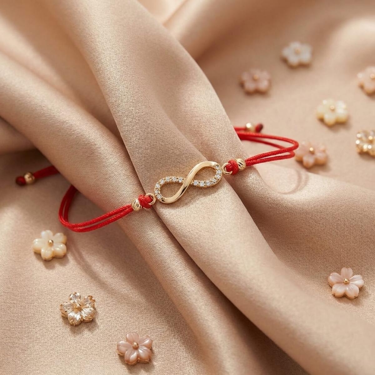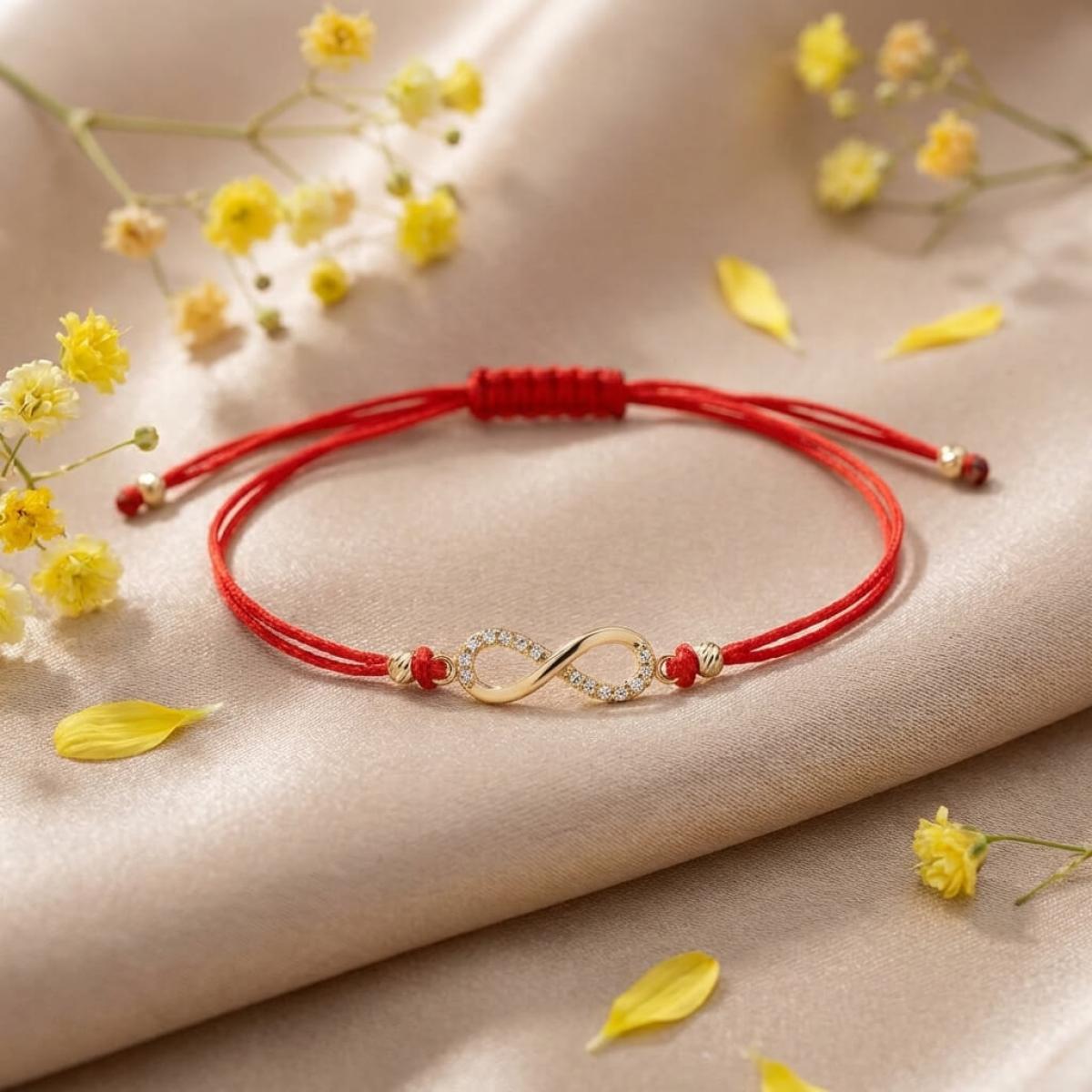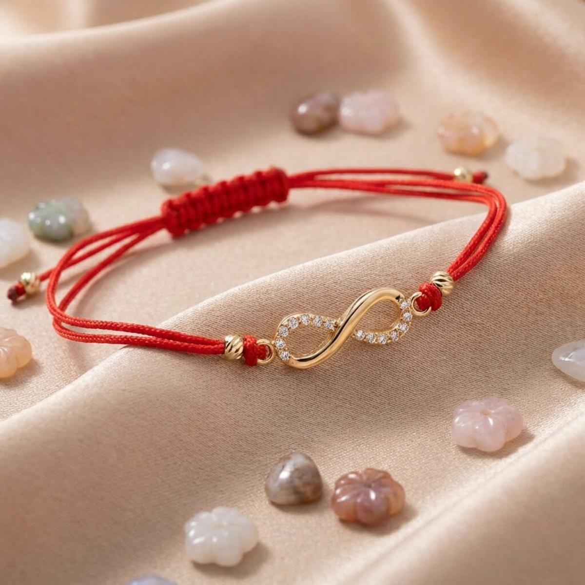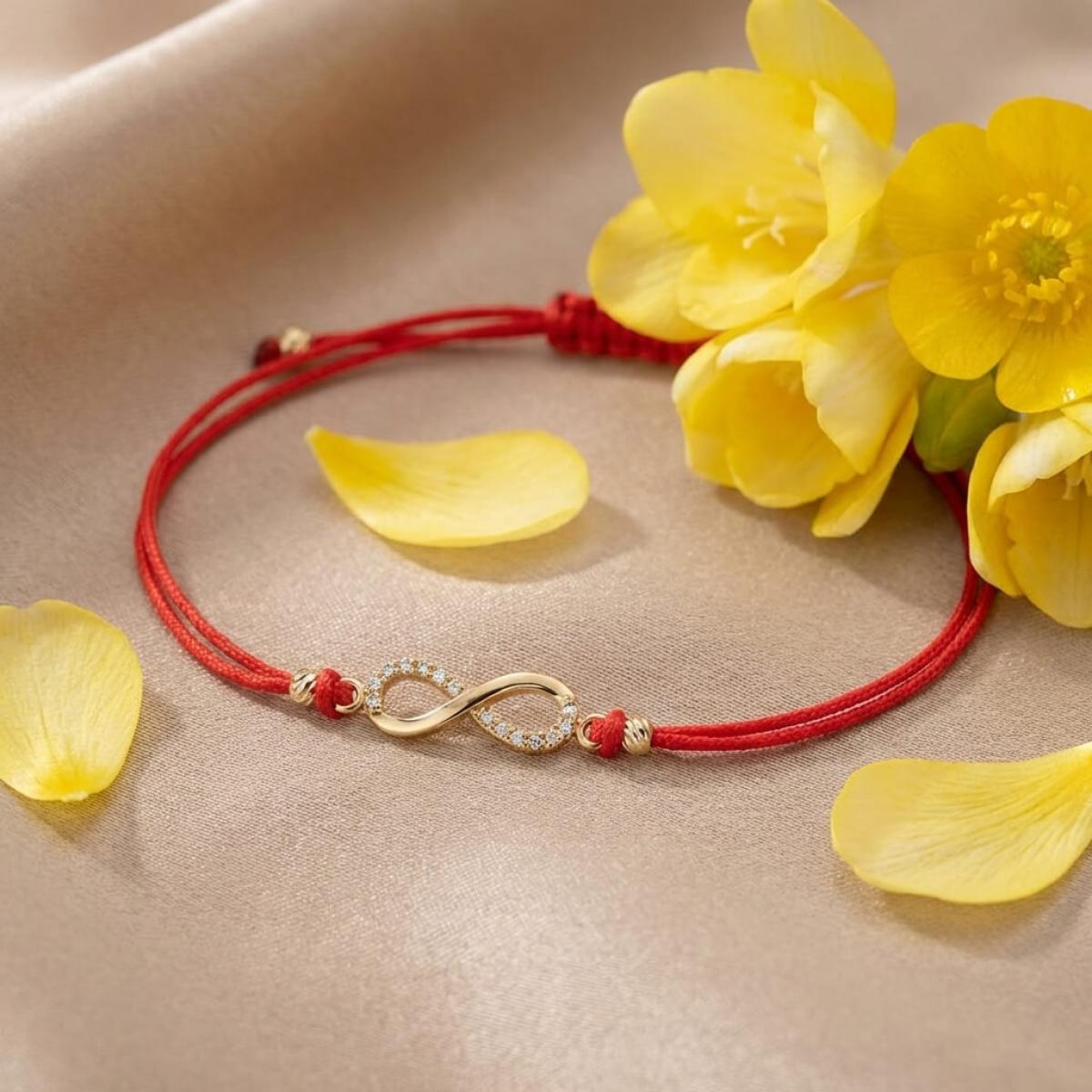 Гривна с червен конец и златен елемент безкрайност