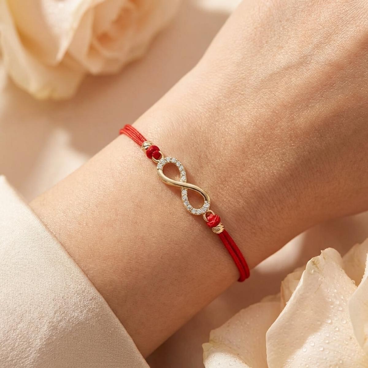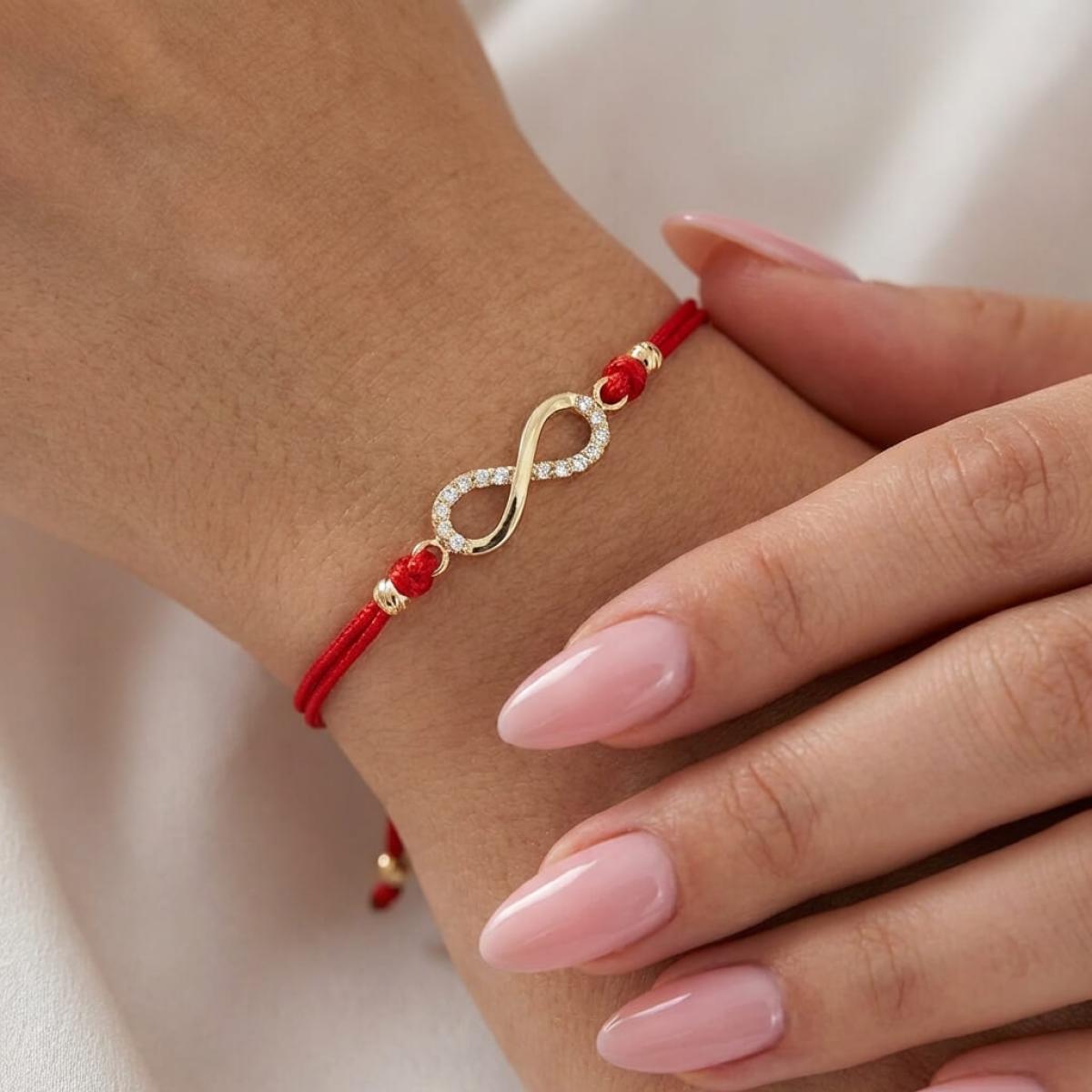Днес мъже, жени и младежи носят на ръцете си такъв талисман, само че визията му е значително стилизирана. В каталога ни ще откриете огромен асортимент от гривни с червени конци, декорирани със златен или сребърен елемент. В конкретният случай имаме златно украшение, оформено като знака за безкрайност.
