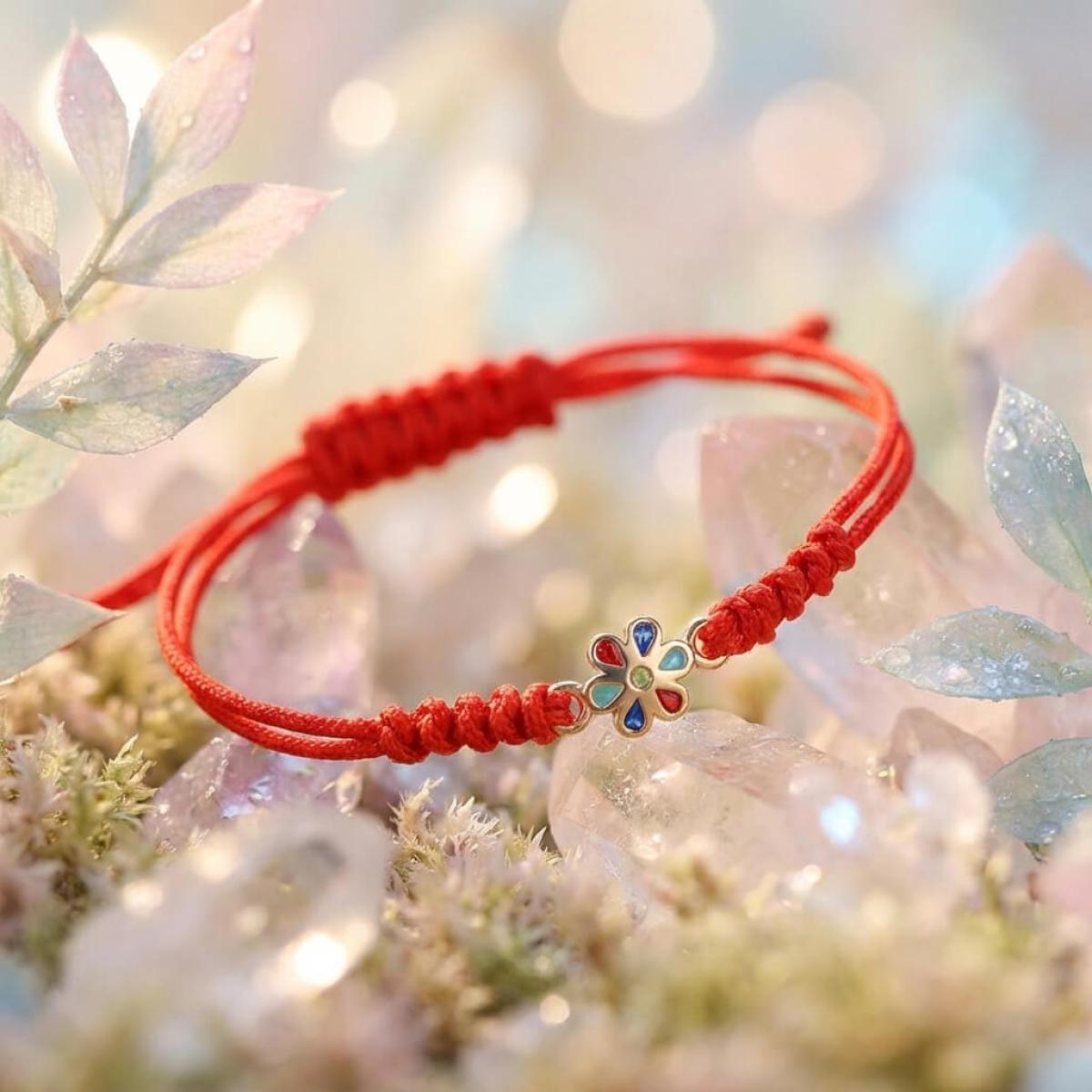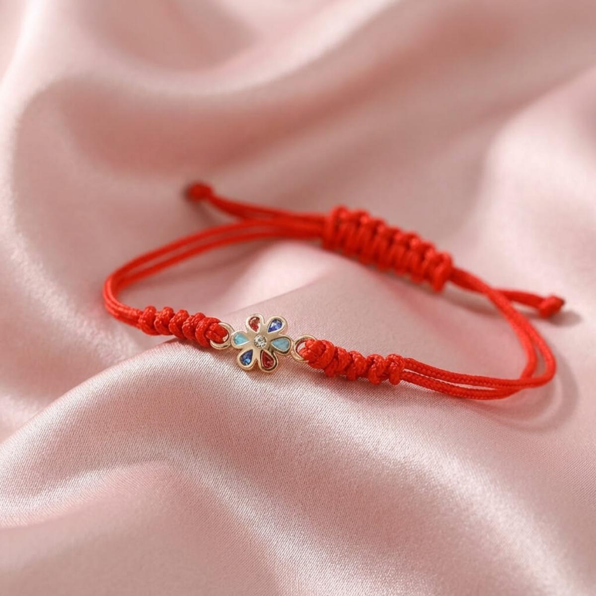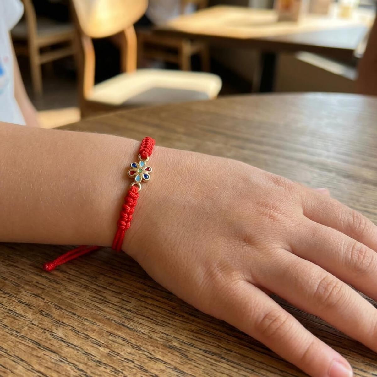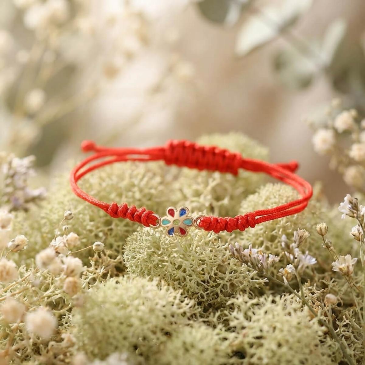 Гривна с червен конец и златен елемент цвете