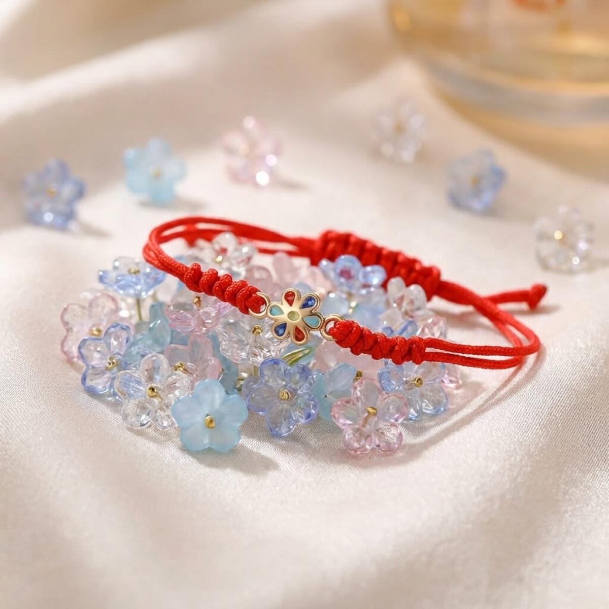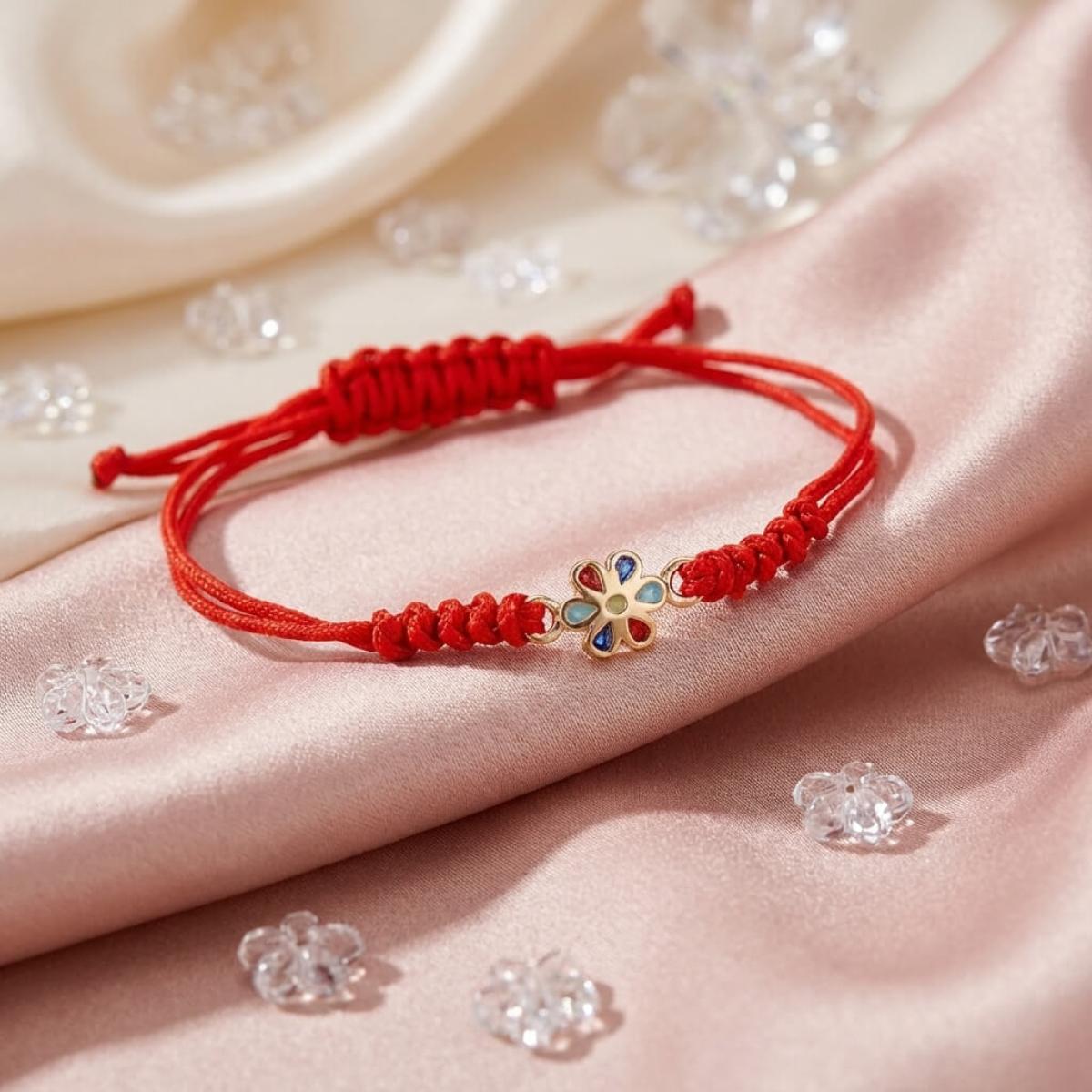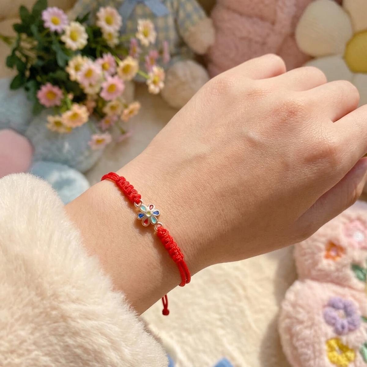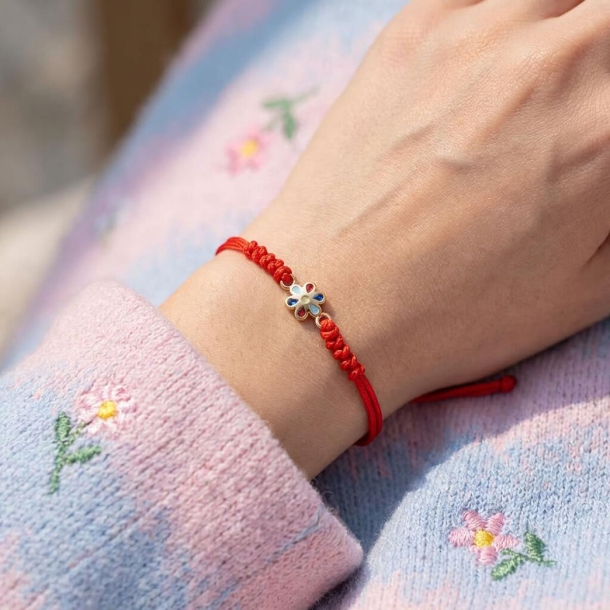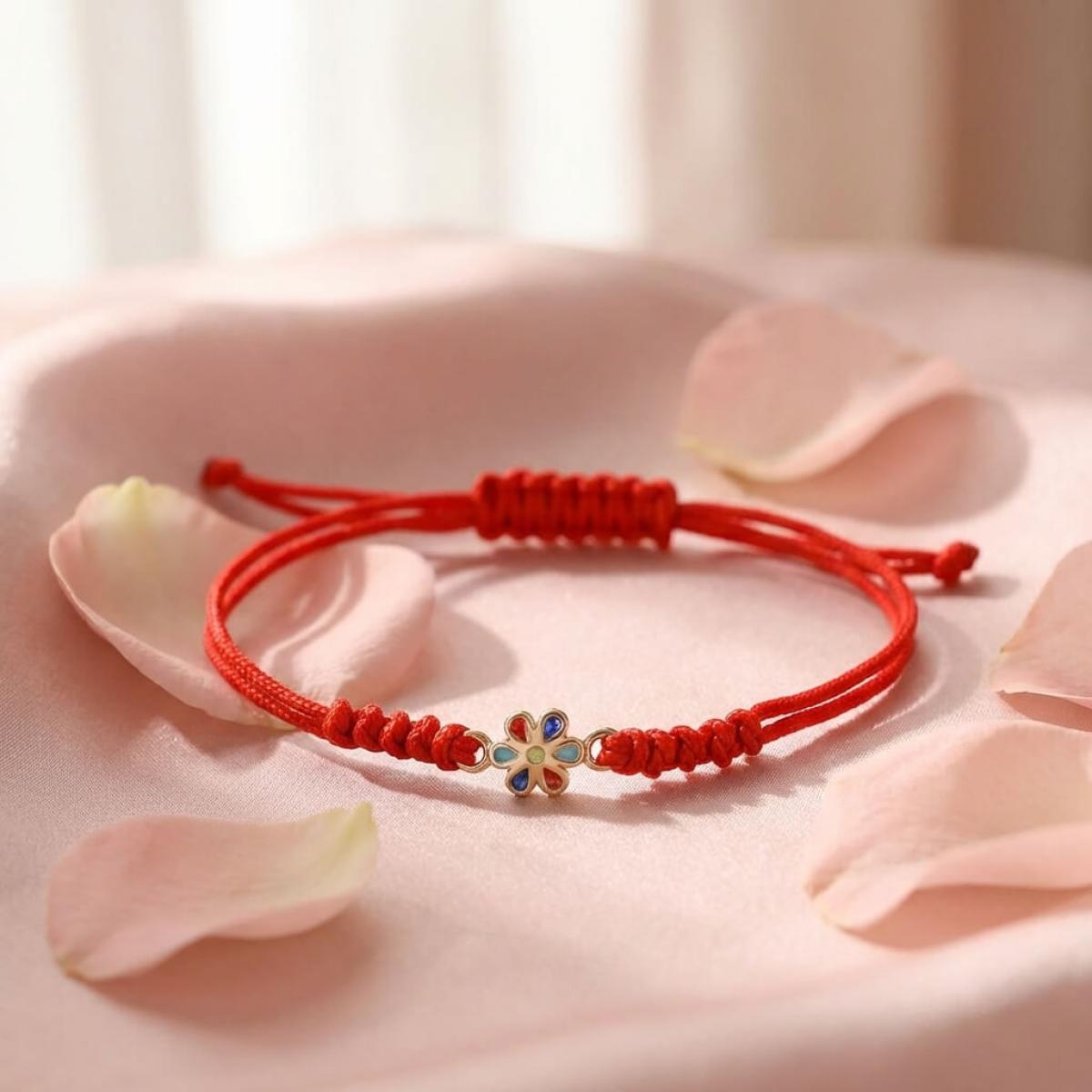 Гривна с червен конец и златен елемент цвете