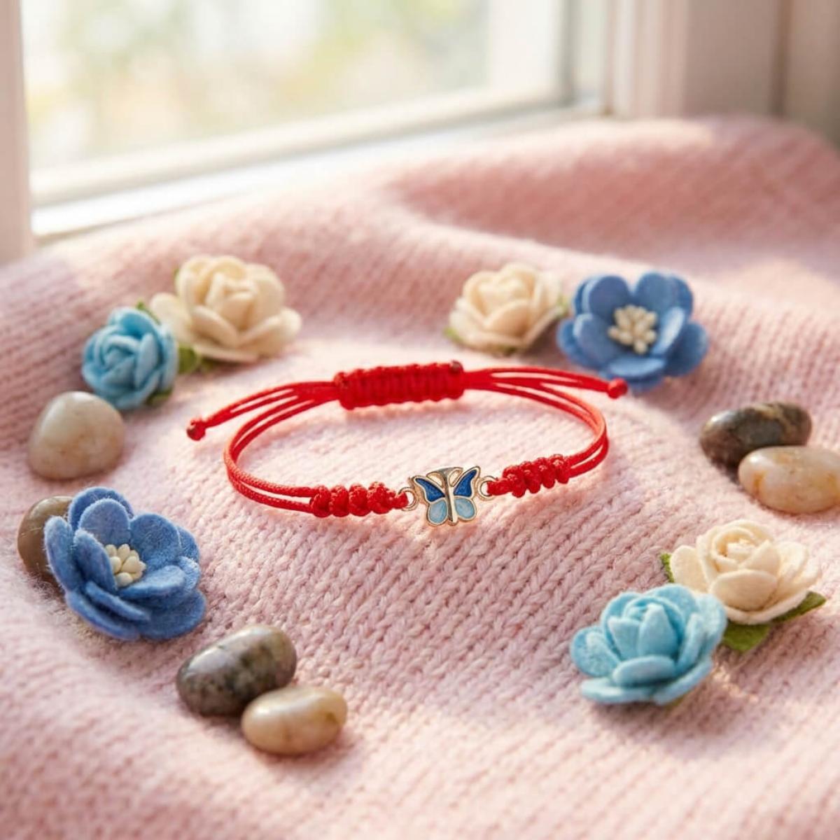 Още в древността майките са връзвали червени конци на ръцете на децата си, за да ги предпазят от злите невидими сили и от магьосническите способности на определени жени. И в наши дни се спазва ритуалът на новородените и техните майки да се поставя такава защита. Представеното тук бижу би могло да се възприема като двойна закрила, защото съдържа двата най-силни амулета, познати и у нас, и в арабския свят – червен конец със синьо око.