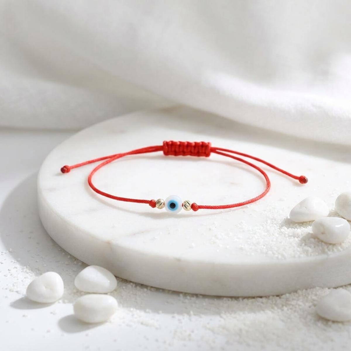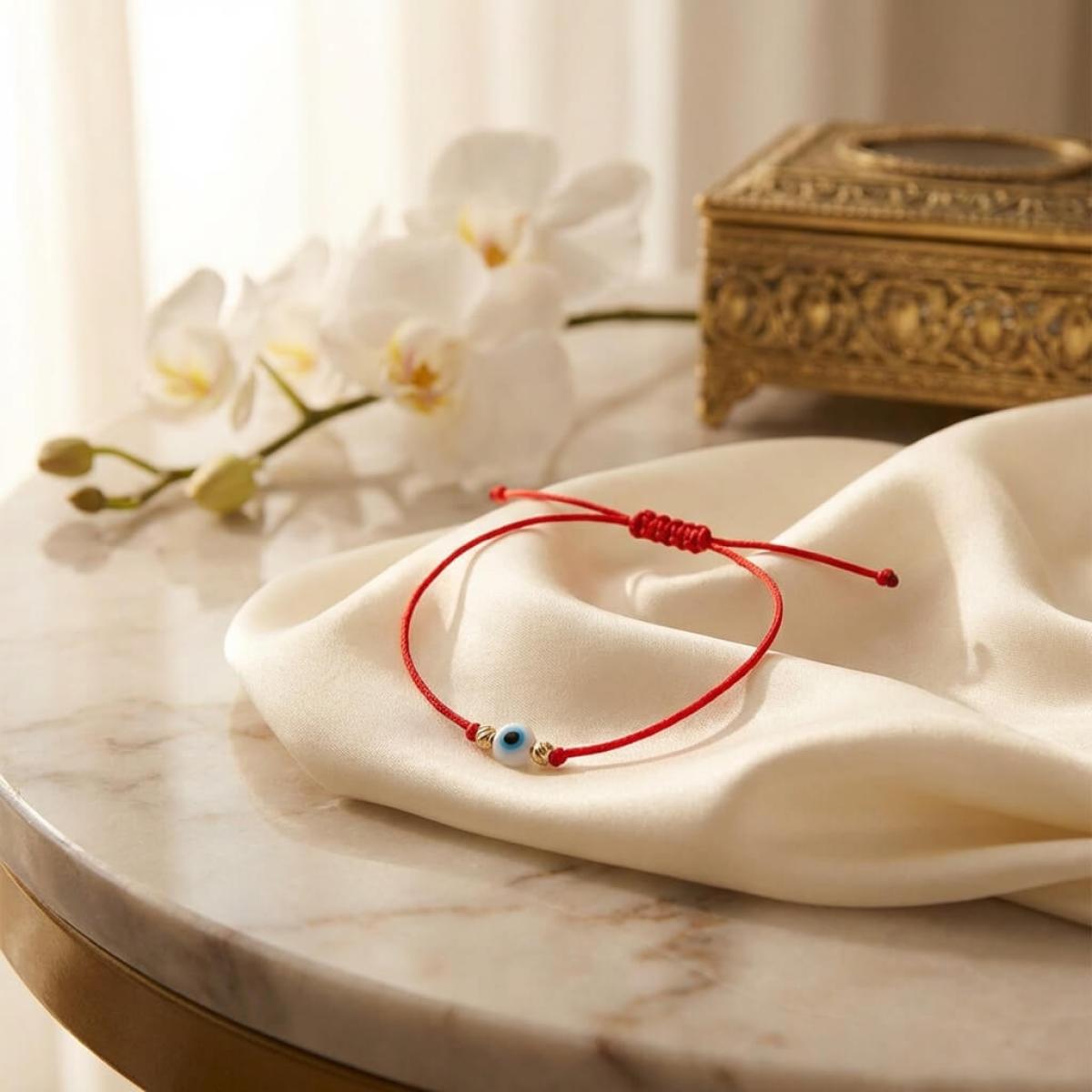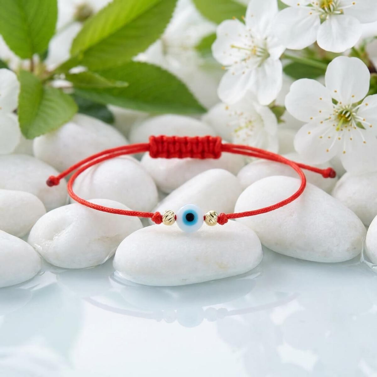 Гривна с червен конец, златни топчета и синьо око