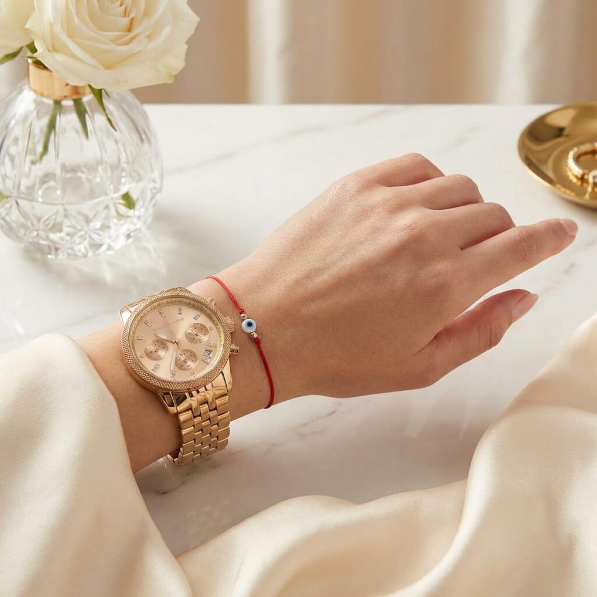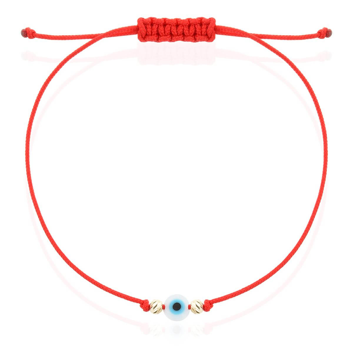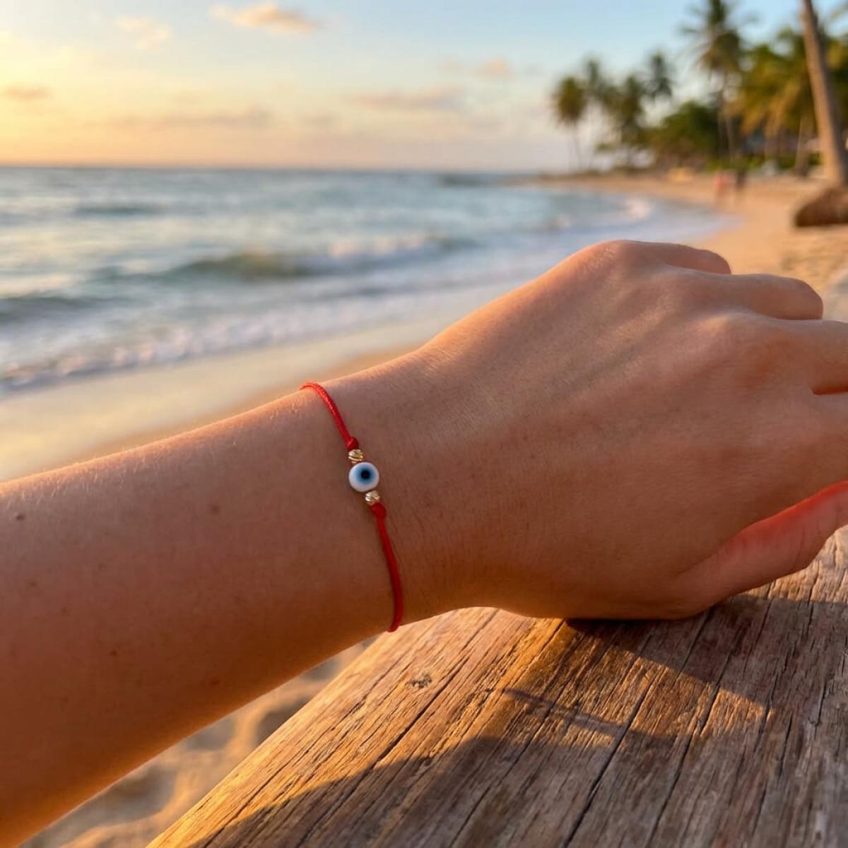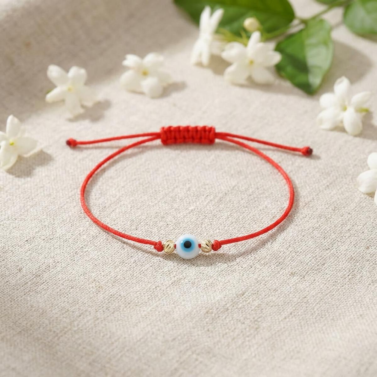 Гривна с червен конец, златни топчета и синьо око