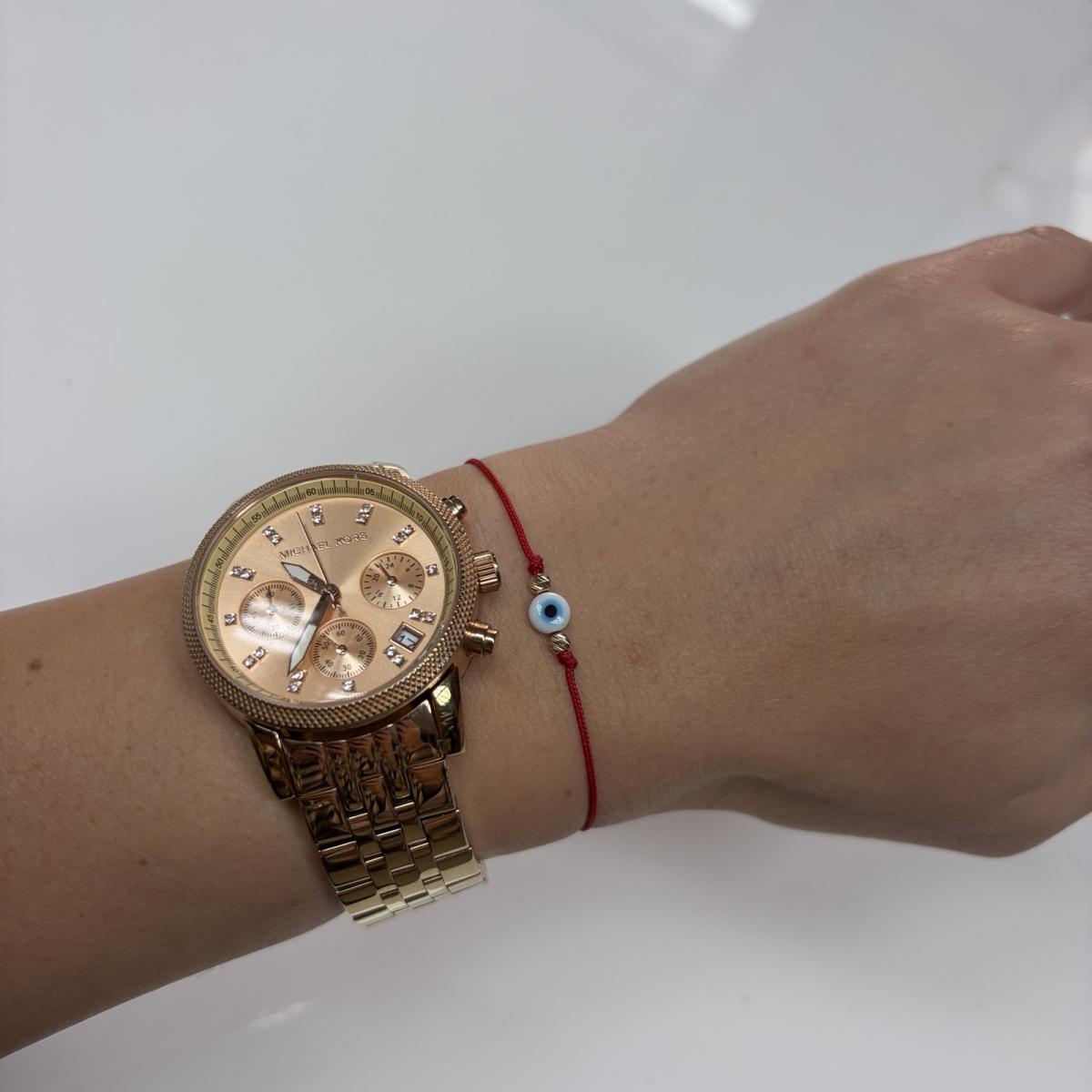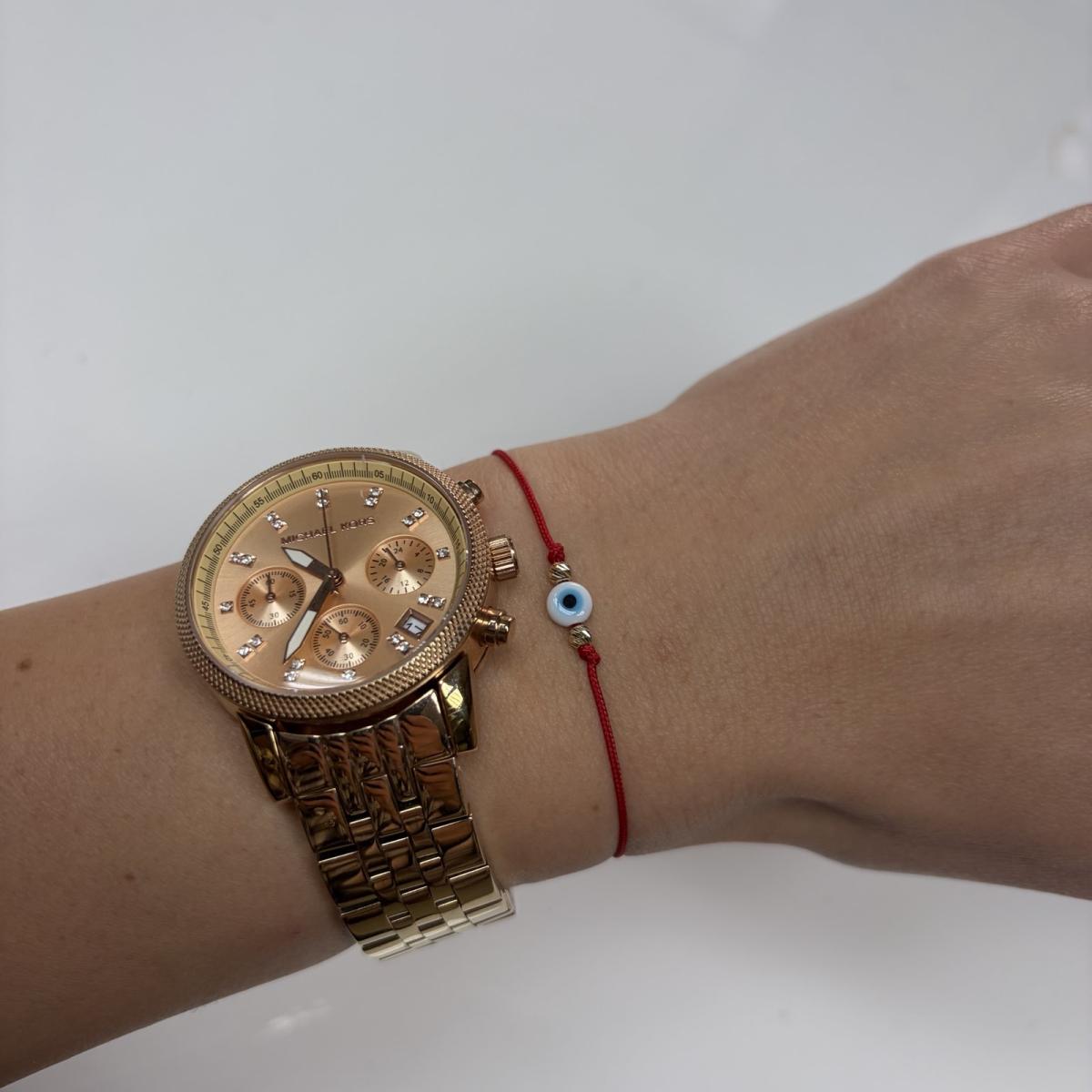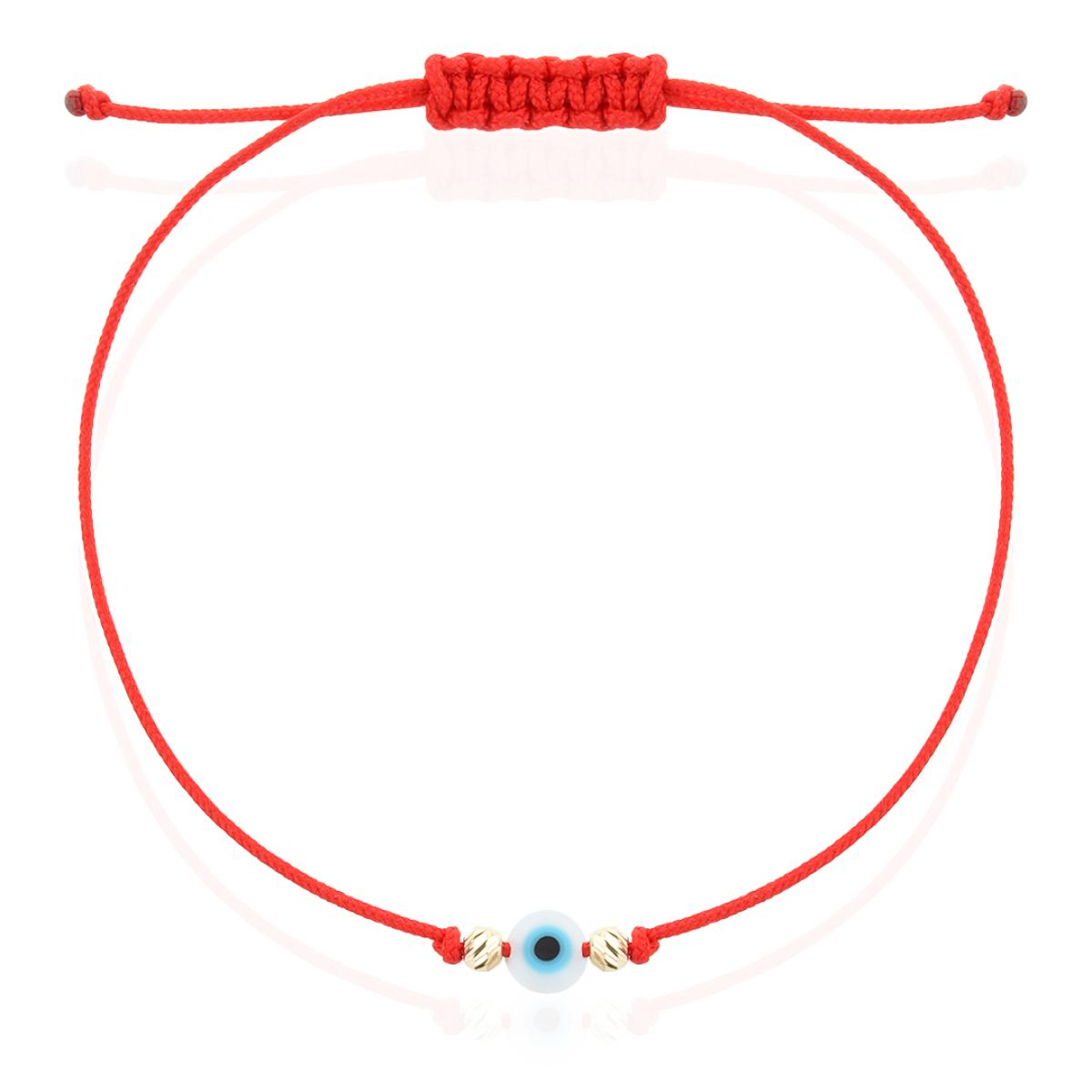 Тази стилна гривна на червен конец съчетава в себе си силата на традицията и модерната елегантност. Синият елемент "око" е древен символ за защита от зли очи и негативна енергия, а фините златни топчета (14 карата злато) придават лукс и изящество.