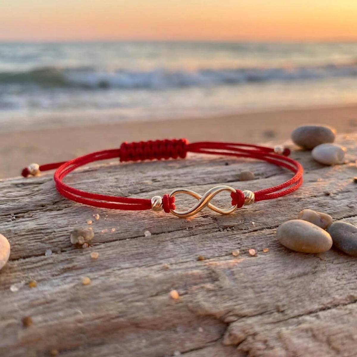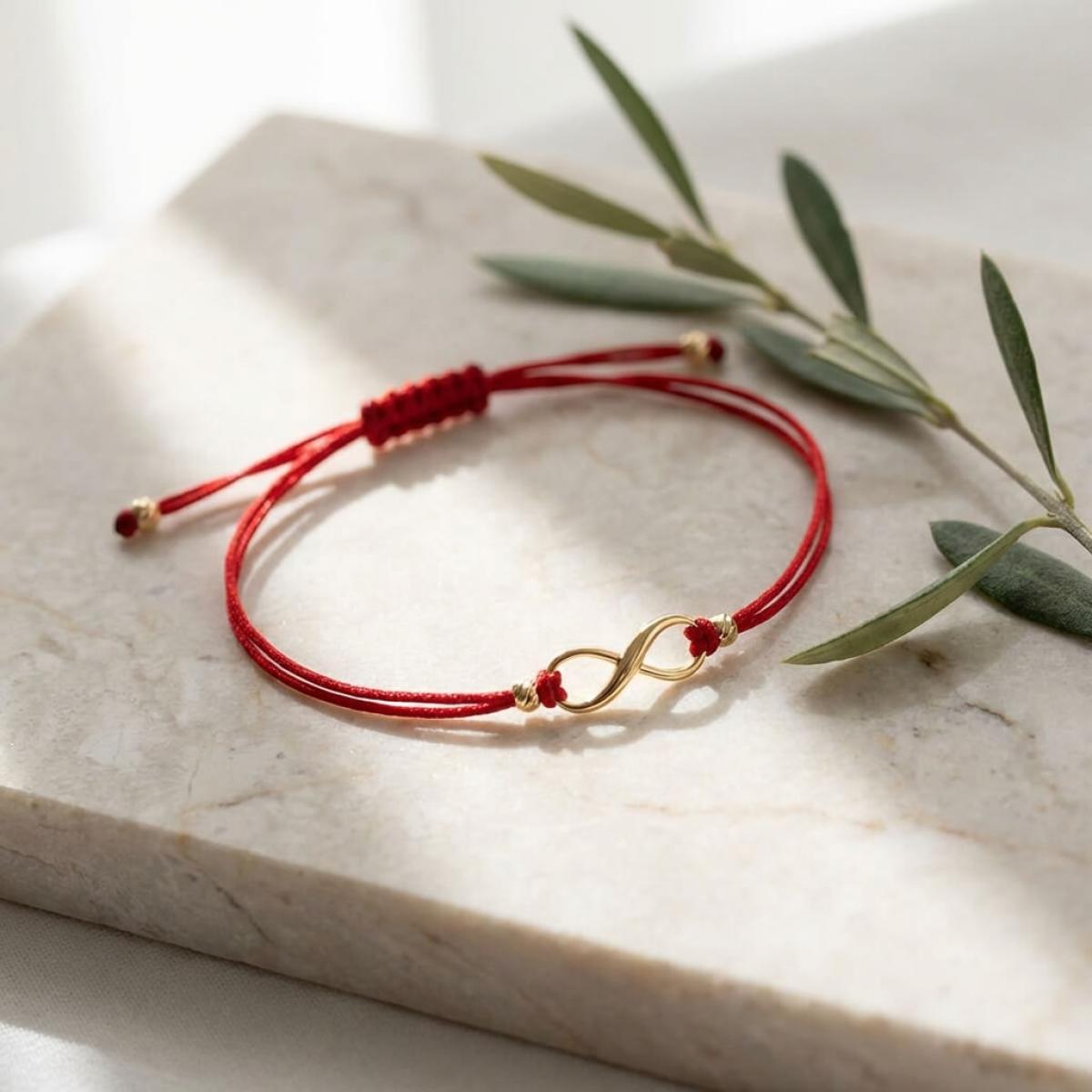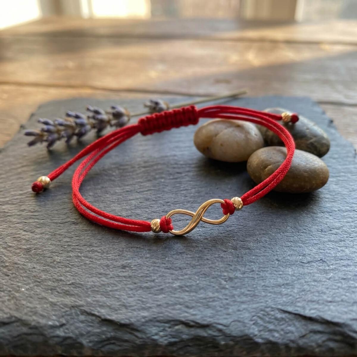 Гривна с червен конец и 14 карата златен елемент безкрайност