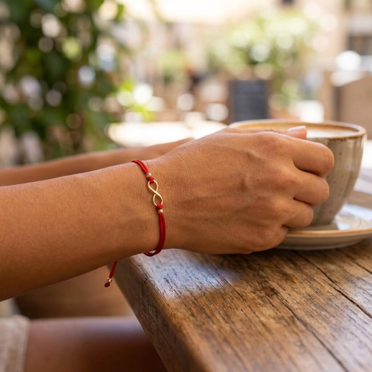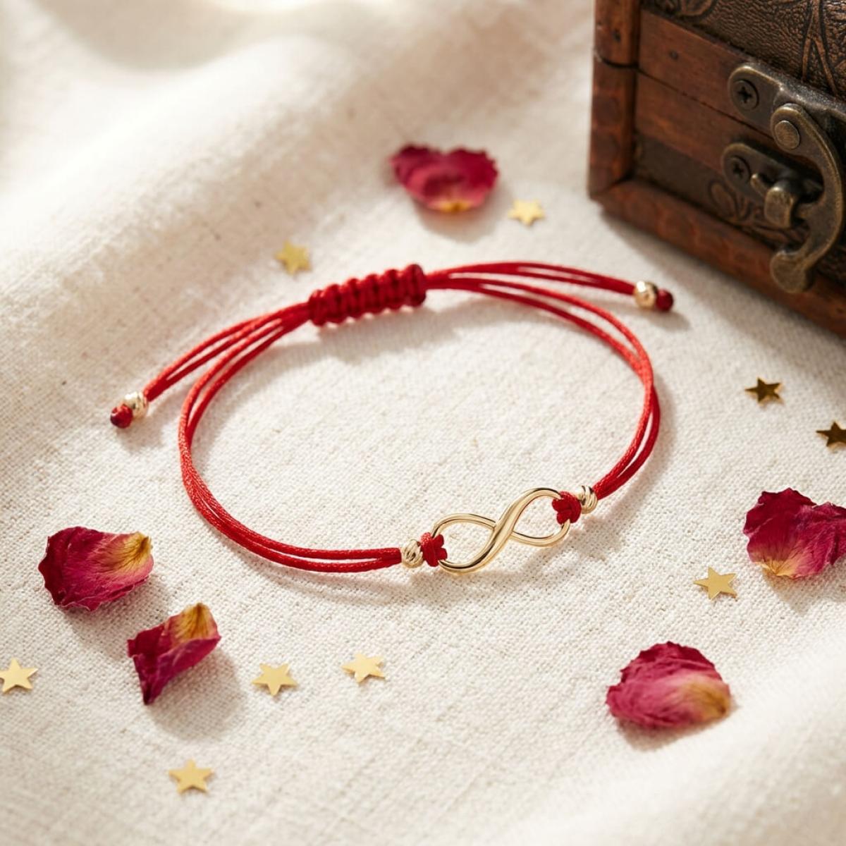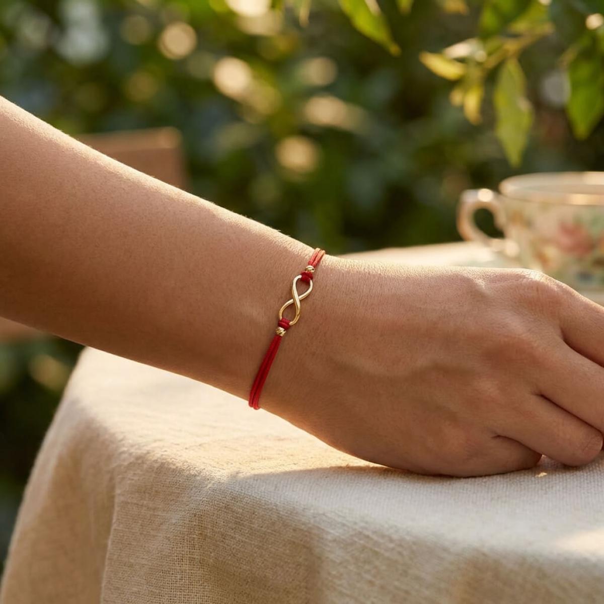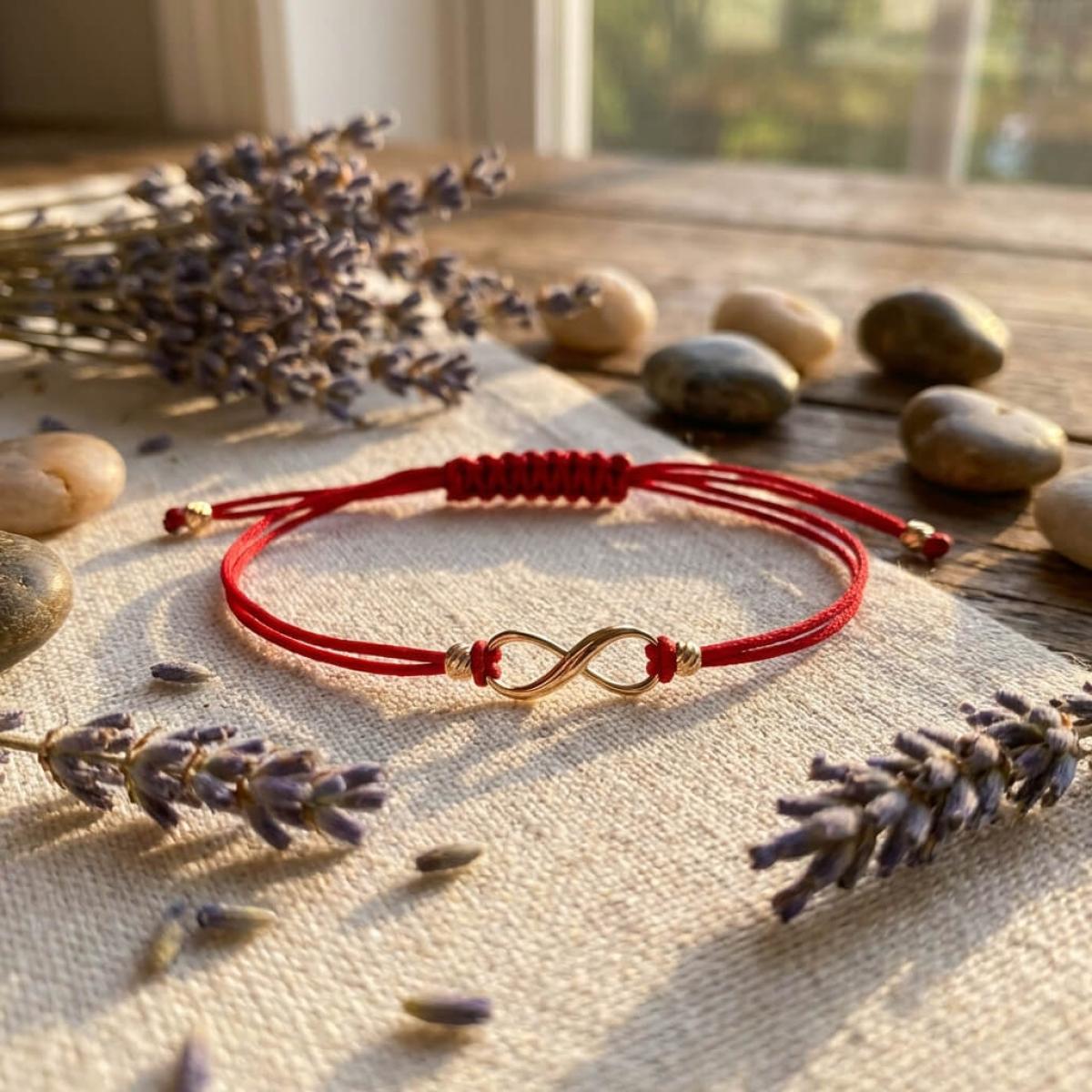 Гривна с червен конец и 14 карата златен елемент безкрайност