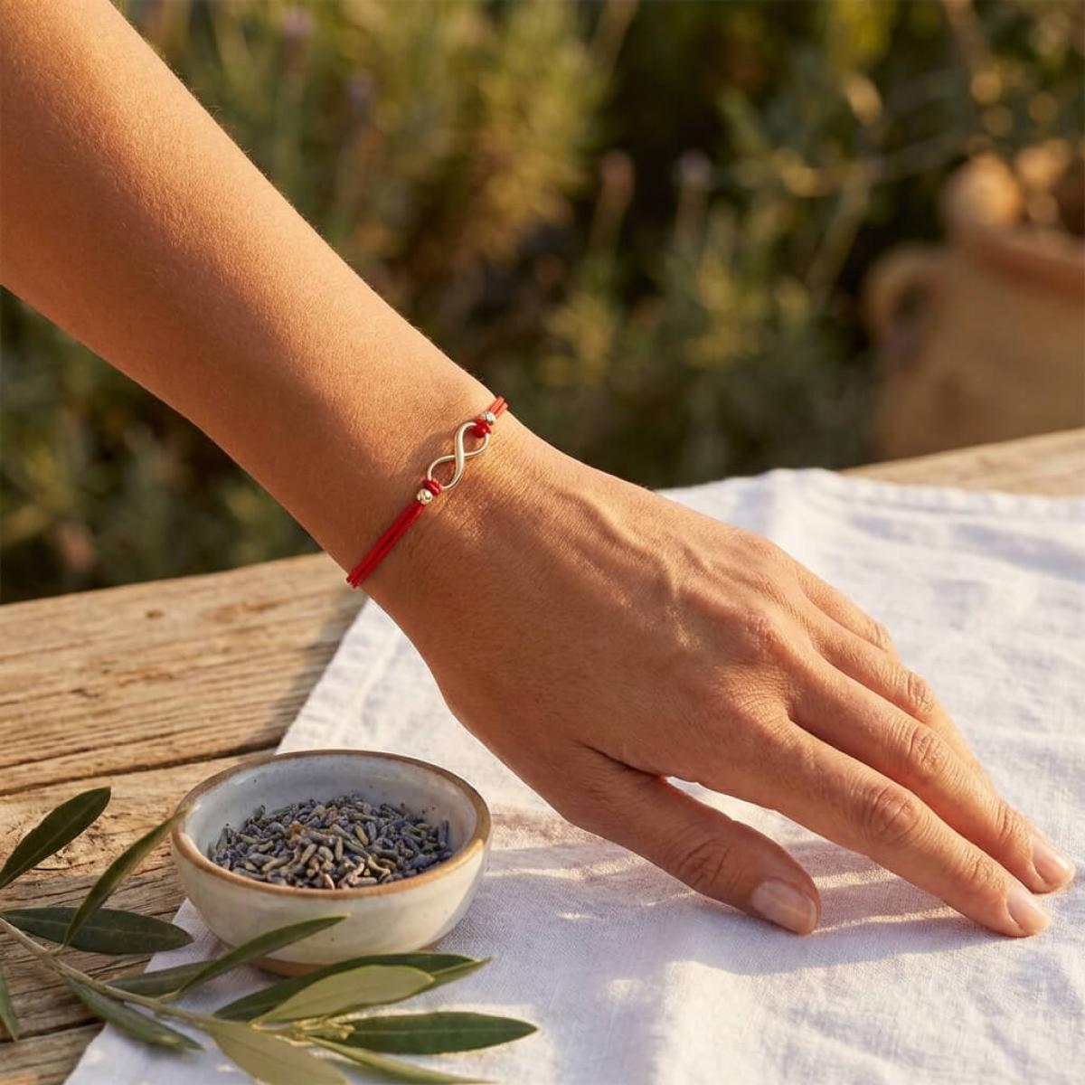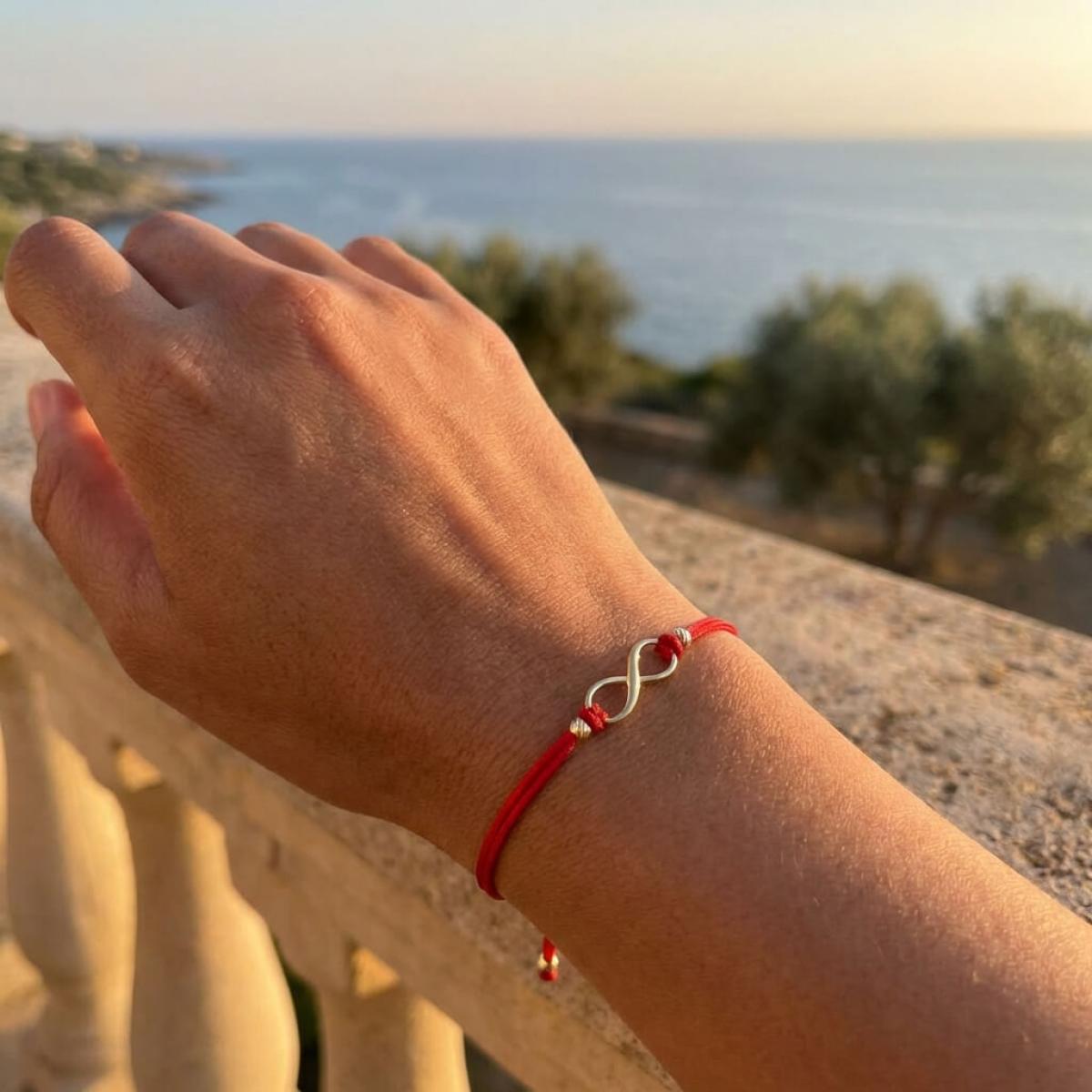 Той символизира движението, развитието, мъдростта, себеопознаването, щастието, късмета, безкрайната човешка енергия. Знакът за безкрайност е един от най-подходящите за комбинация в бижута с червен конец, заради близката и допълваща се символика.
