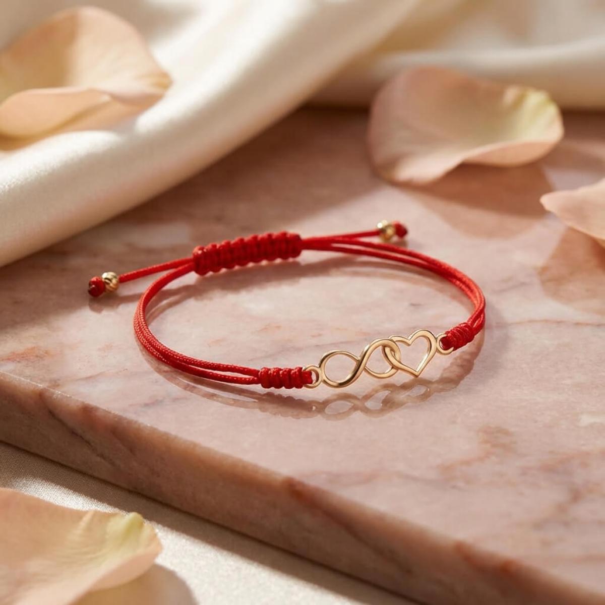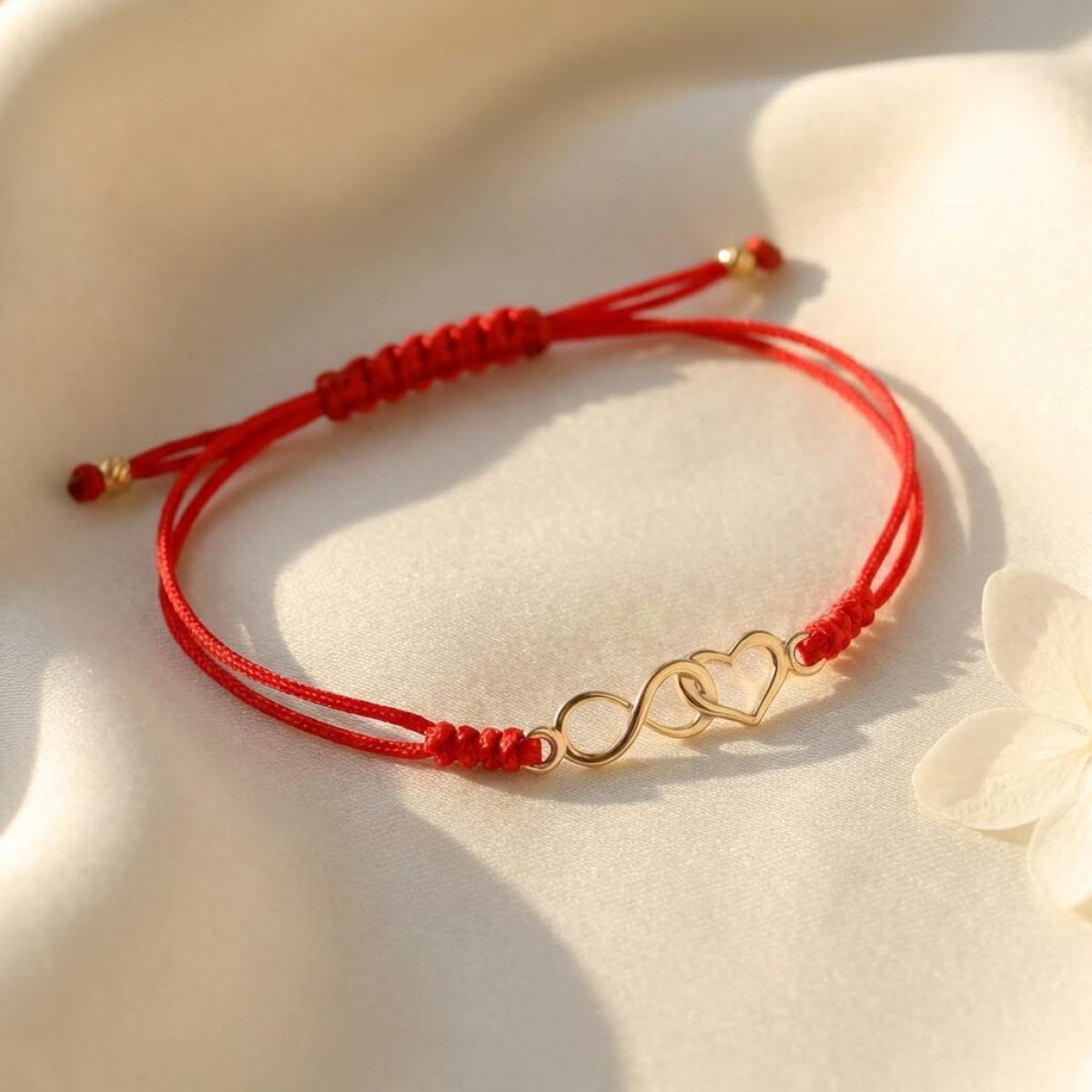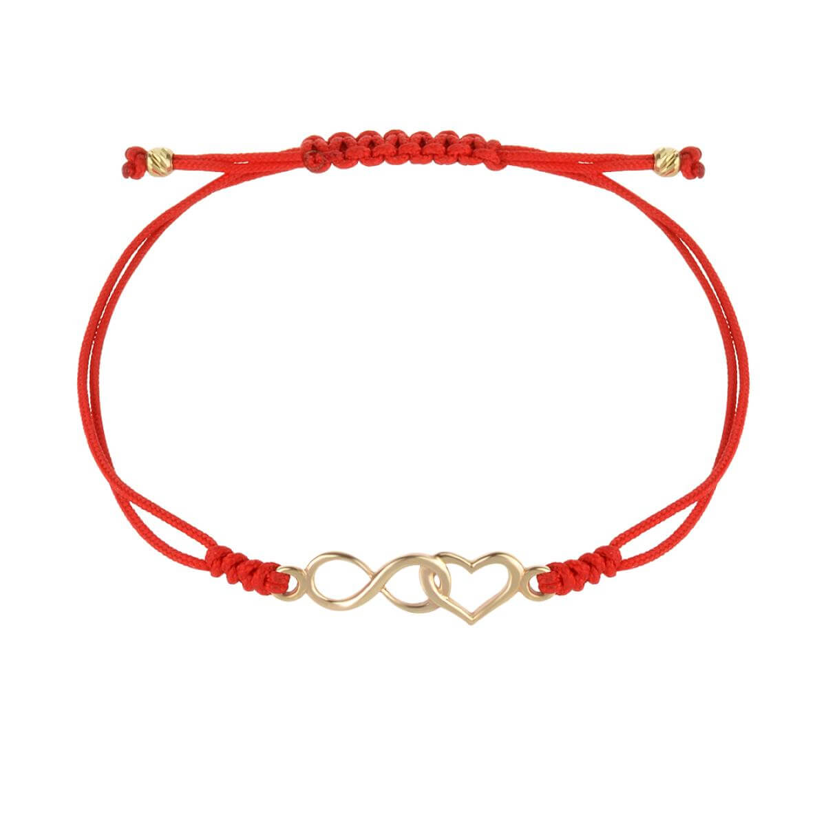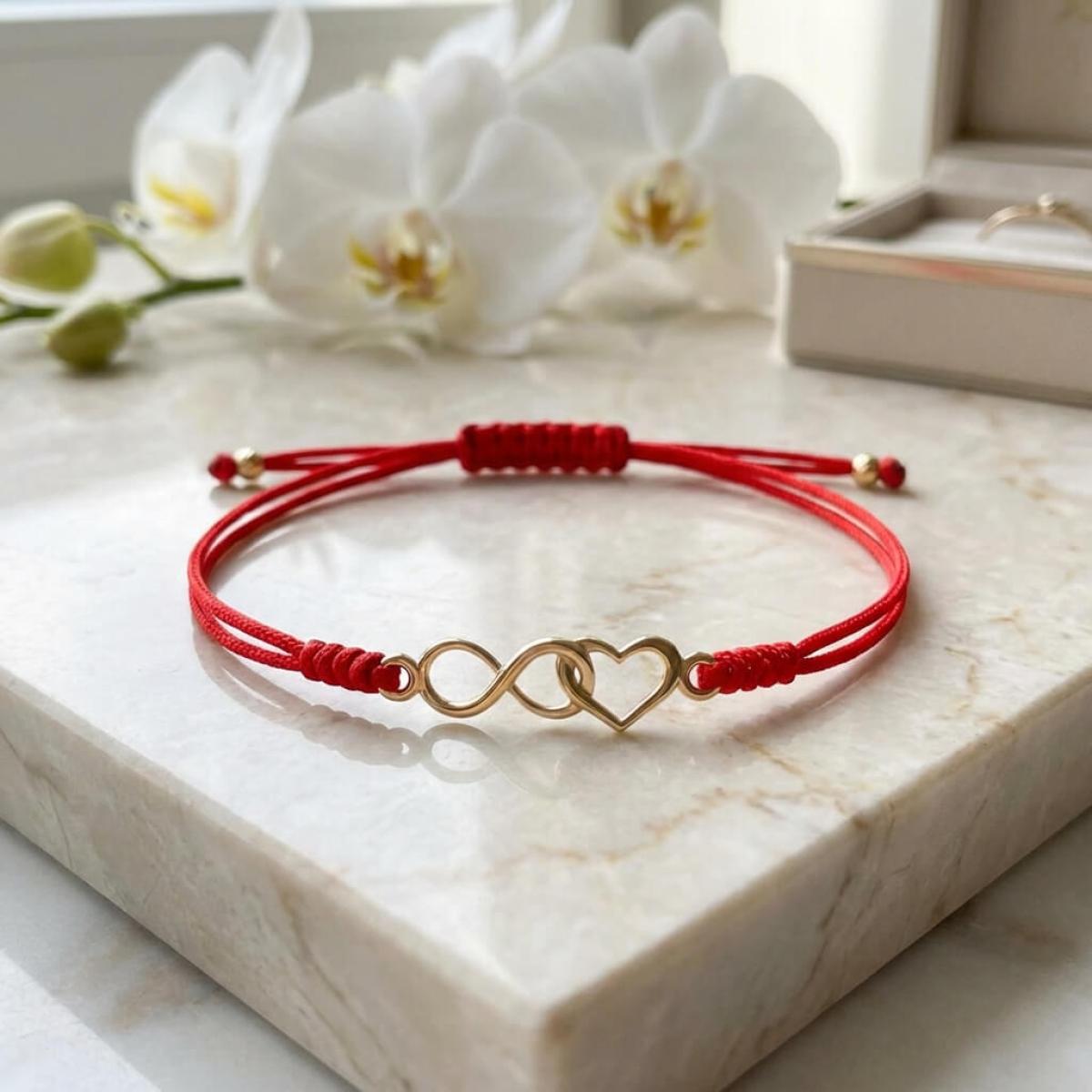 Гривна с червен конец и 14 карата златен елемент безкрайност и сърце