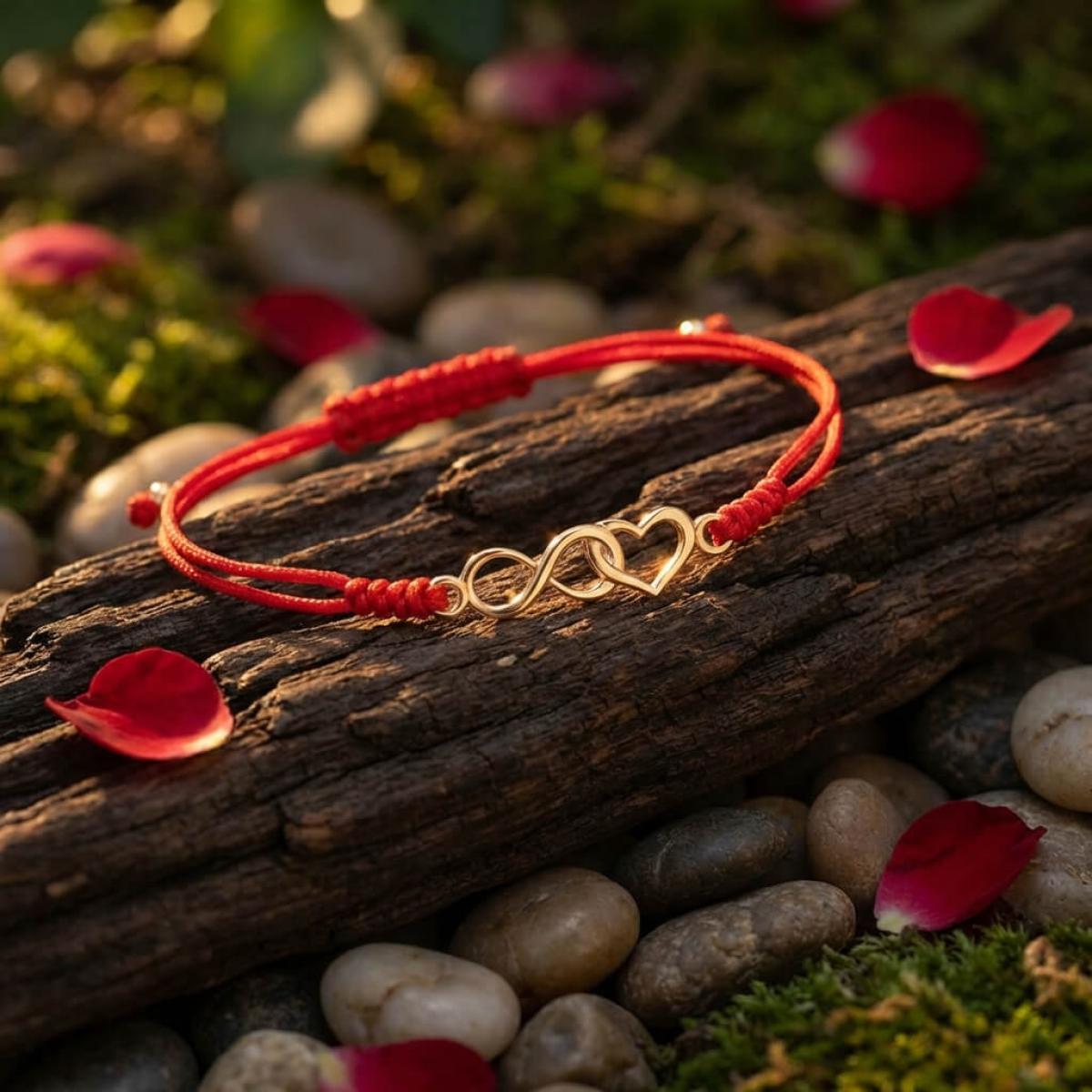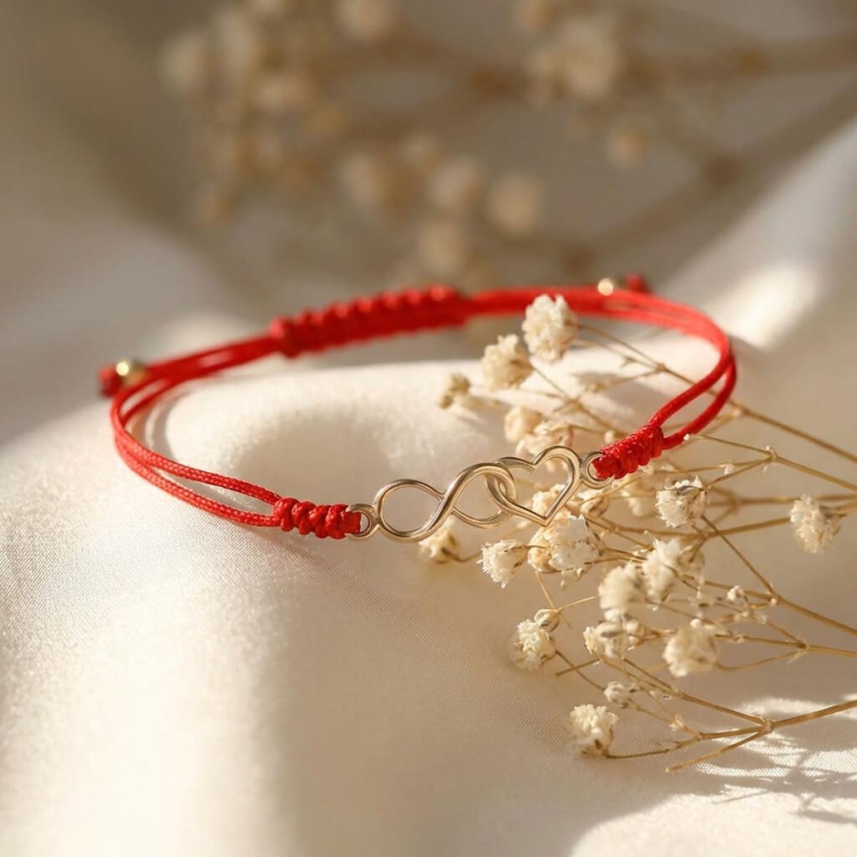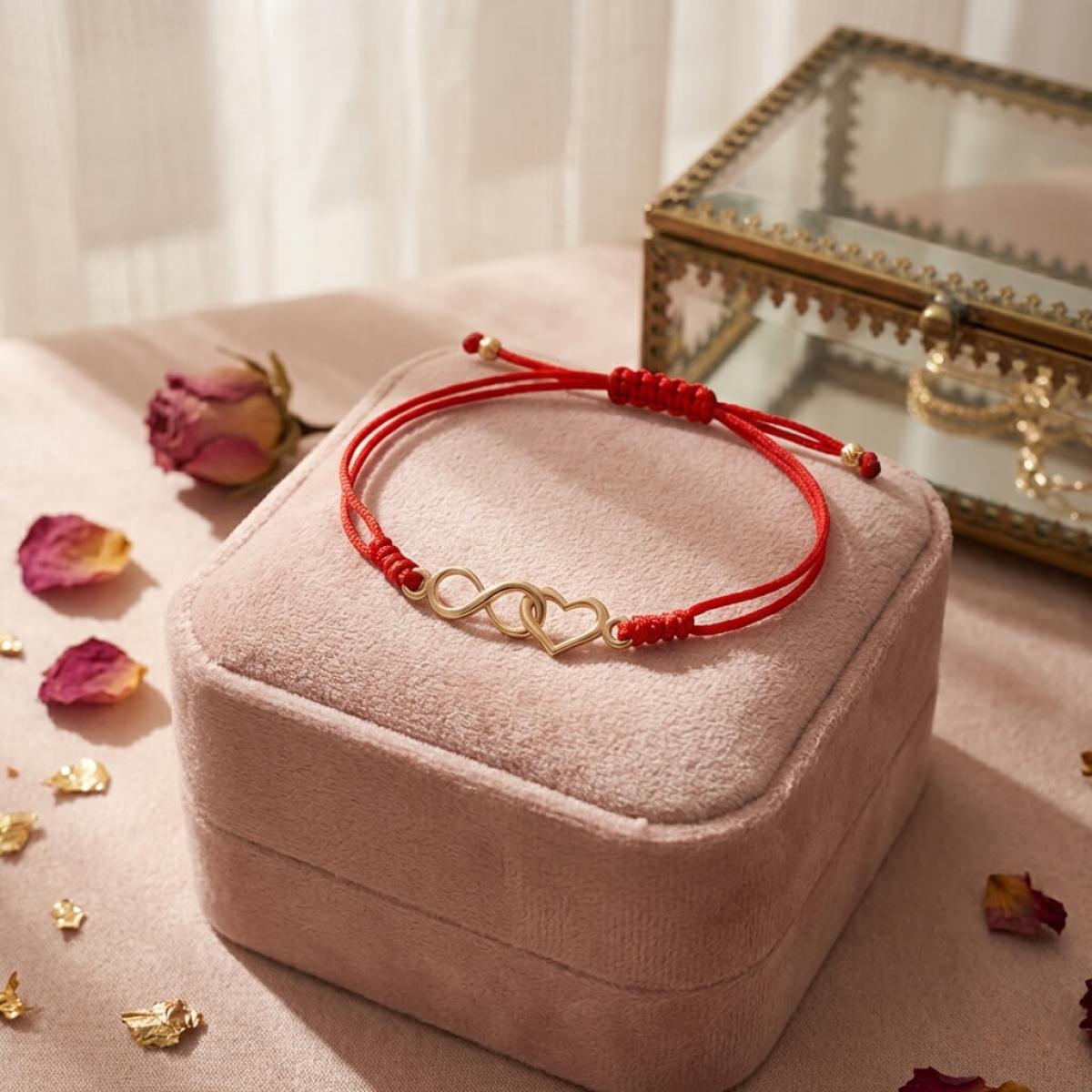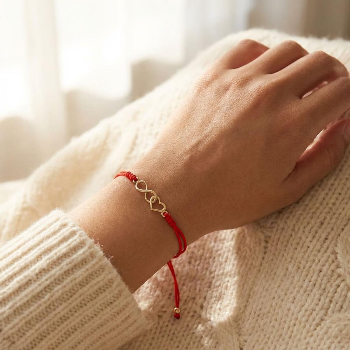 Гривна с червен конец и 14 карата златен елемент безкрайност и сърце