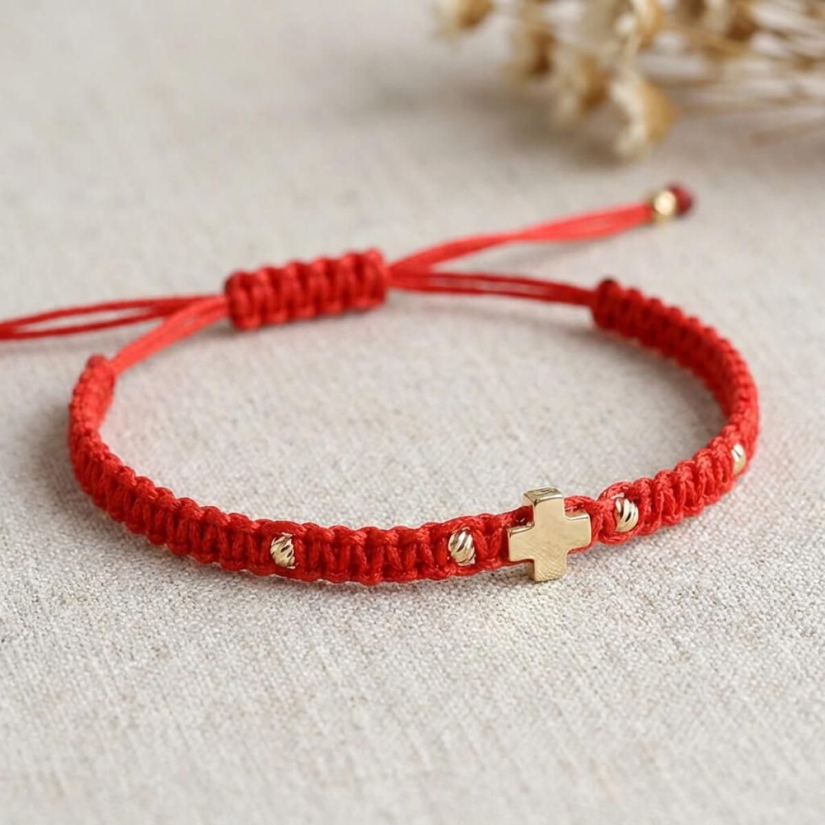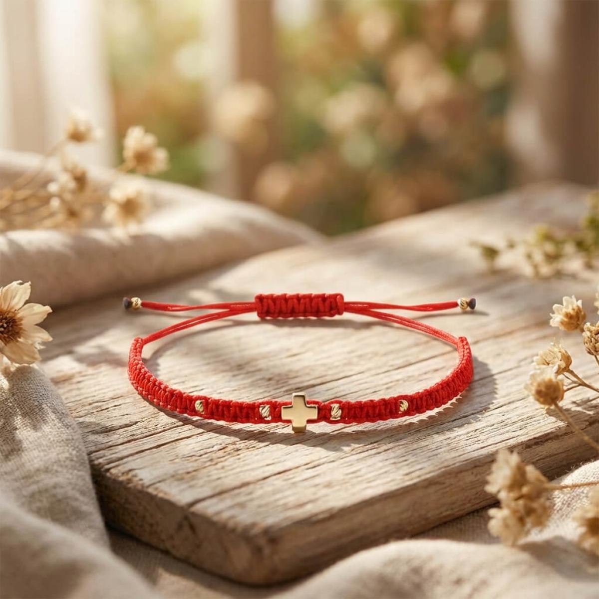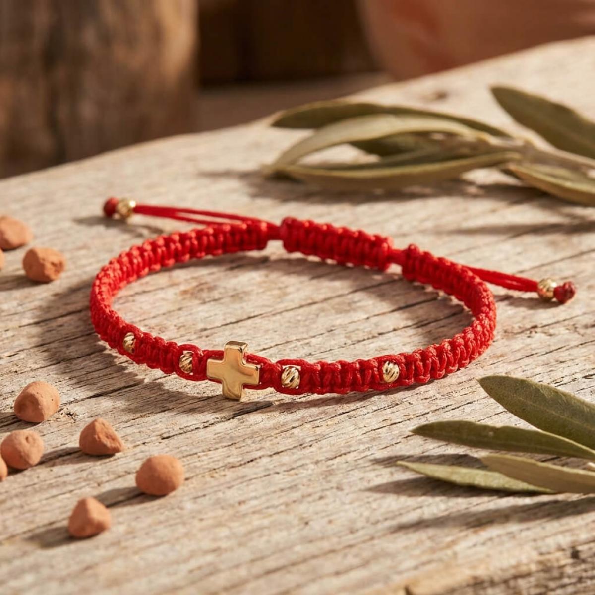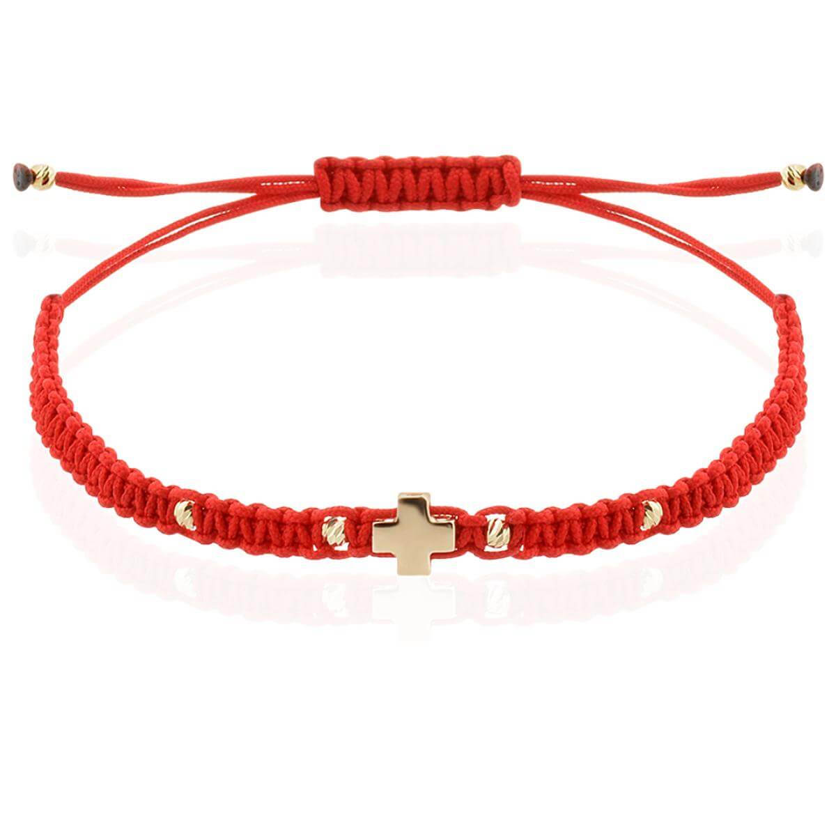 Гривна с червен конец и 14 карата златен елемент кръст B54CZ
