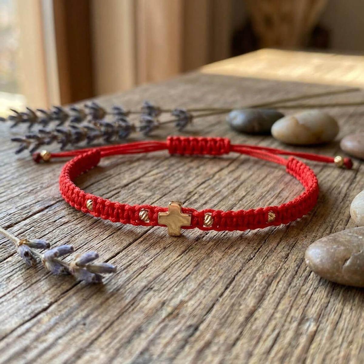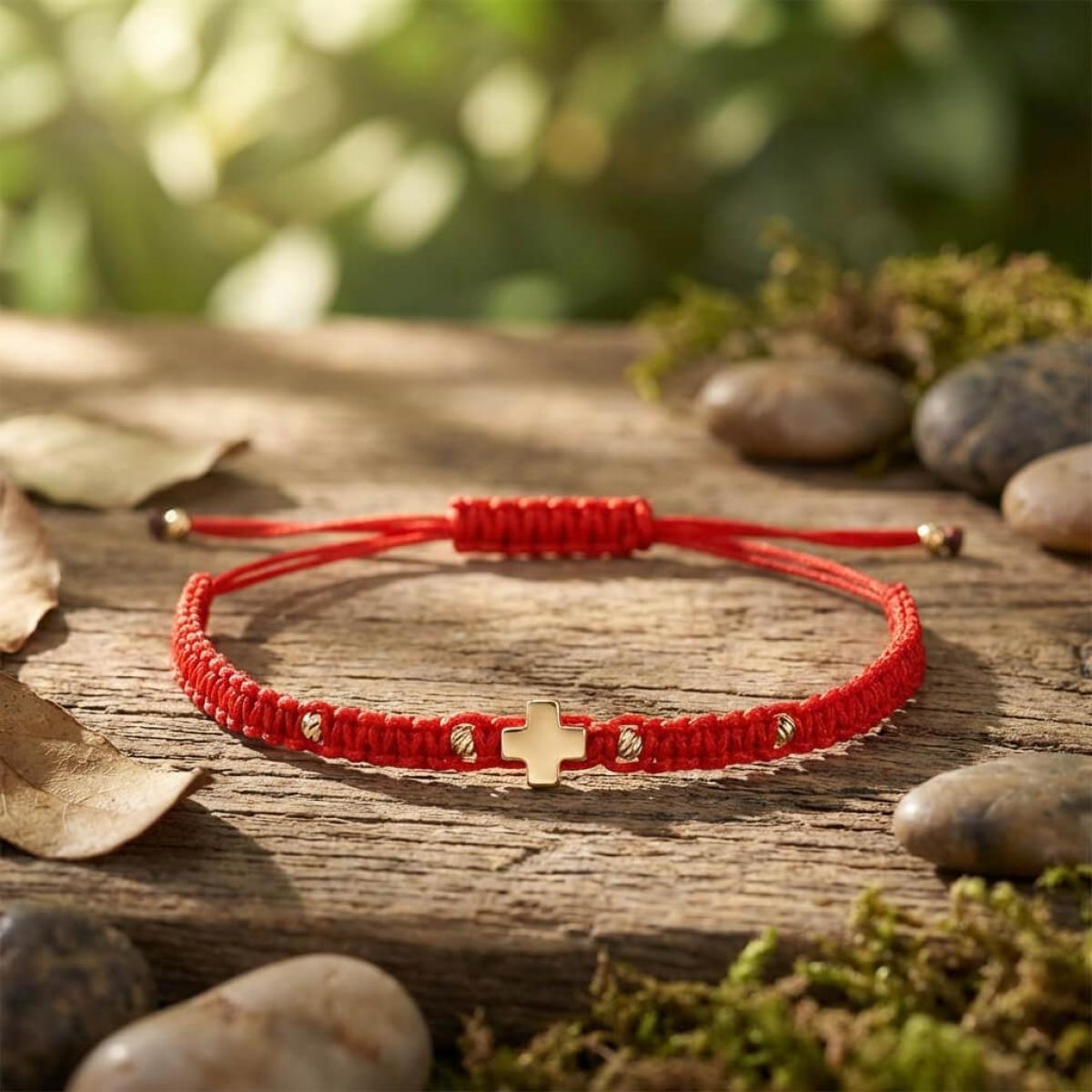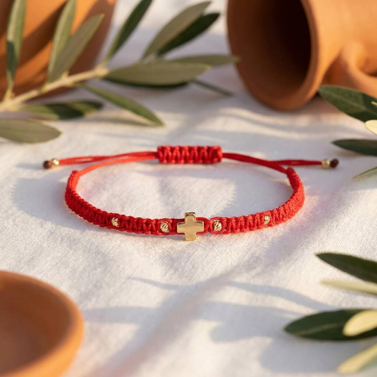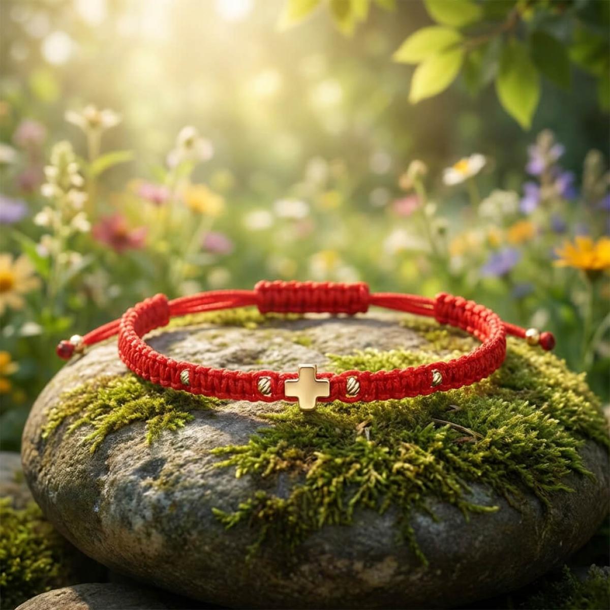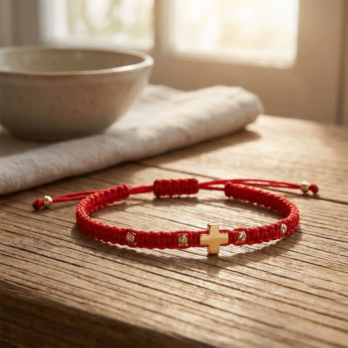 Гривна с червен конец и 14 карата златен елемент кръст B54CZ