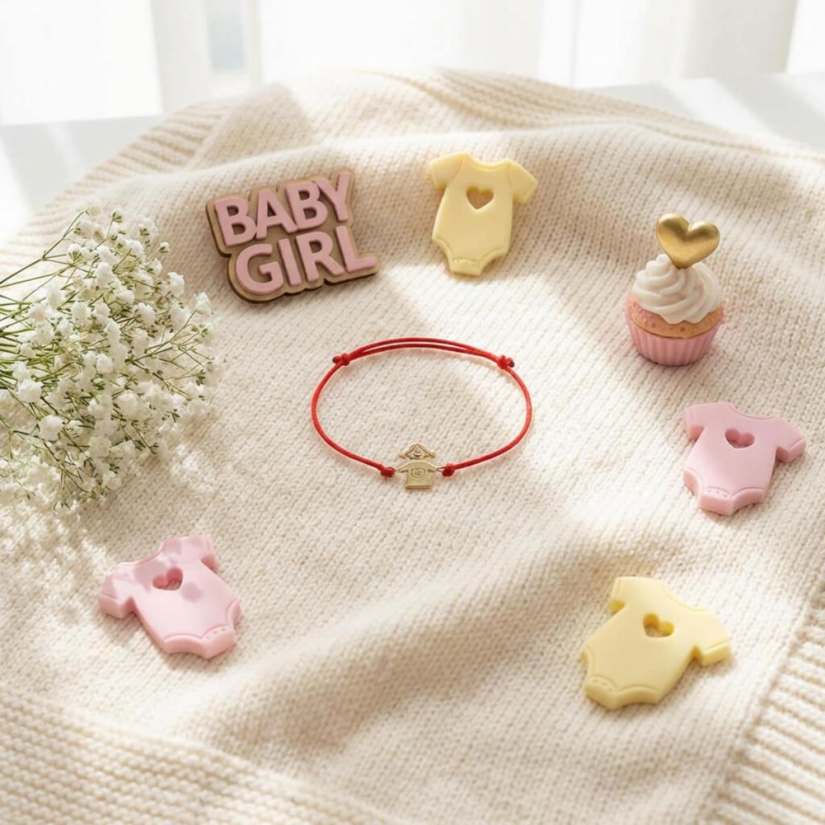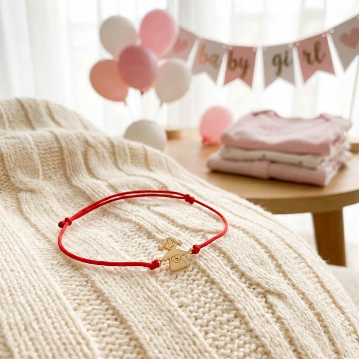 Конецът в червено защитава от лоши очи – така нареченото урочасване. Към подобно енергийно вмешателство най-уязвими са малките деца и родилките, затова именно тях най-често можем да видим окичени с традиционния талисман. Конкретното бижу е с дизайн, съобразен с изключително важния повод – раждането на дете.