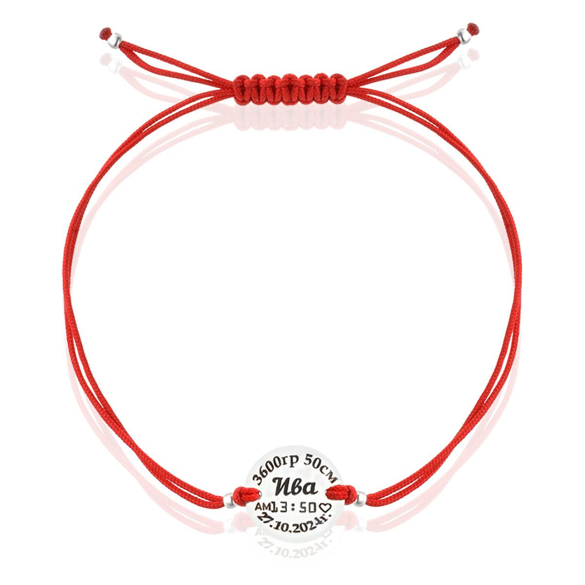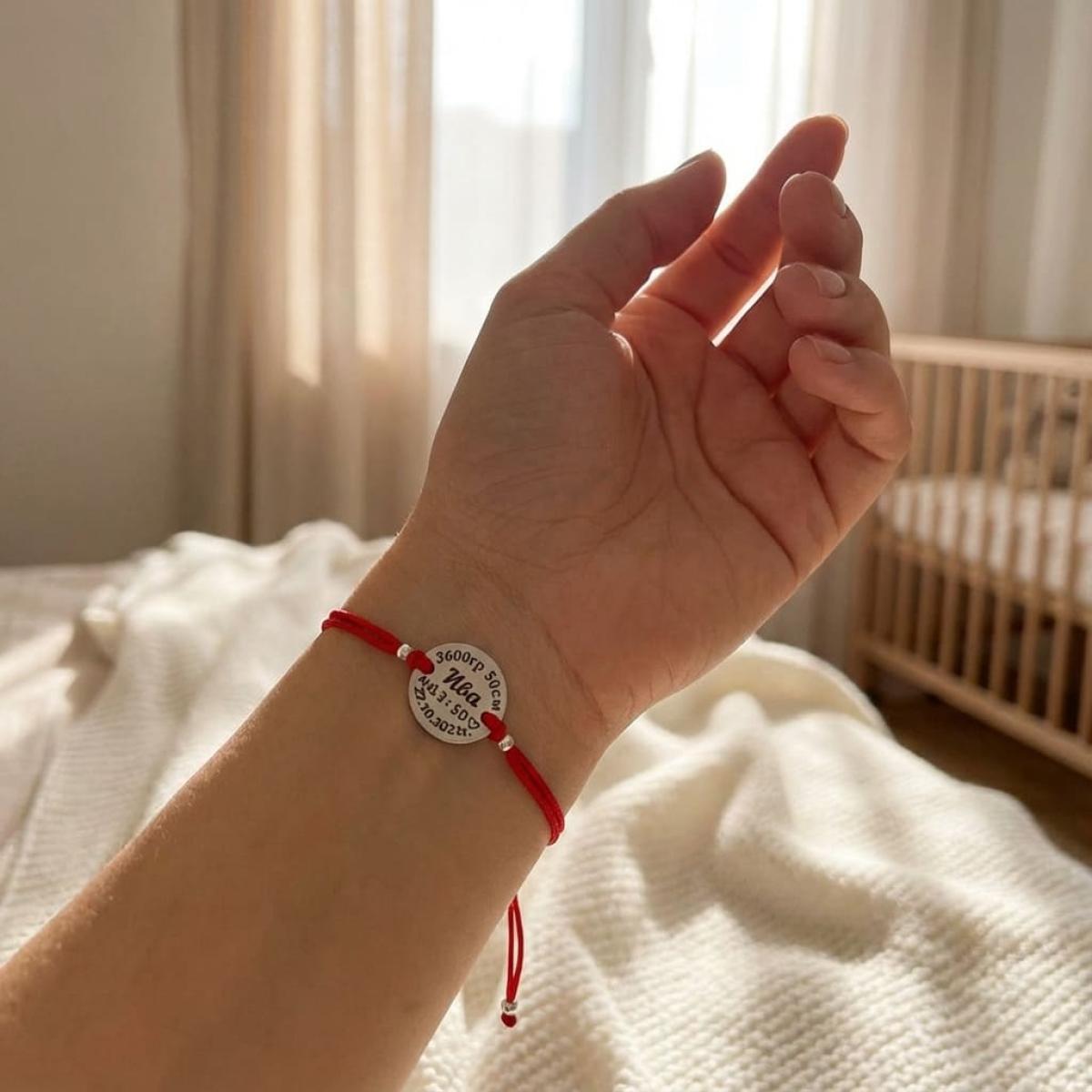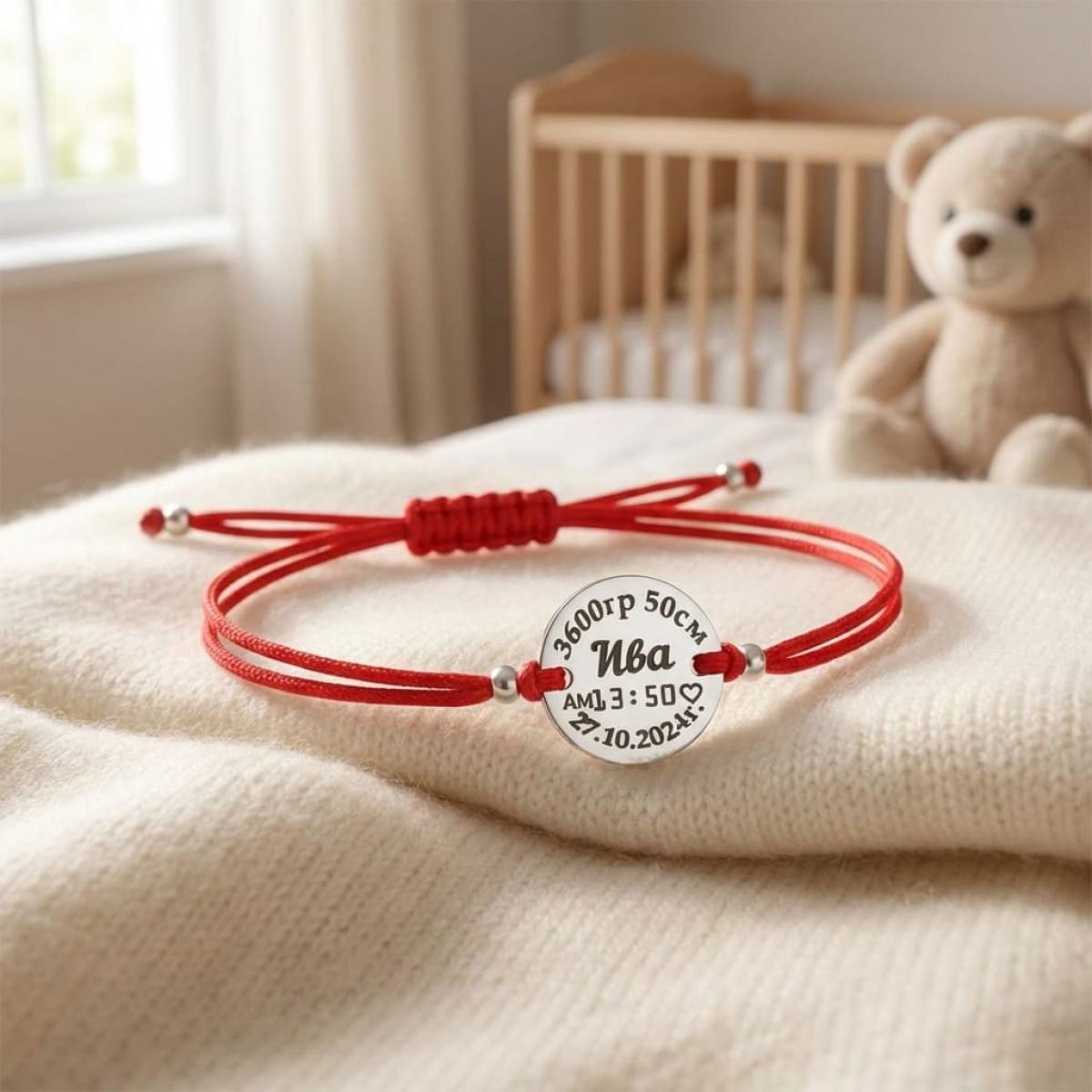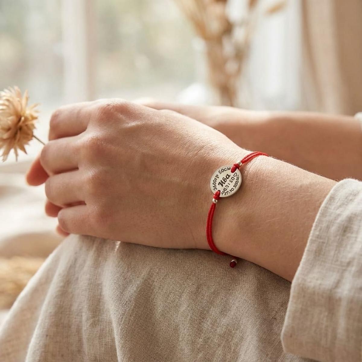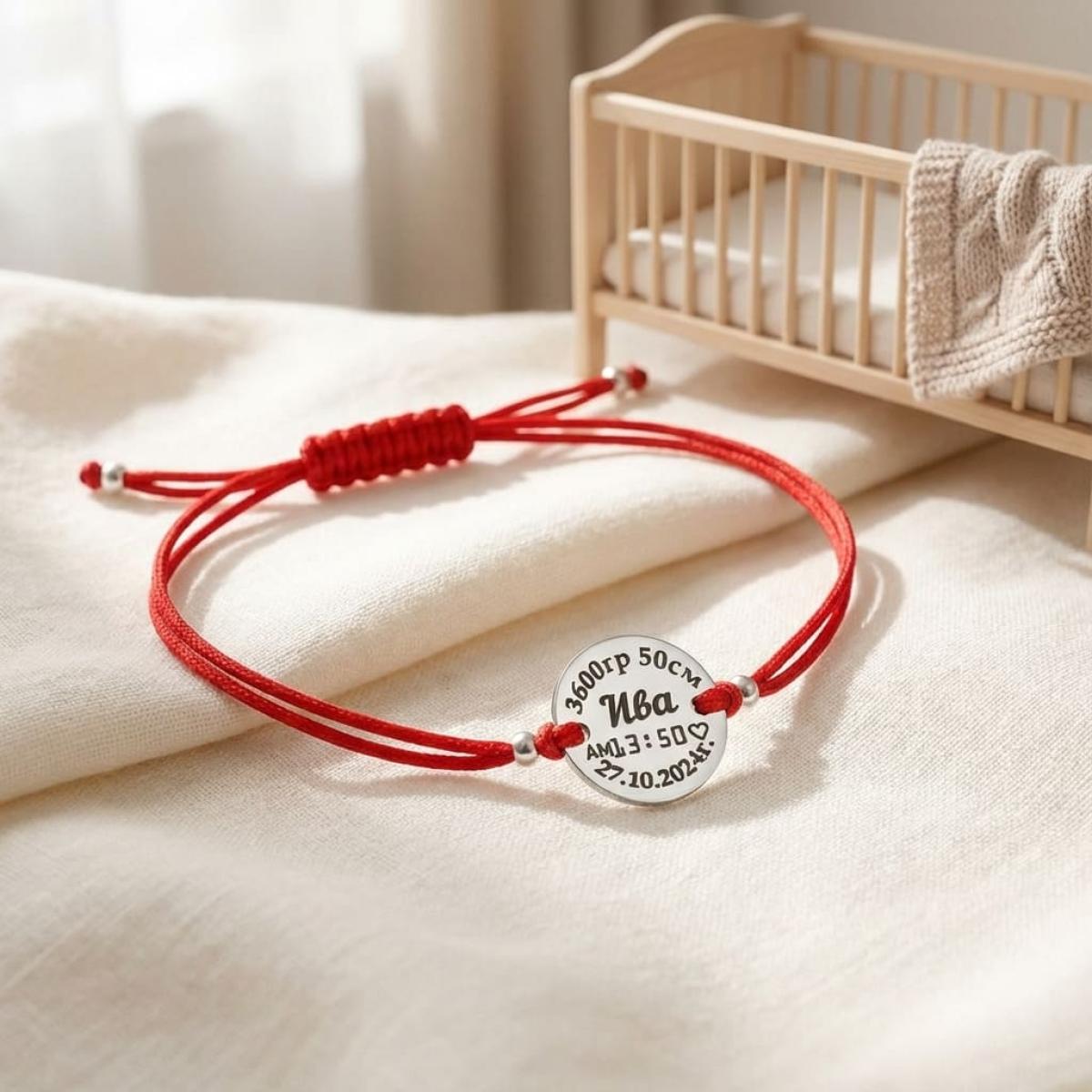 Гривна с червен конец и сребърен елемент с рождените данни на вашето бебе