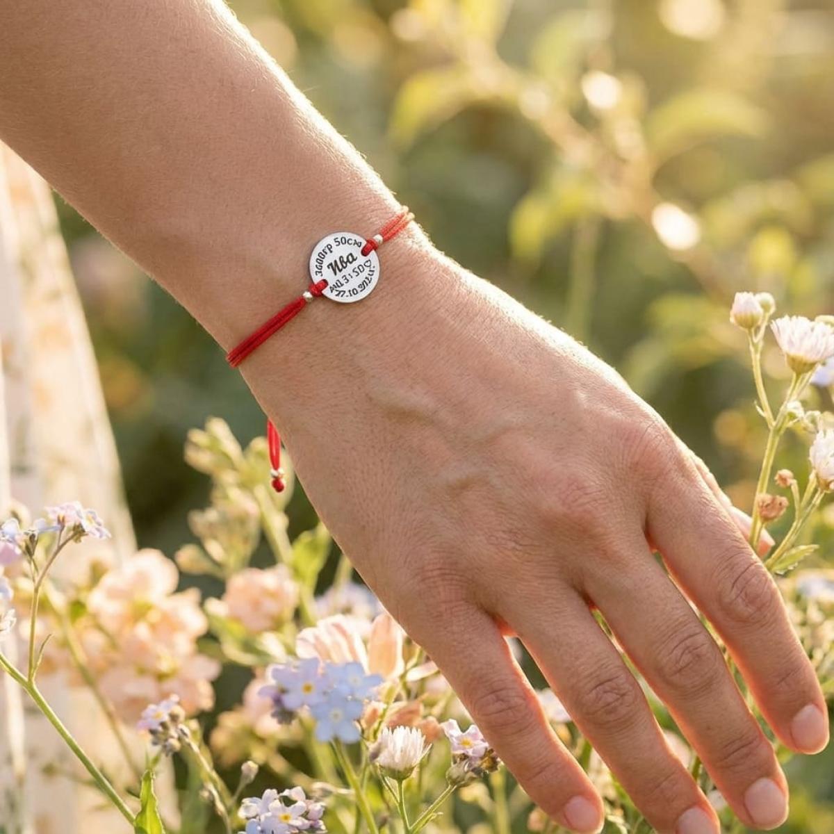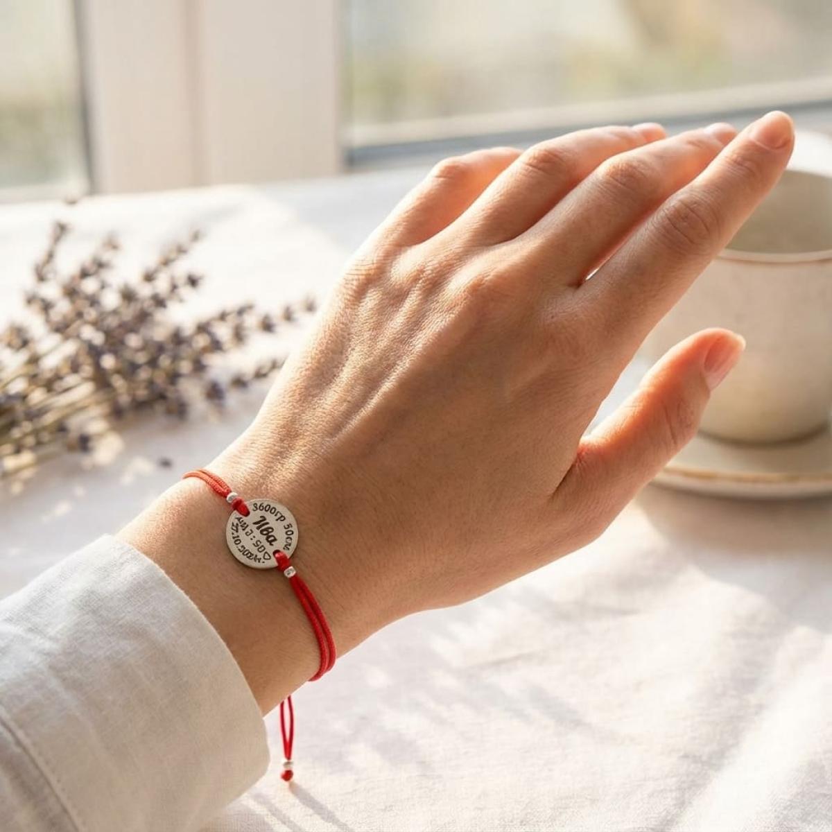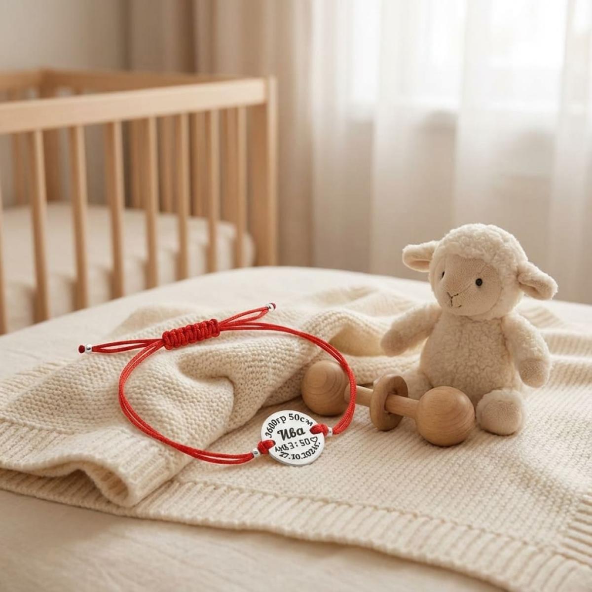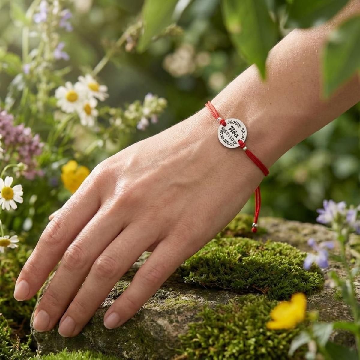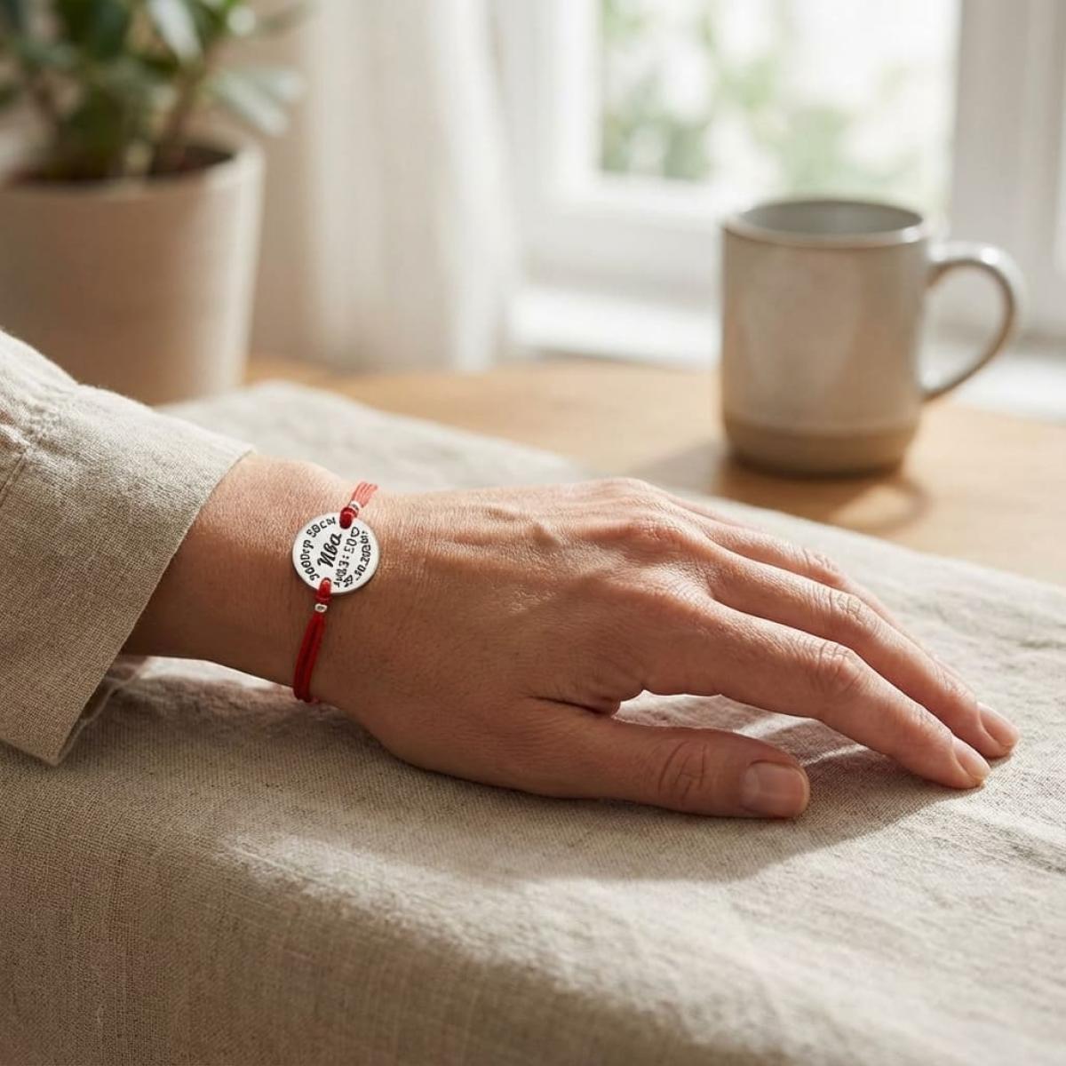 Гривна с червен конец и сребърен елемент с рождените данни на вашето бебе