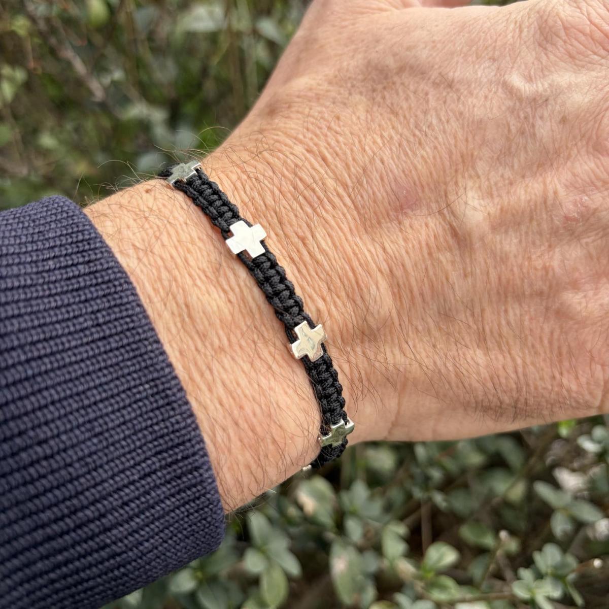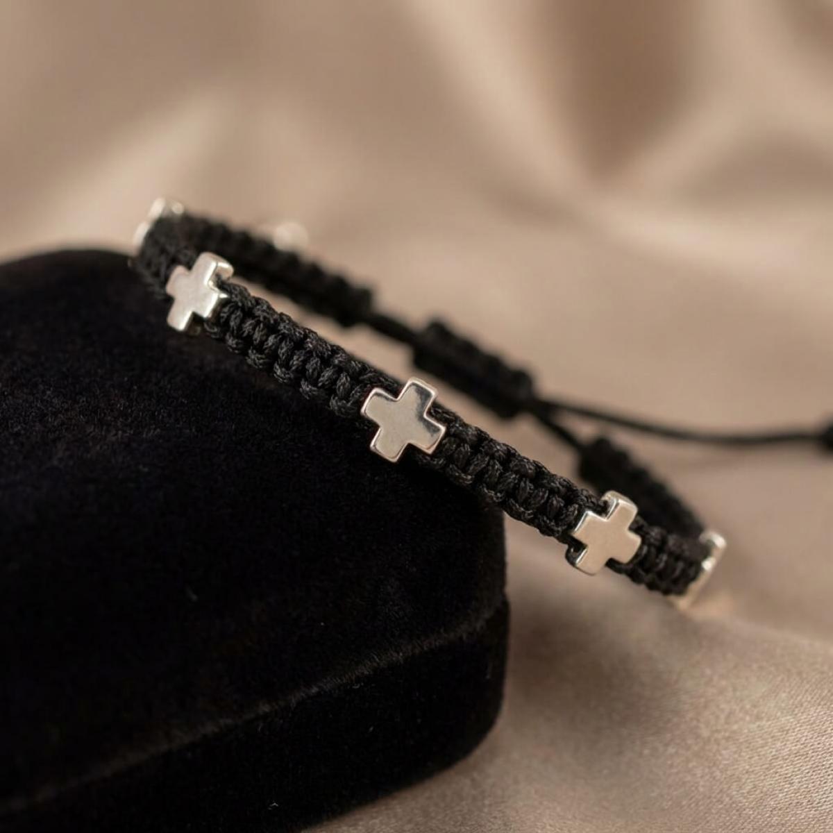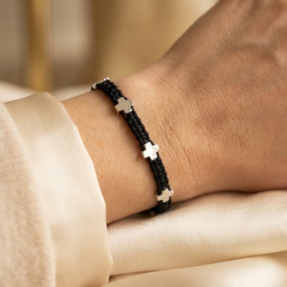 Нежна и стилна, тази гривна с конец и сребърни кръстове е перфектният аксесоар за всеки ден. Изработена е от висококачествен сребро 925, комбинирано с здрав и регулируем конец, който позволява прецизно напасване към всяка китка.