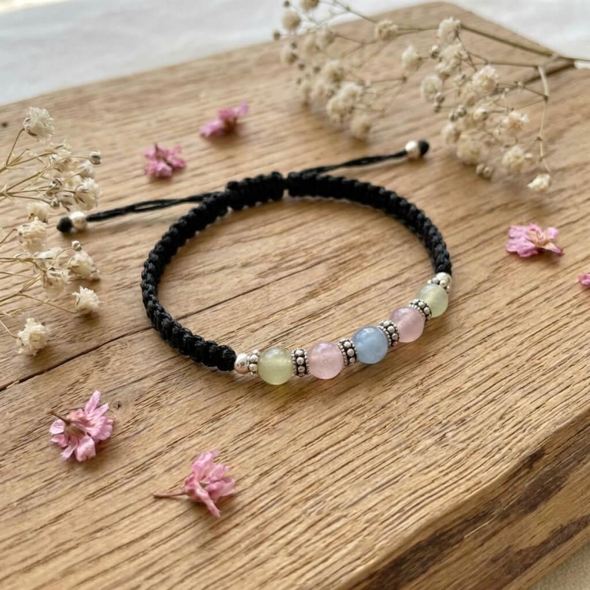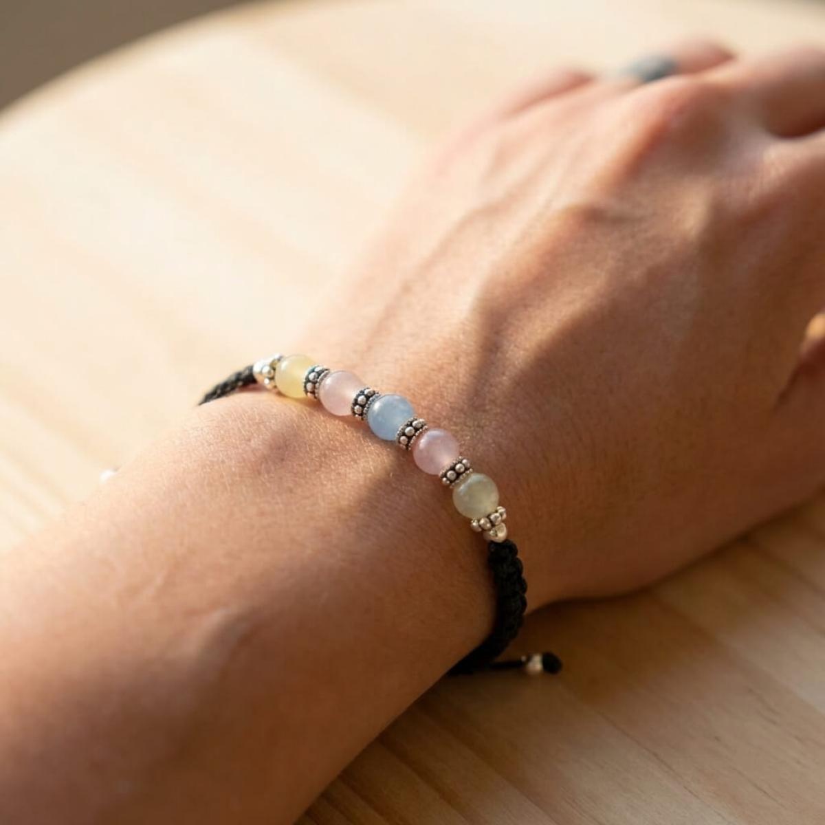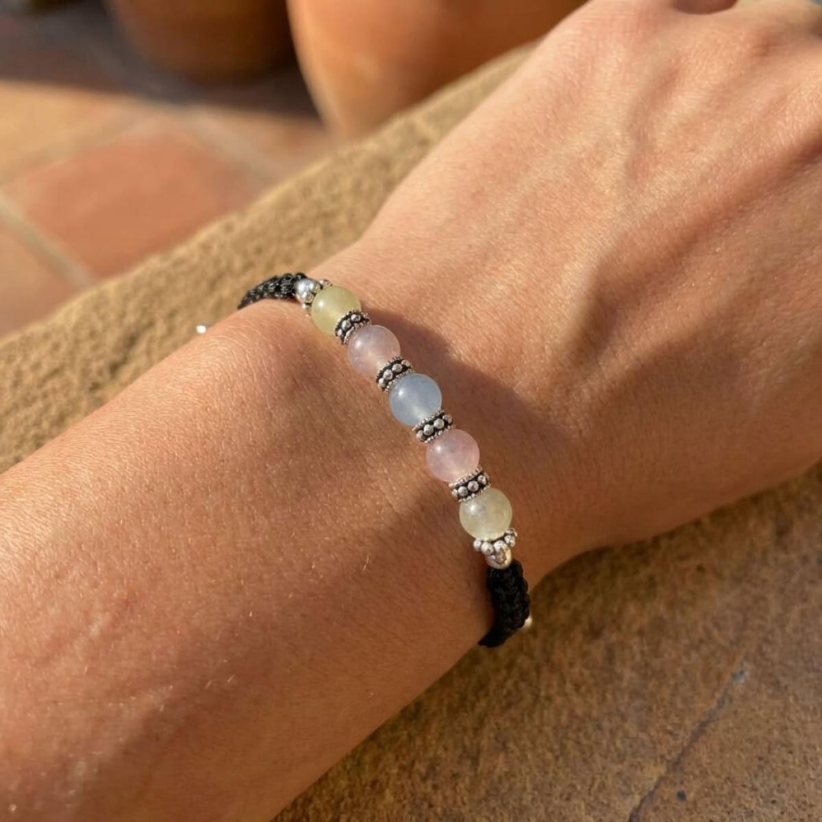 Тази изящна гривна комбинира фини сребърни топчета (проба 925) с мъниста в различни цветове, които нежно преливат в различни нюанси според светлината. Игривите отблясъци създават усещане за магия и уникалност, а сребърните елементи придават изтънчен лукс.