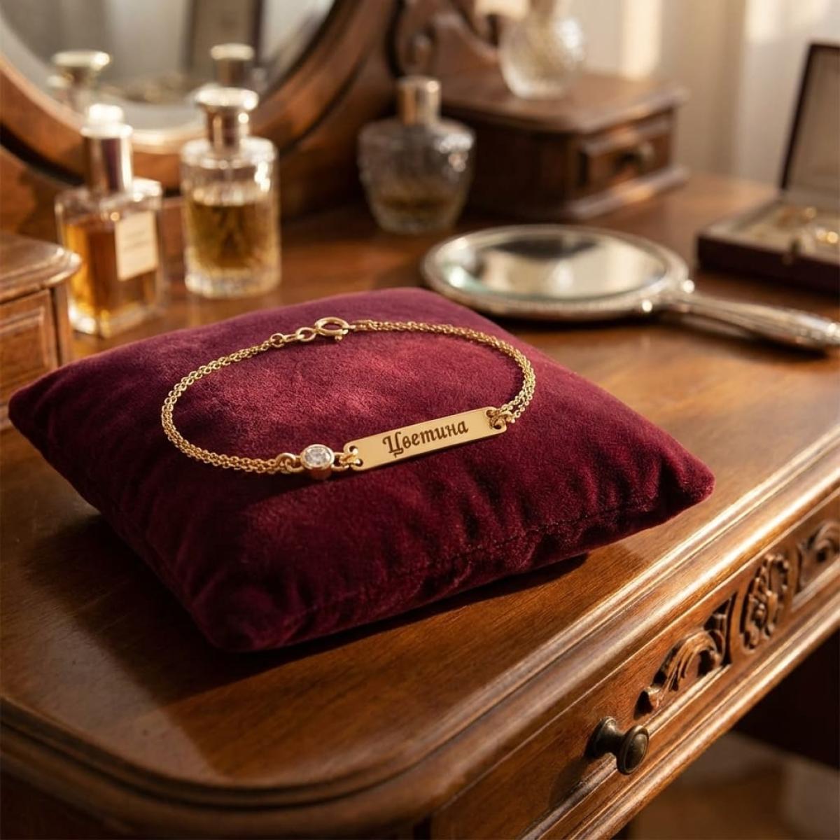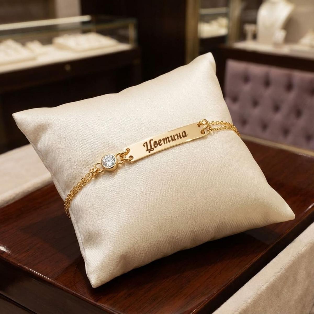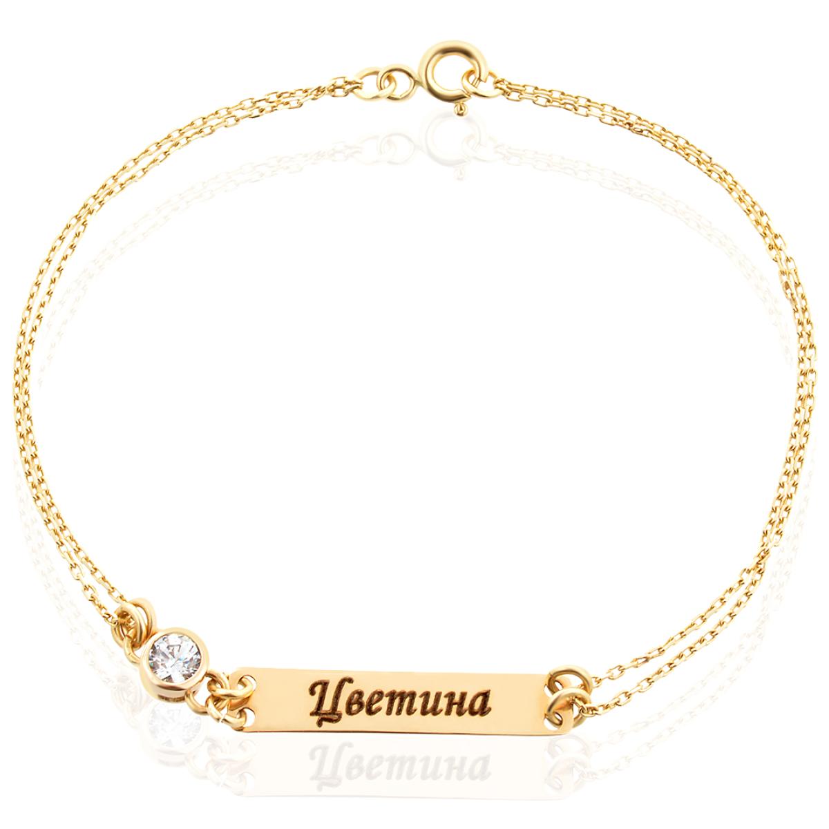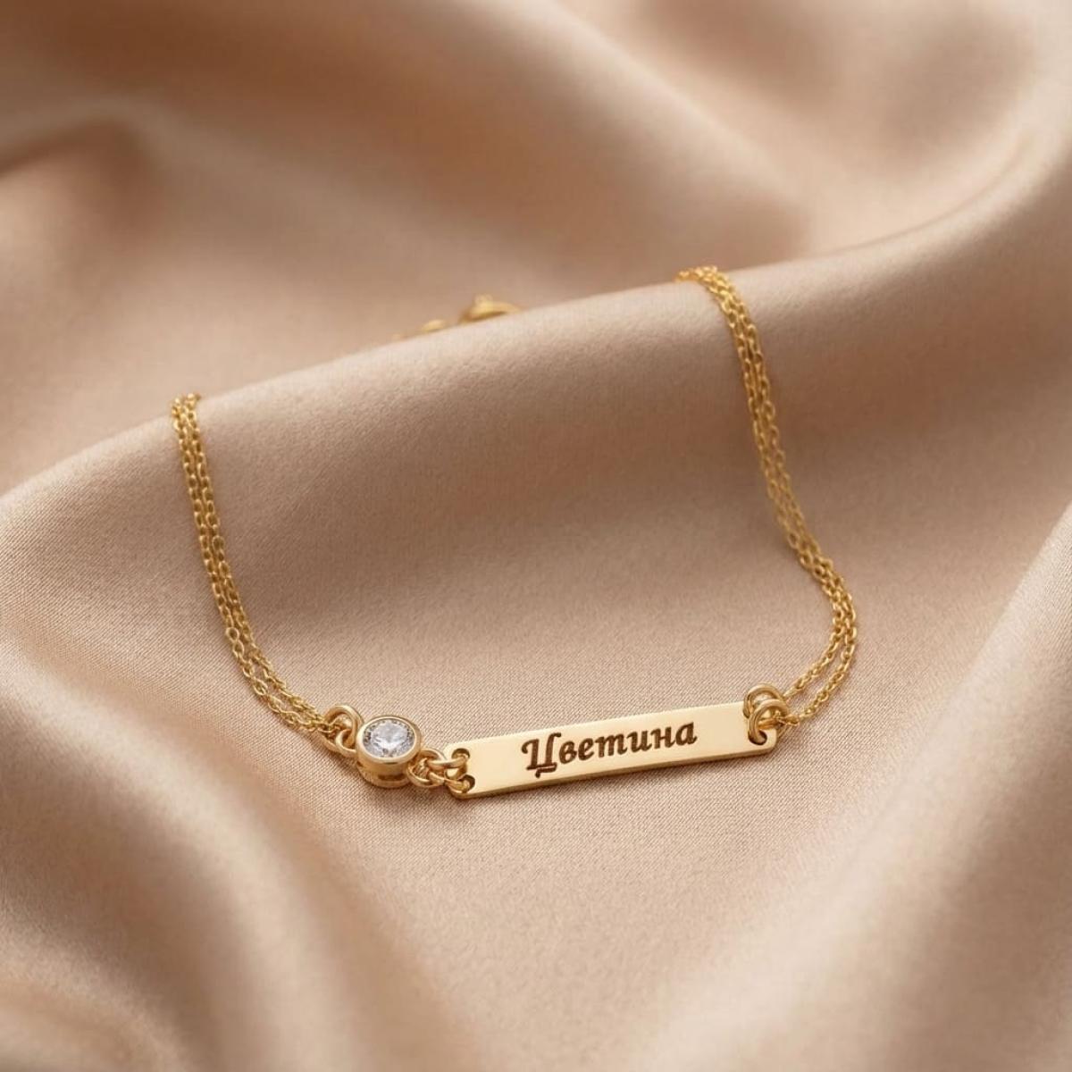 Елегантна златна гривна с двоен синджир и нежна плочка, украсена с блестящ циркон. Изработена от злато 14 карата, тя е изключително подходяща за гравиране – име, дата или специално послание.