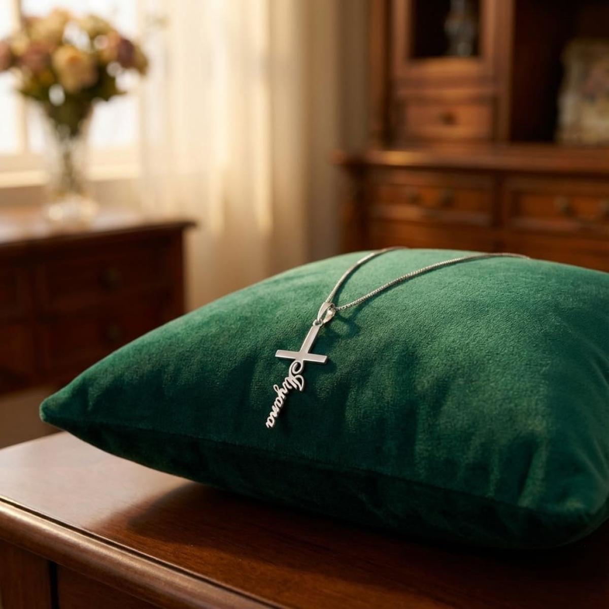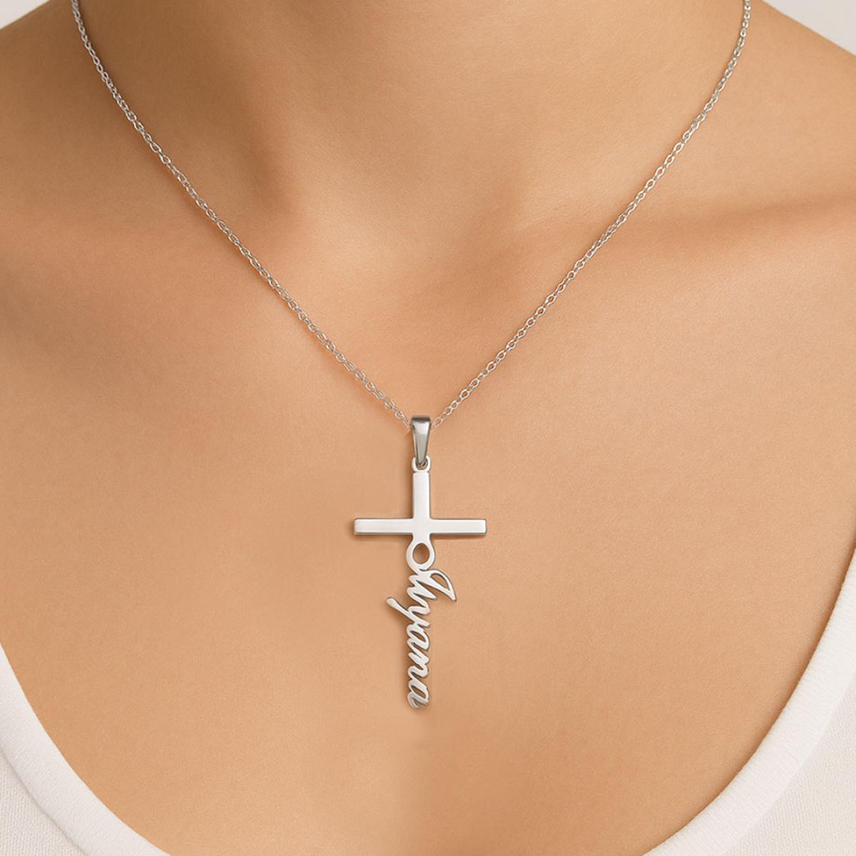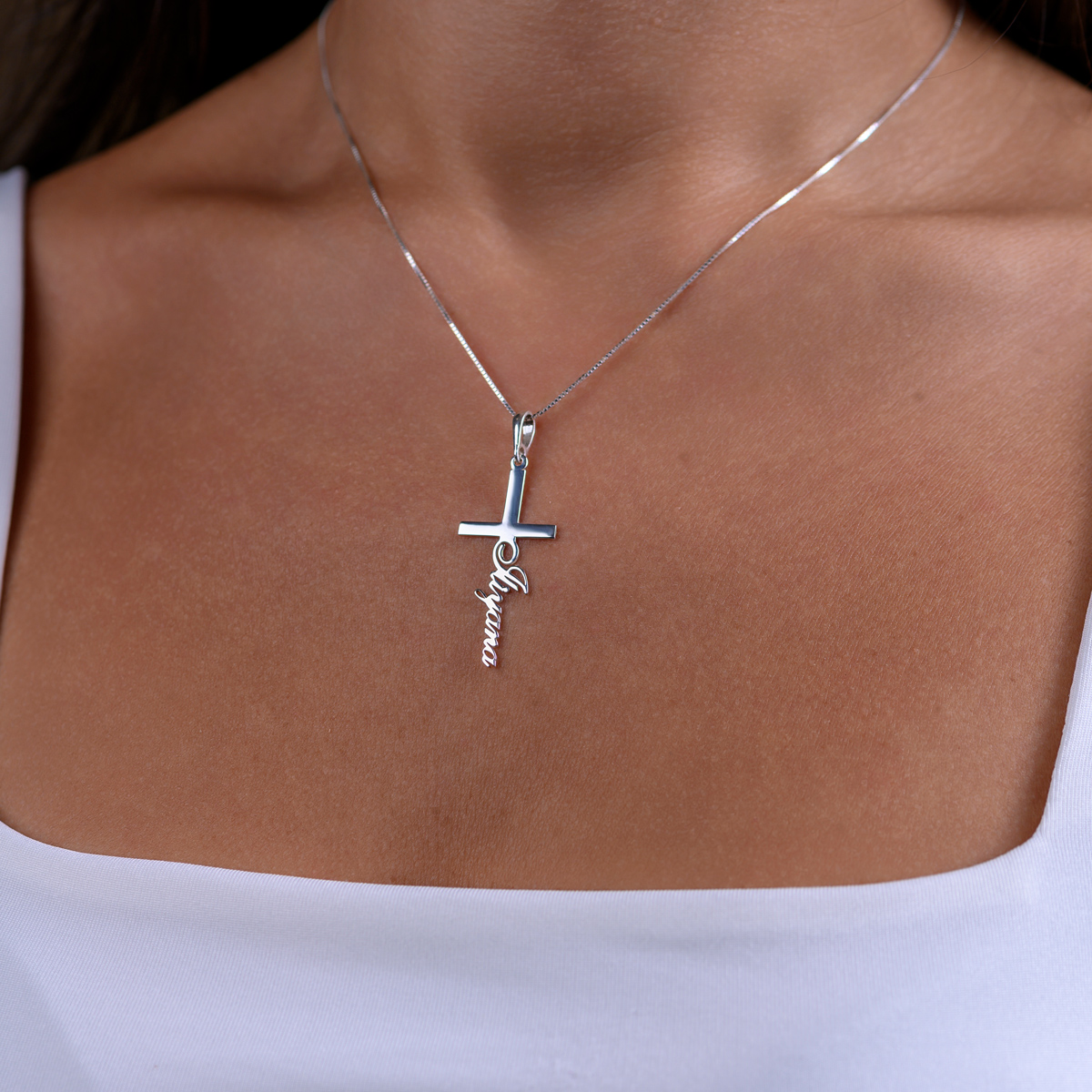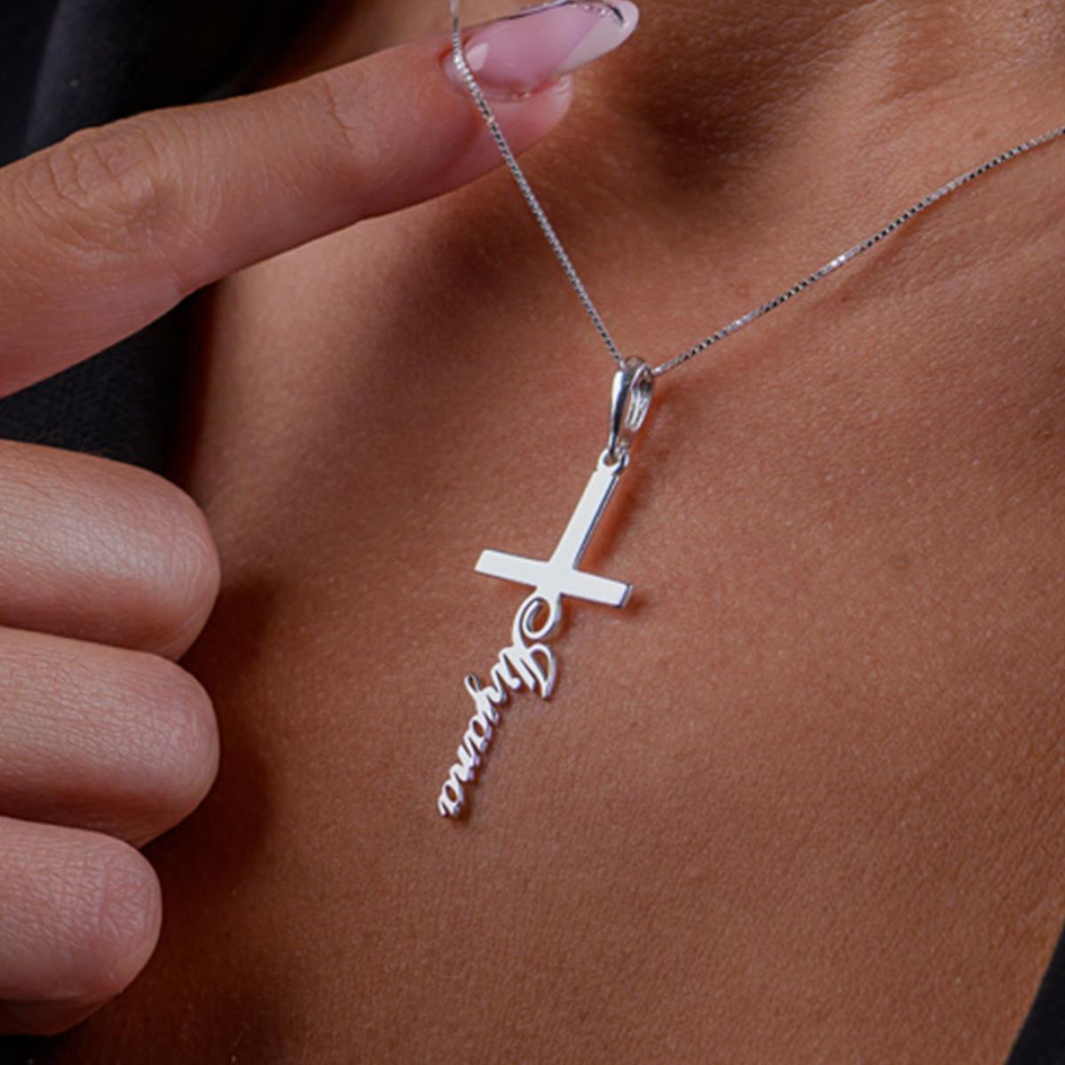 Елегантен и персонален аксесоар, изработен от сребро проба 925. Медальонът е във формата на класически кръст, върху който може да бъде изписано име по ваш избор. Символ на вяра и закрила.