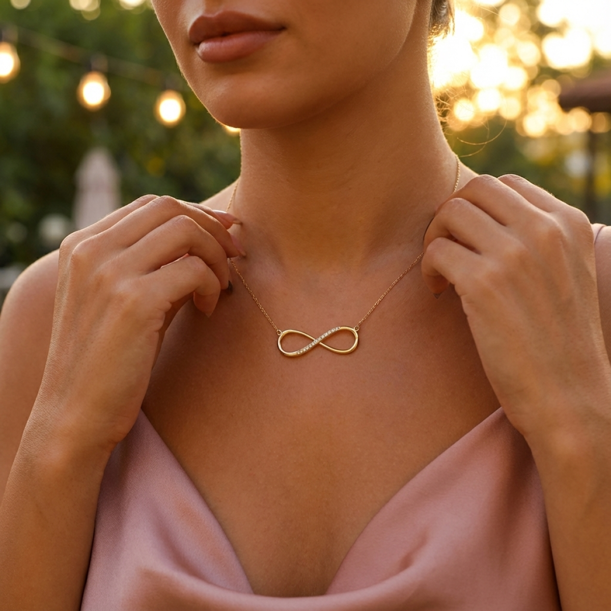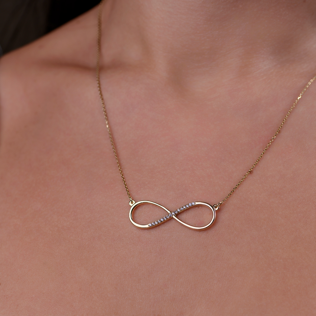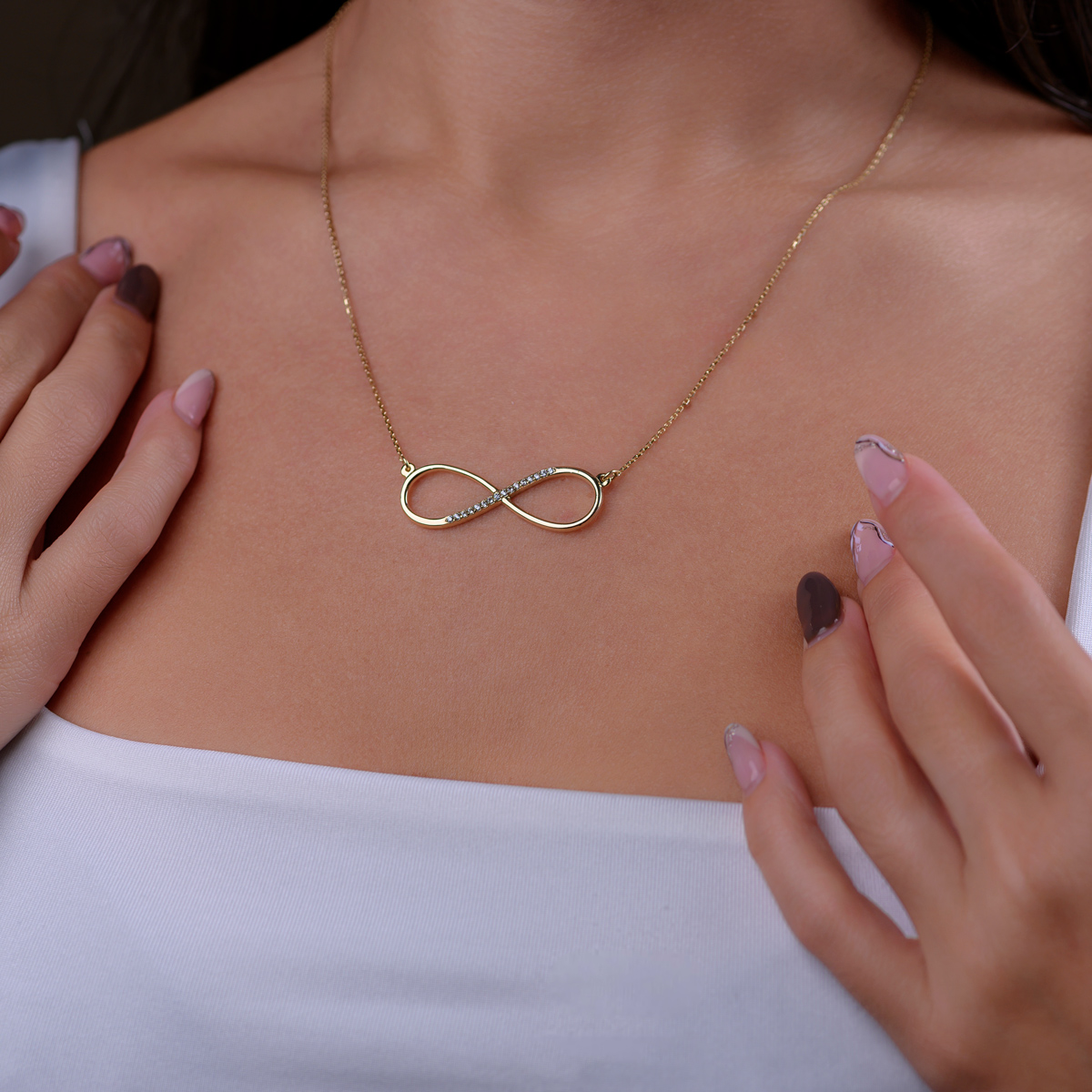 Освен като легнала цифра 8, фигурата може да се оприличи също на кокетна панделка. Тази форма символизира женското начало и автентичната женственост. Затова е и толкова силно застъпена именно в дамските бижута. От друга страна, в дизайна на златното дамско колие с безкрайност сме вмъкнали и символиката, изпълваща тази красива фигура.
