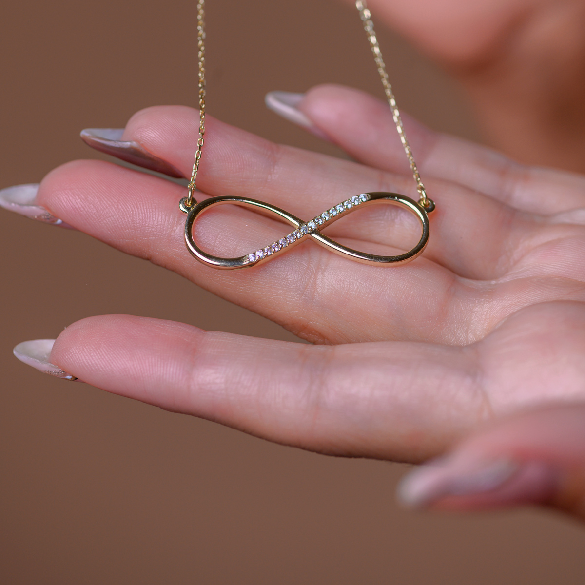 Макар символът на безкрайността да е очарователен сам по себе си, нашият дизайнерски екип реши да добави малък акцент във визията на декоративния елемент на бижуто. Вмъкнахме в овала му фини и нежни камъни циркони, които да се сливат с блясъка на златото и да допълват неговата красота.