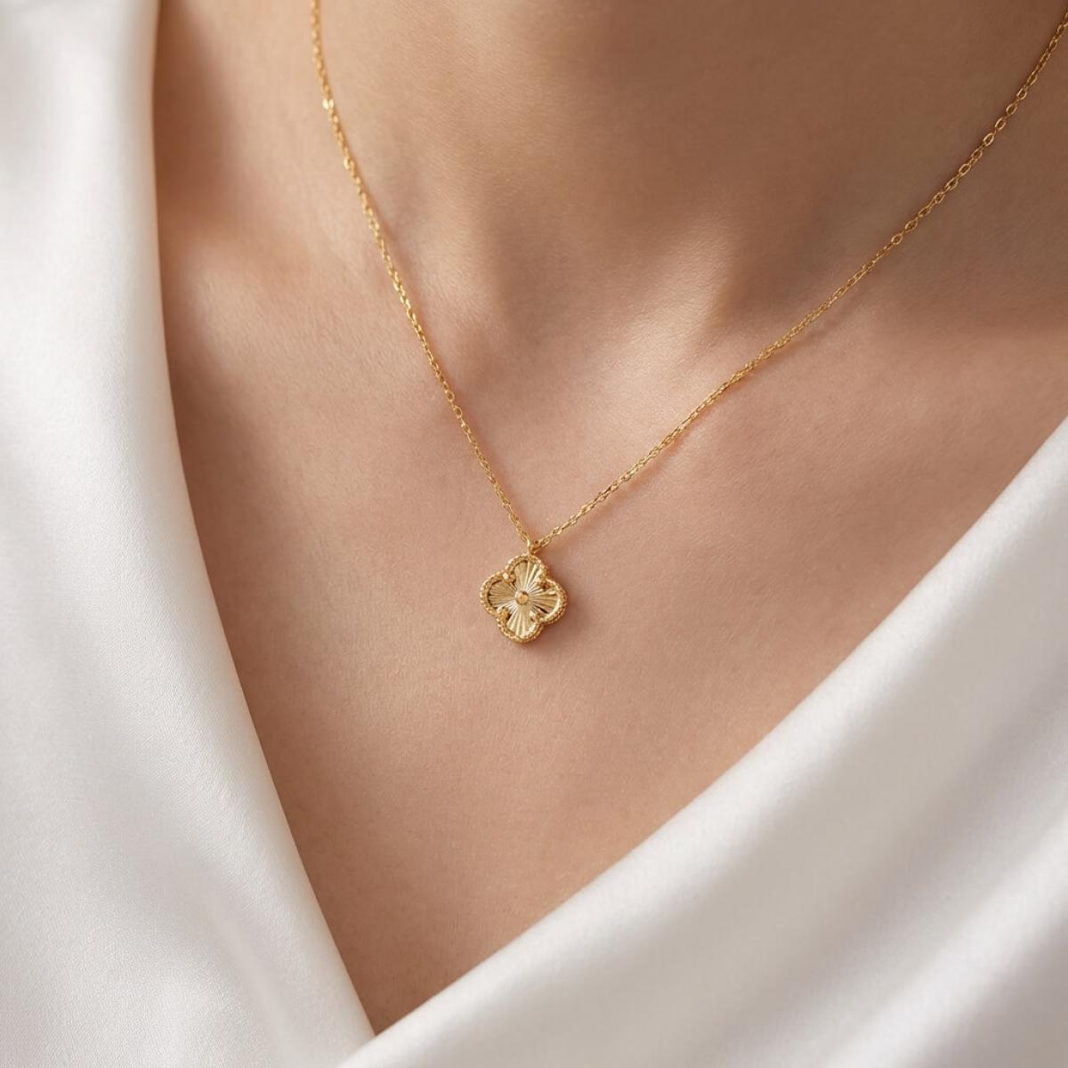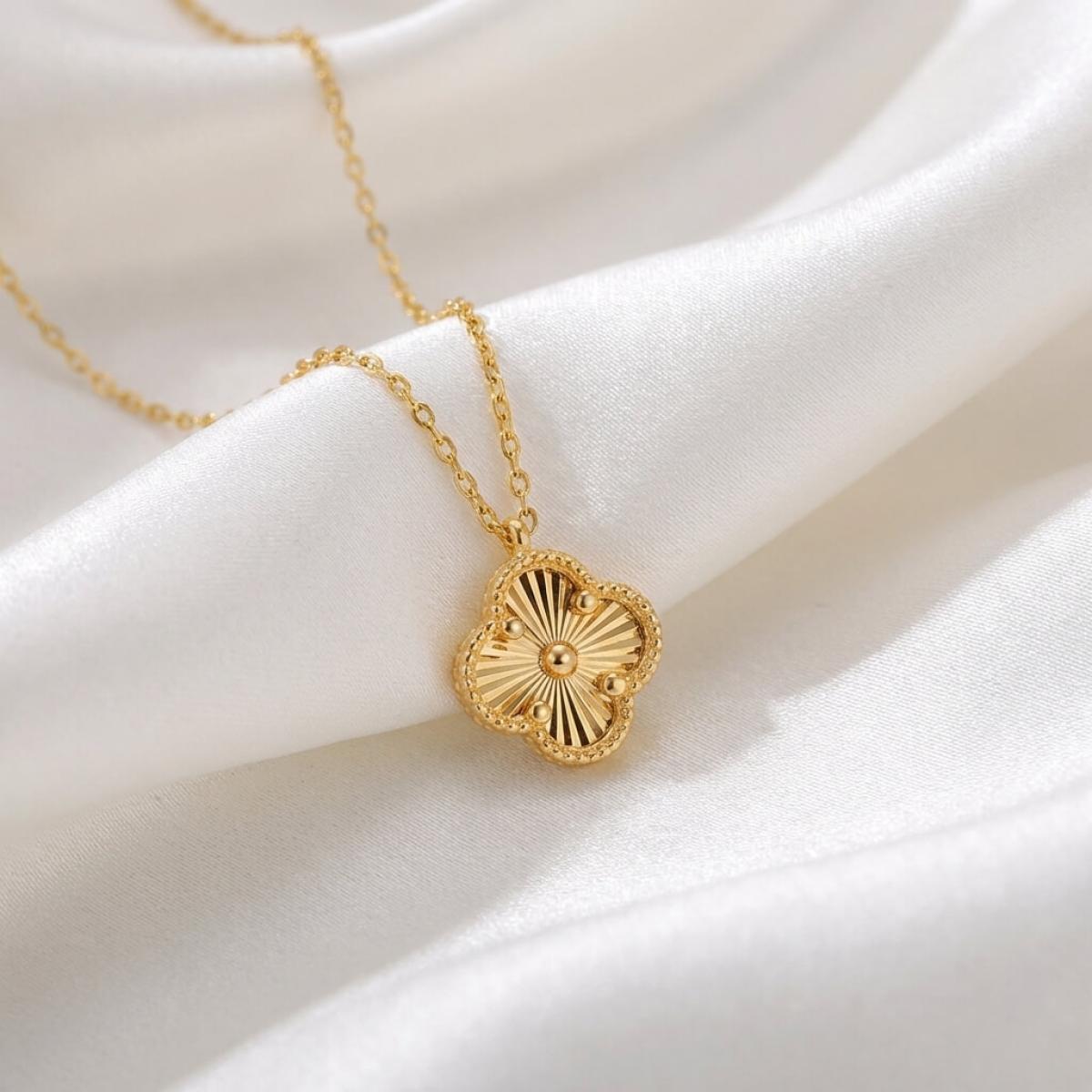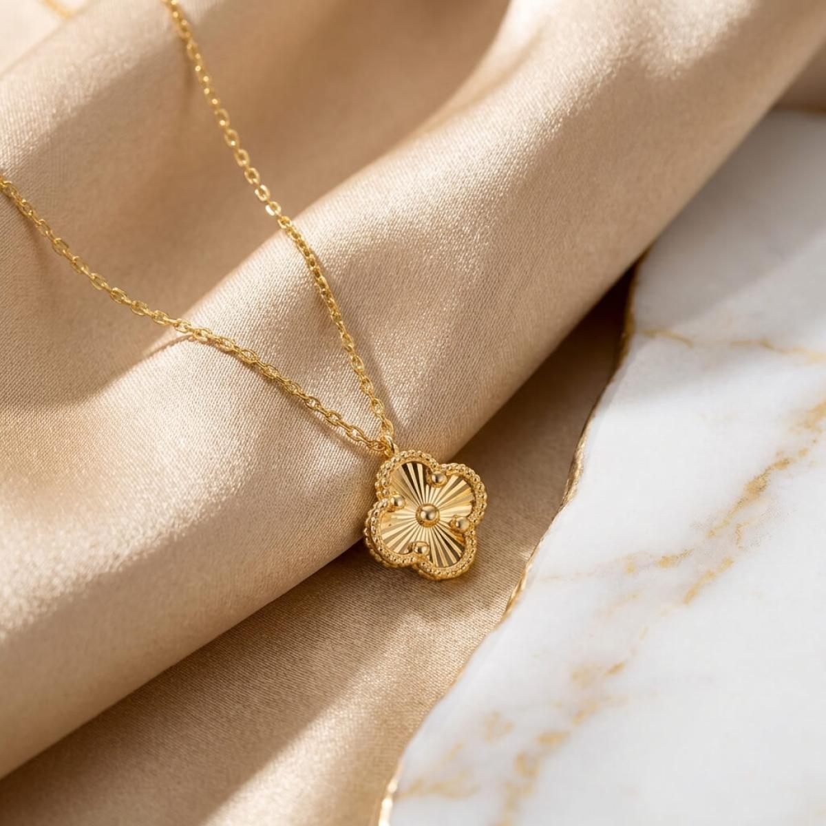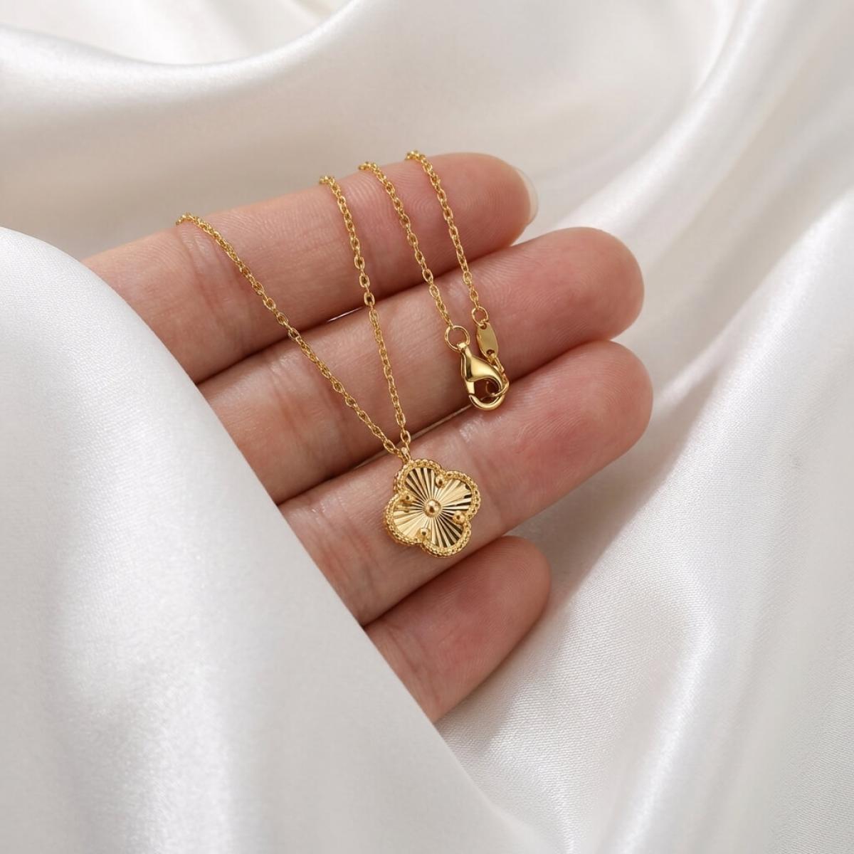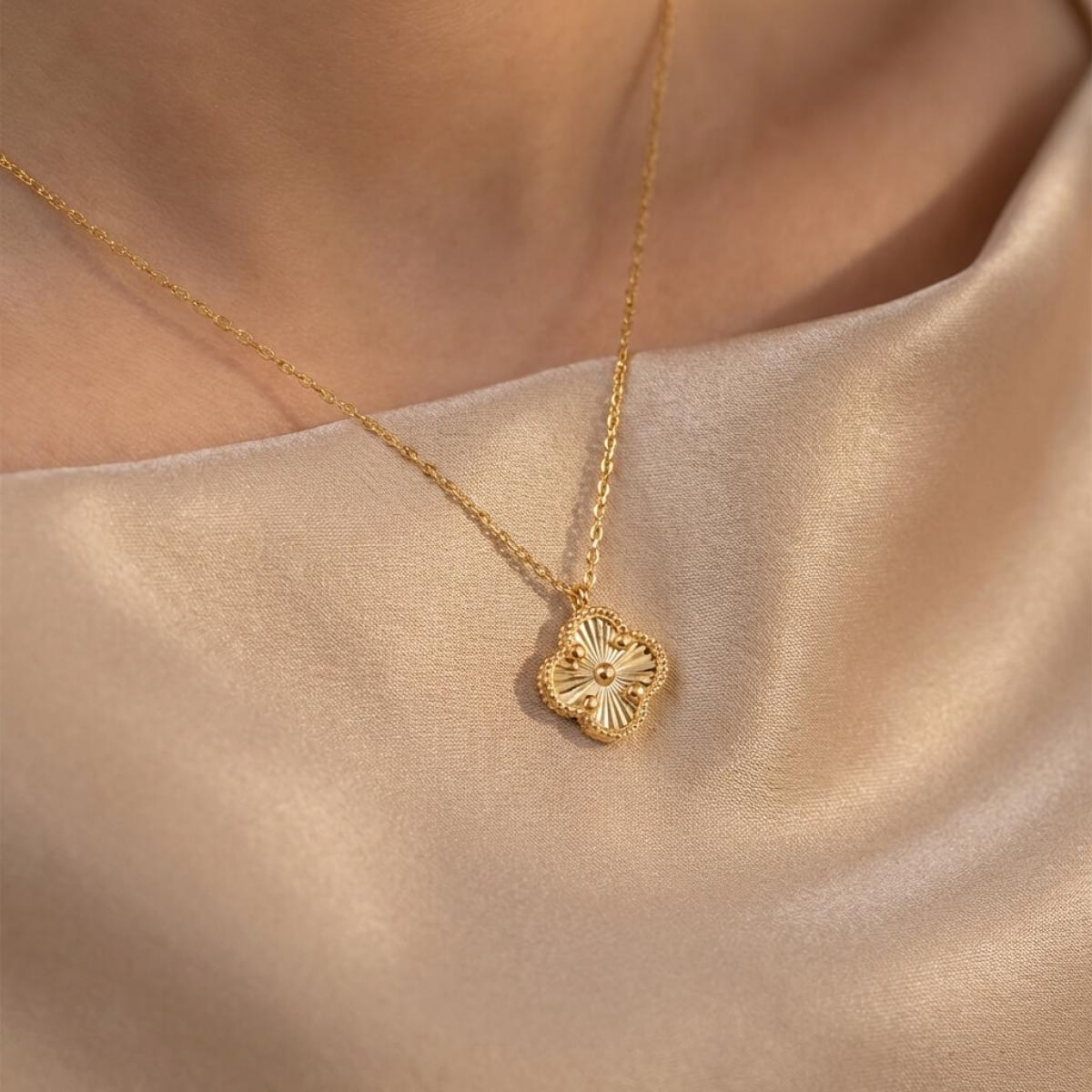 Това изискано златно колие е създадено, за да подчертае вашата елегантност и стил. Детелината, символ на късмет, щастие и благополучие, е инкрустирана с блестящи линий, които ѝ придават диамантен блясък.