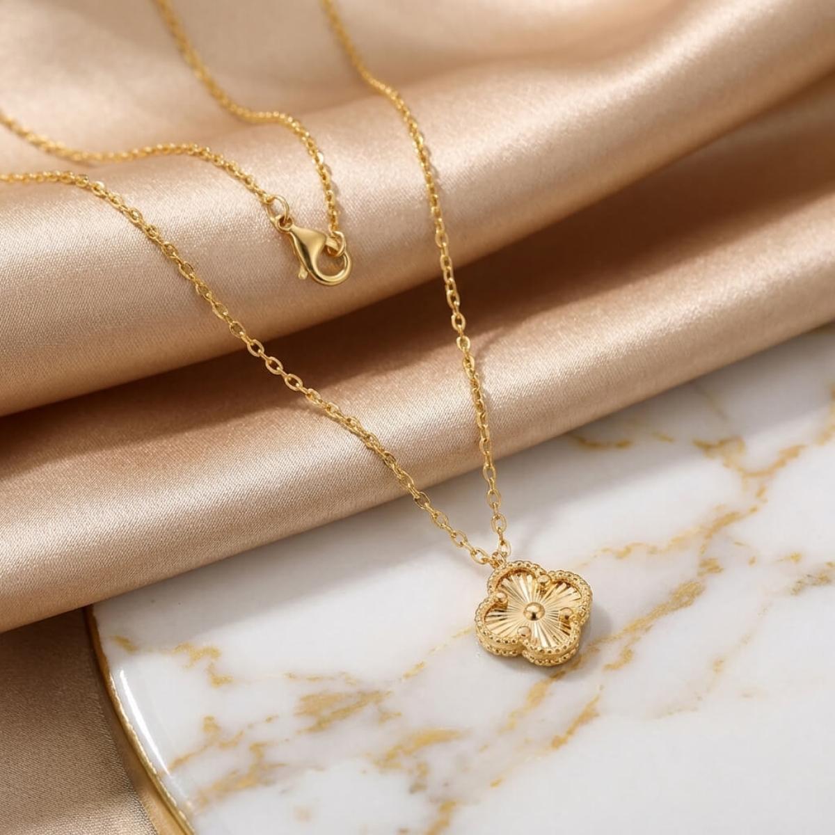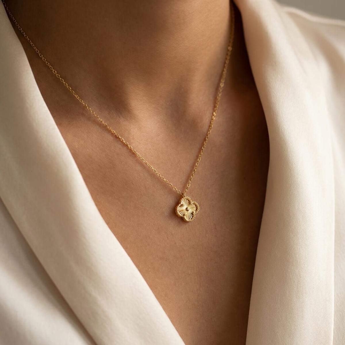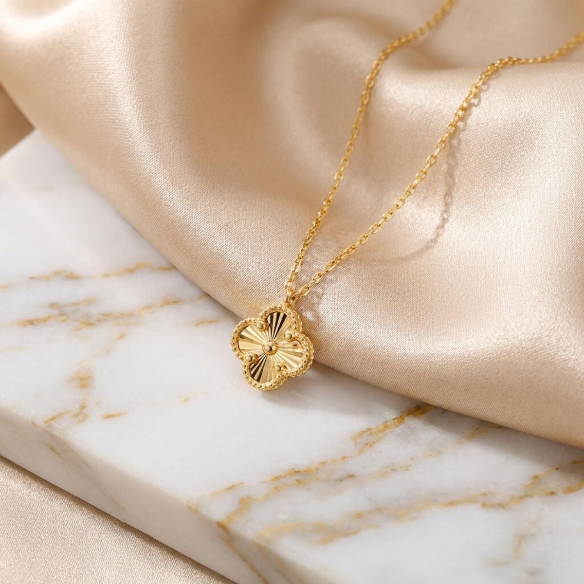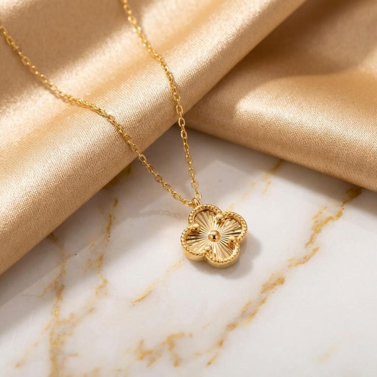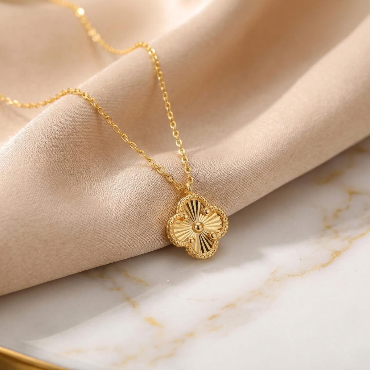Това изискано златно колие е създадено, за да подчертае вашата елегантност и стил. Детелината, символ на късмет, щастие и благополучие, е инкрустирана с блестящи линий, които ѝ придават диамантен блясък.