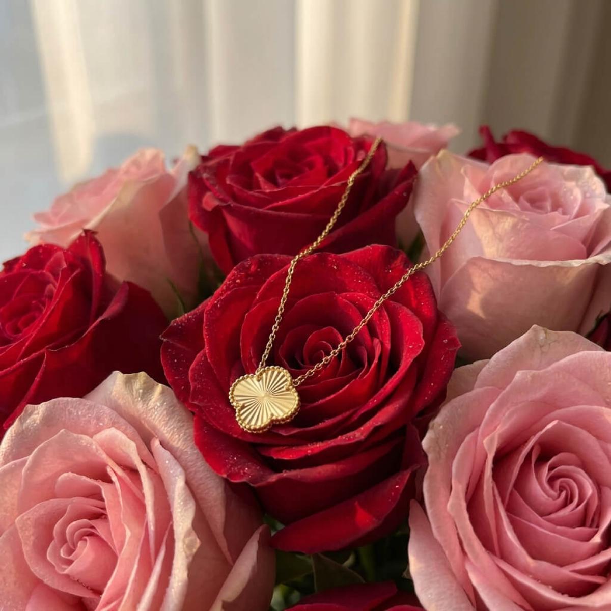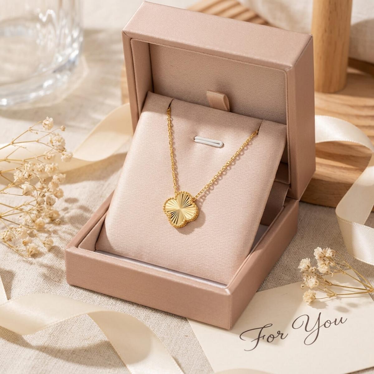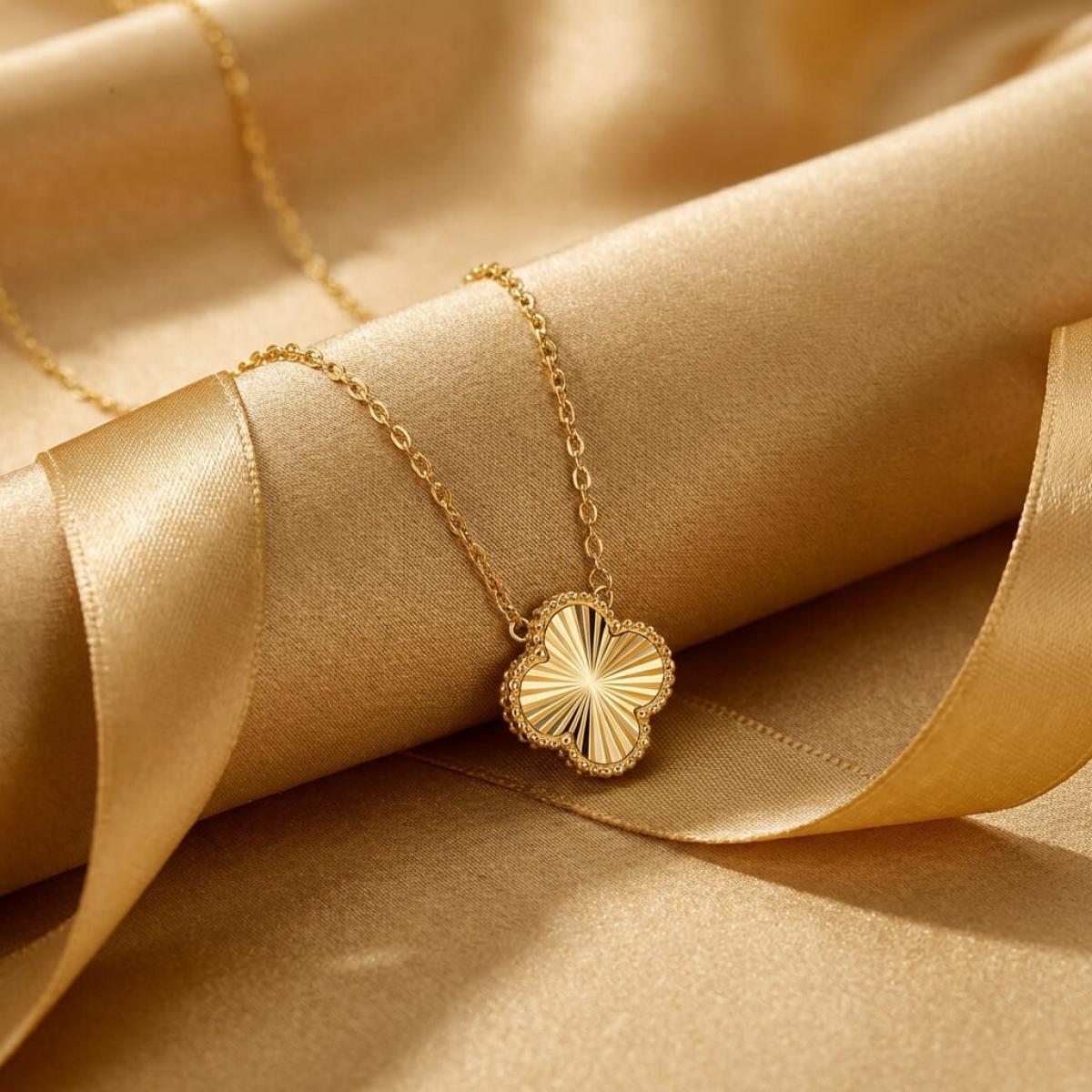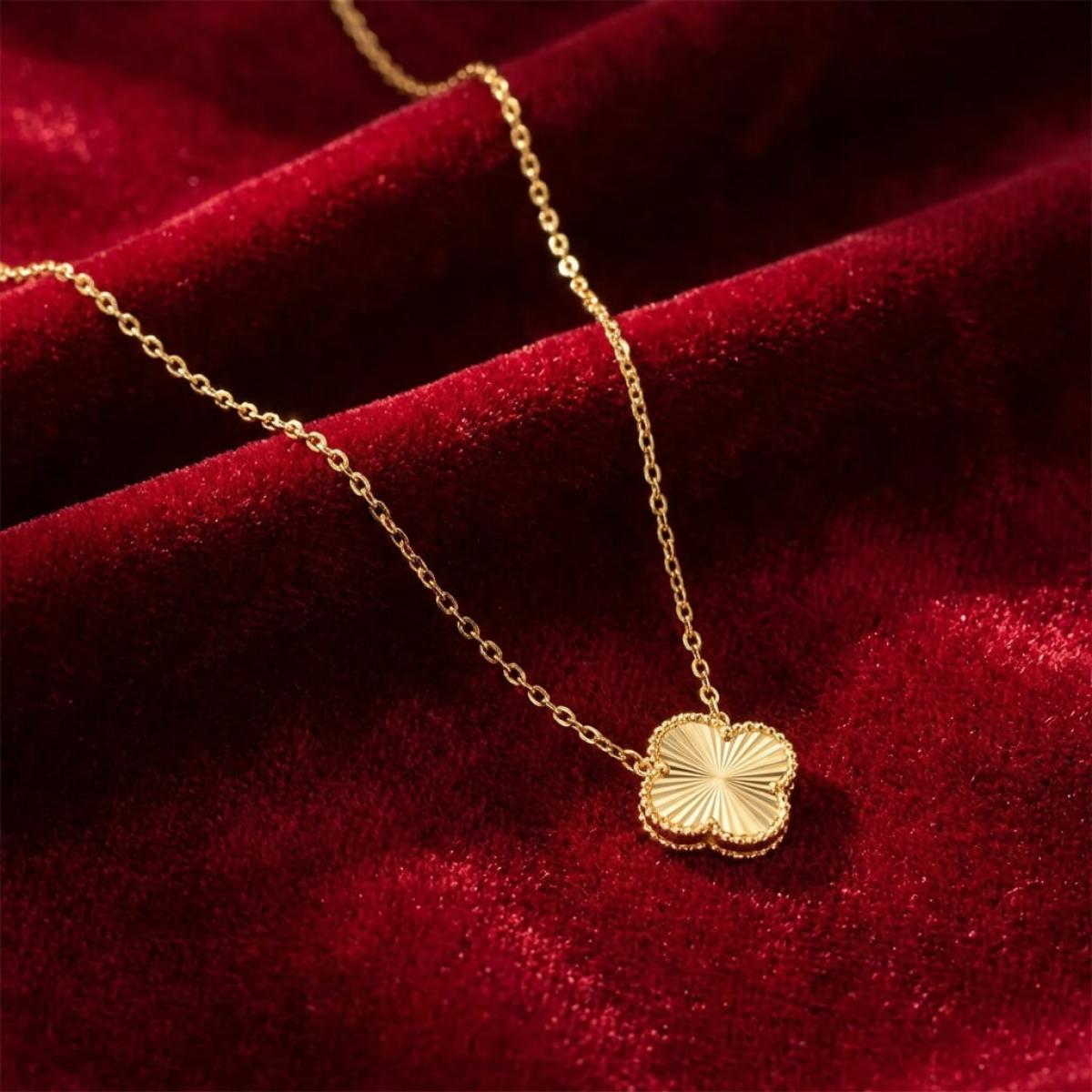 Това изискано златно колие е създадено, за да подчертае вашата елегантност и стил. Детелината, символ на късмет, щастие и благополучие, е инкрустирана с блестящи линий, които ѝ придават диамантен блясък.