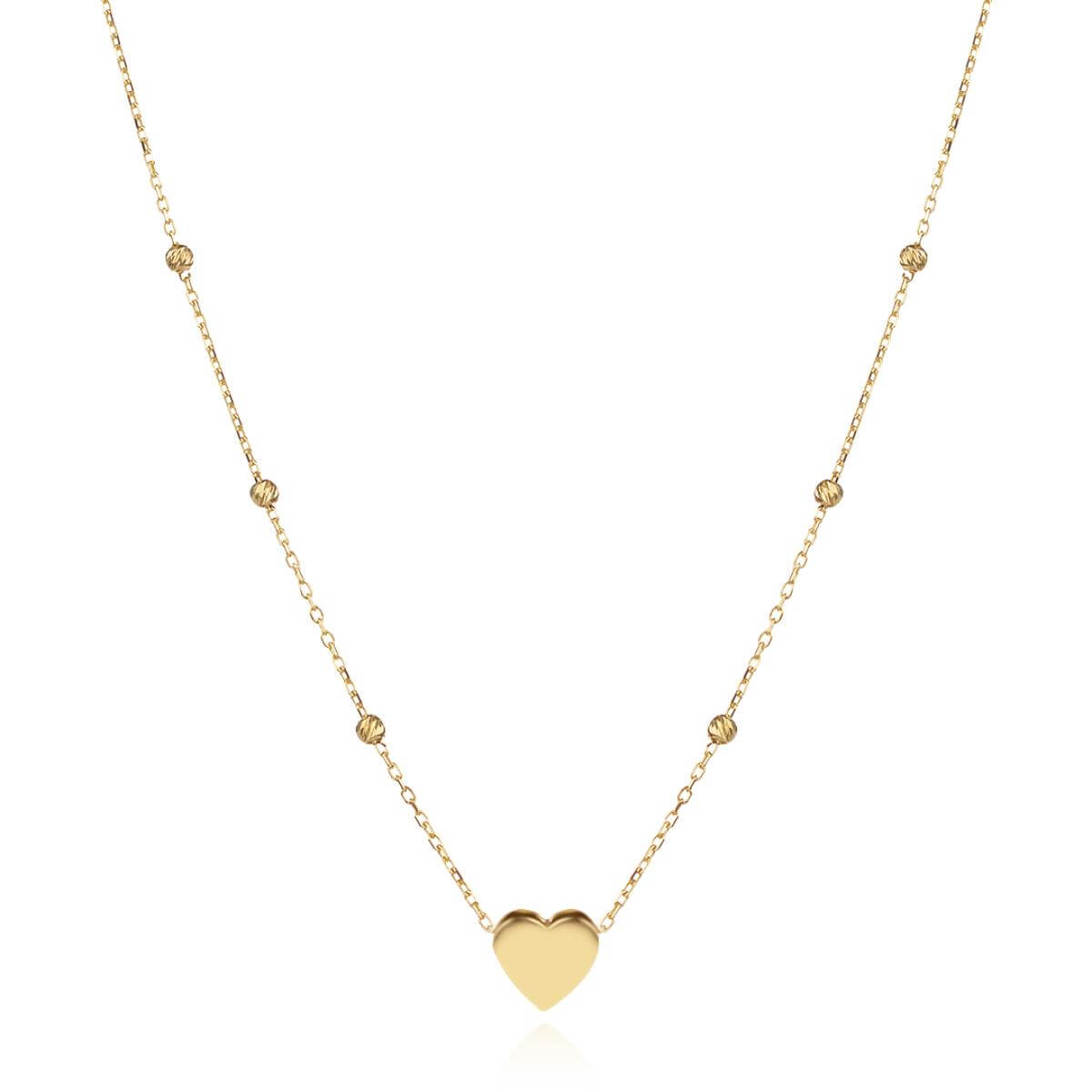 Изработено от жълто злато проба 585, това елегантно колие се отличава с изящно сърце, което олицетворява силата на любовта и топлината на човешките чувства. Фино допълнено със златни топчета, то придава нежност и блясък, правейки го перфектен аксесоар за всяка визия.