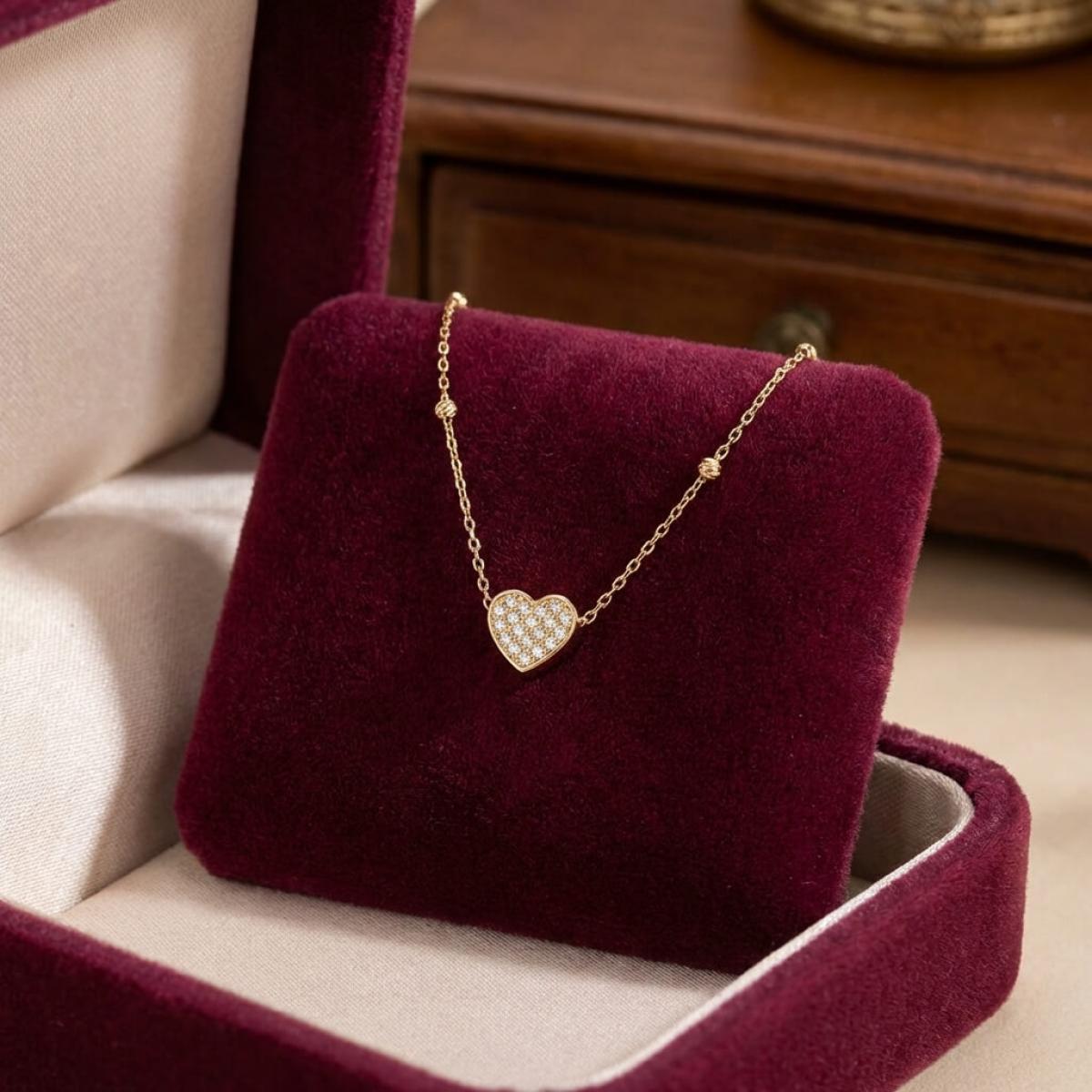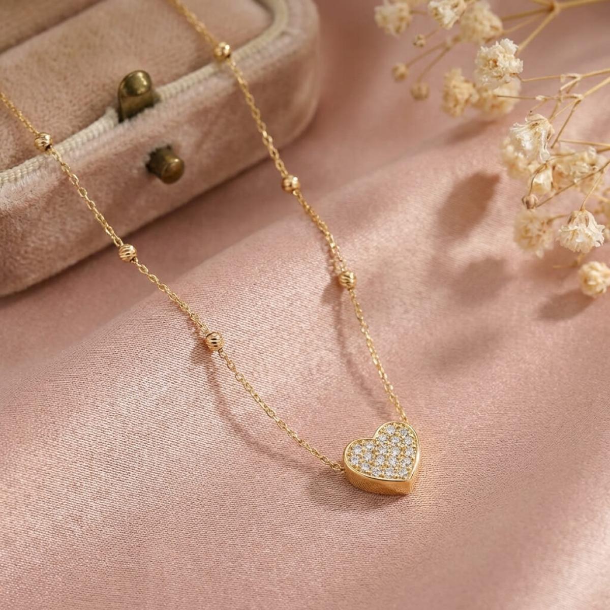Изработено от жълто злато проба 585, това елегантно колие се отличава с изящно сърце, което олицетворява силата на любовта и топлината на човешките чувства. Фино допълнено със златни топчета и малки и бели циркони, то придава нежност и блясък, правейки го перфектен аксесоар за всяка визия.