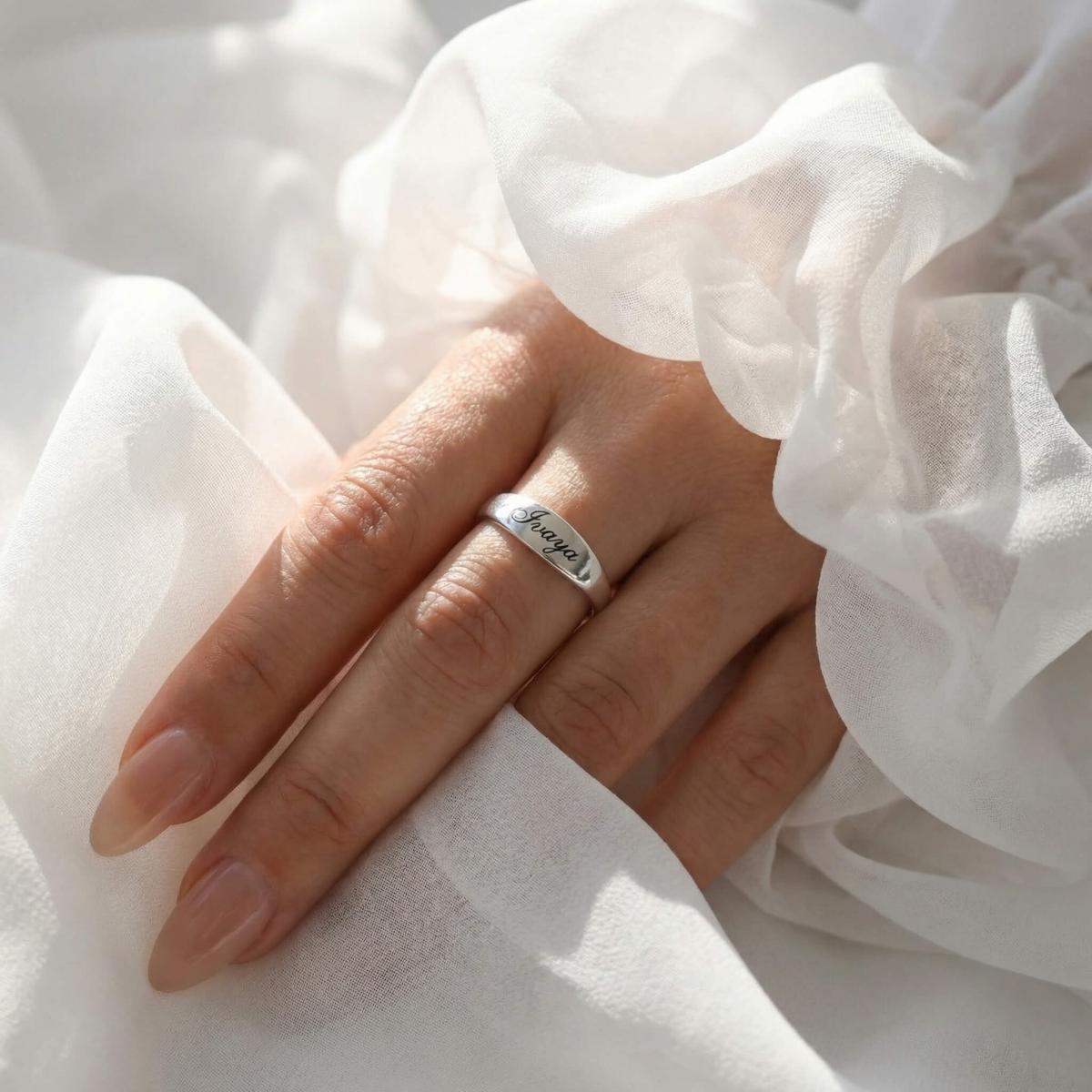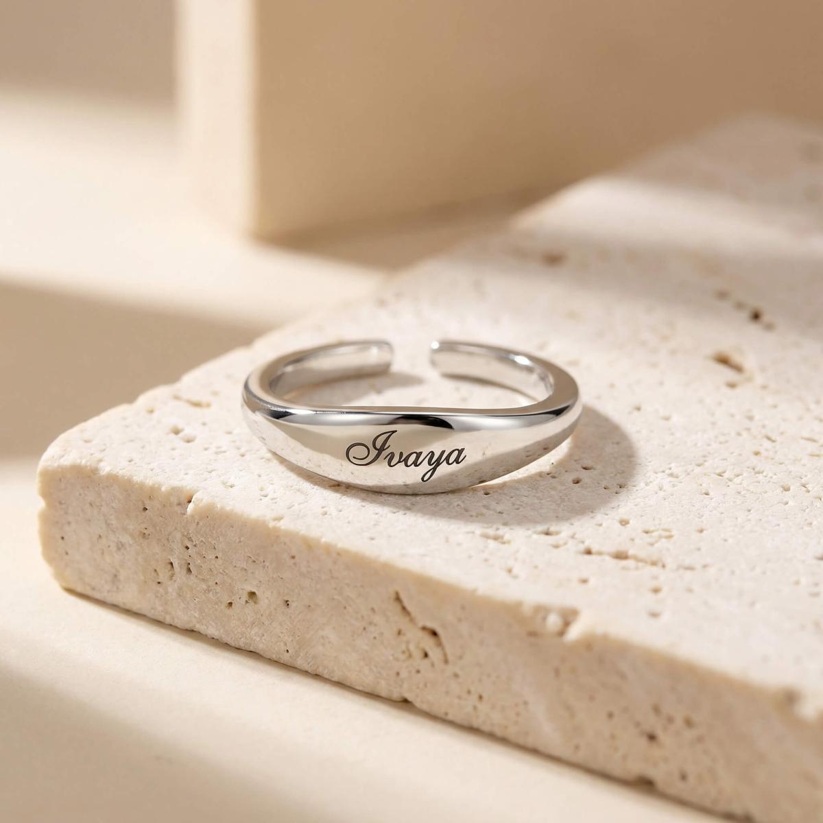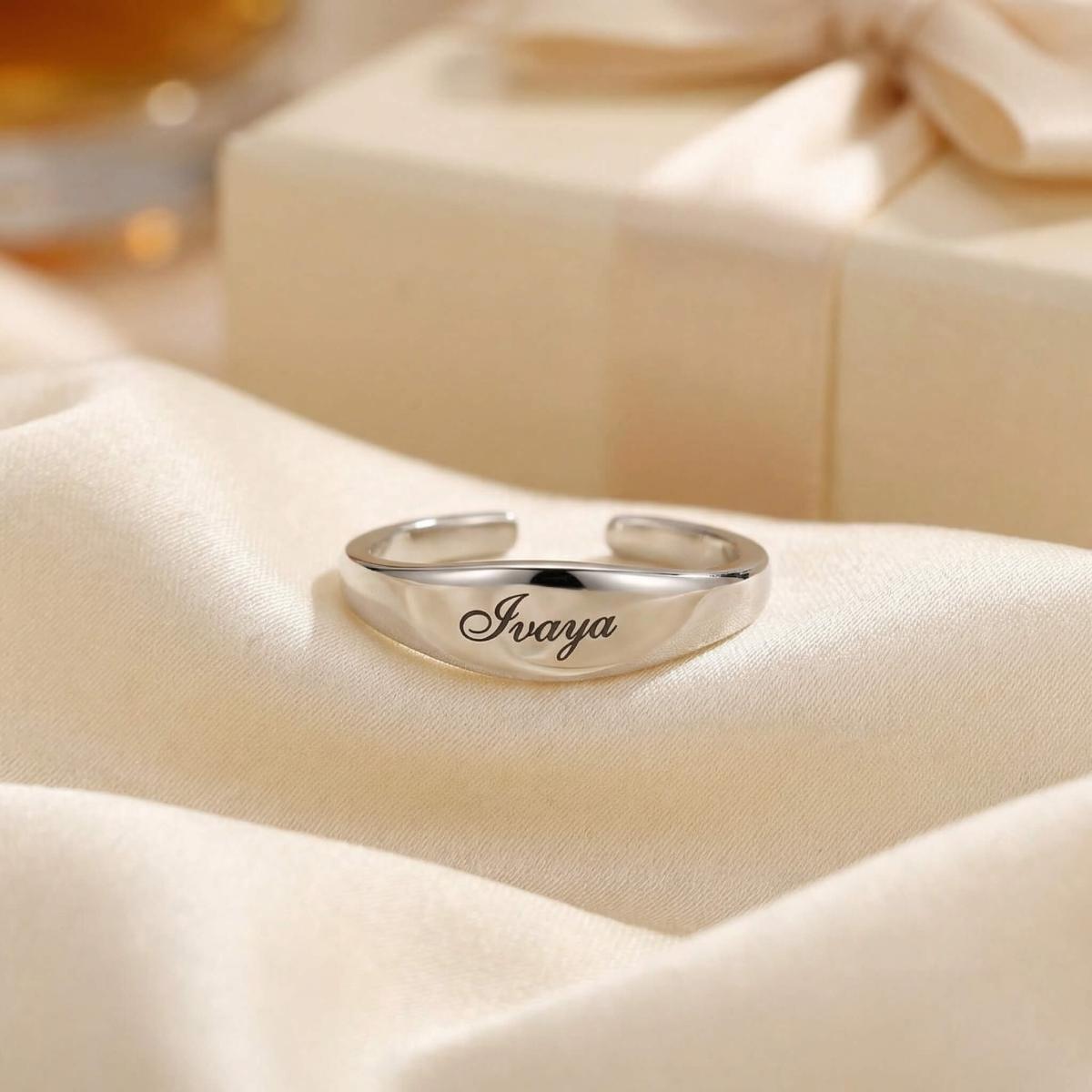 Елегантен и модерен сребърен пръстен с изчистен, отворен дизайн, който позволява леко регулиране на размера. Акцентът е заоблената продълговата плочка, идеална за персонална гравюра - име, инициали или дата, превръщайки бижуто в уникален и личен подарък.