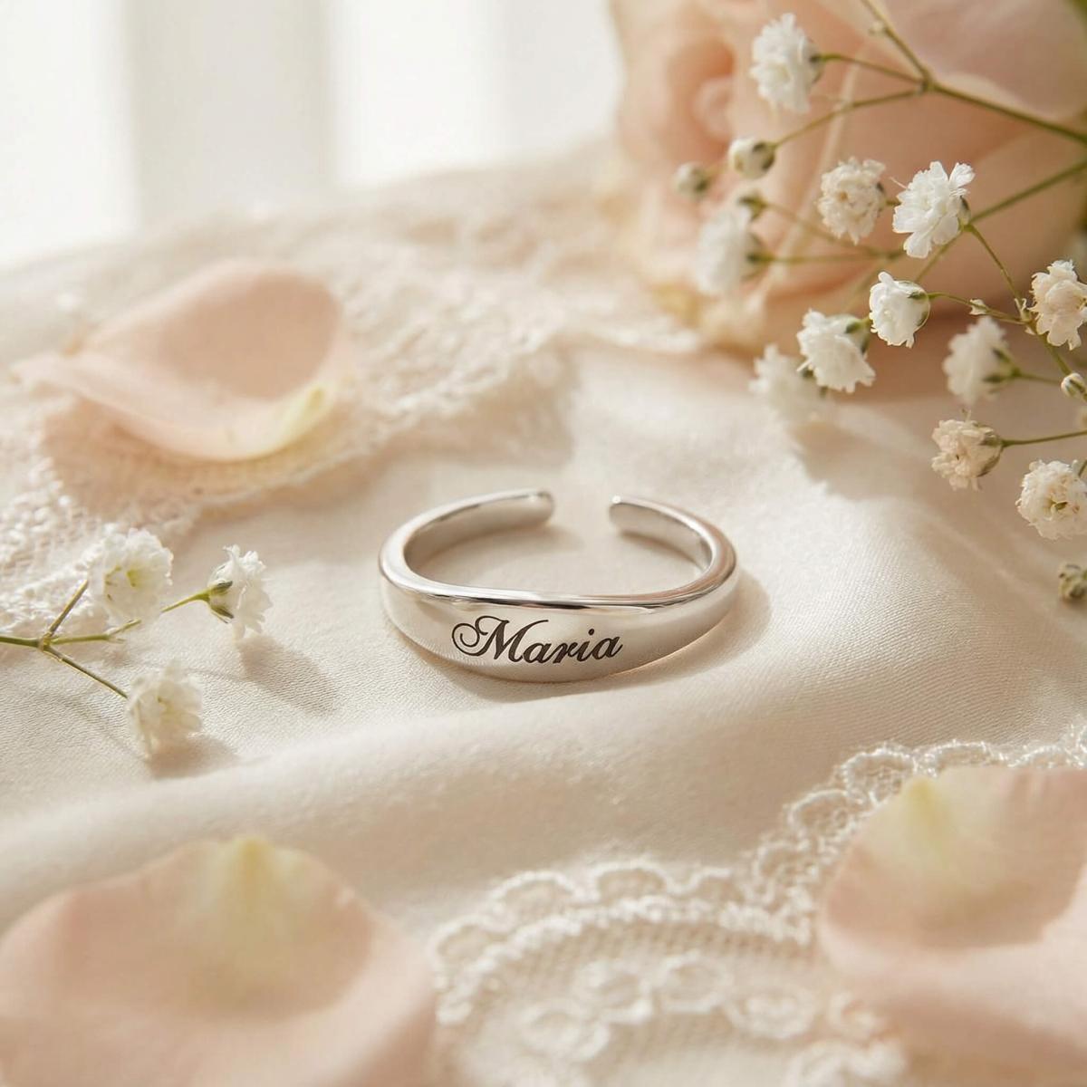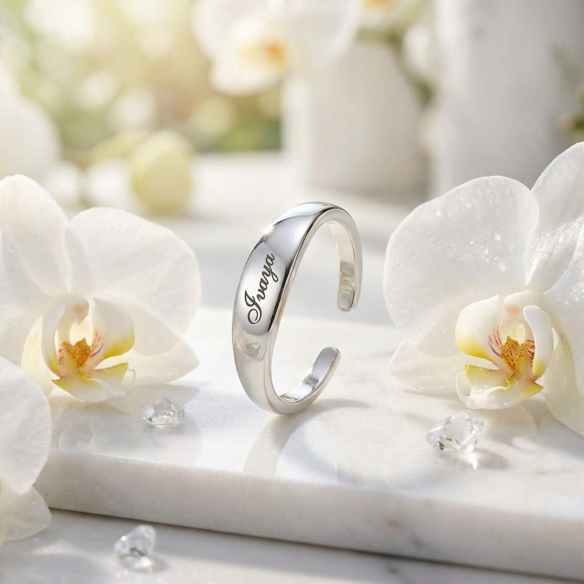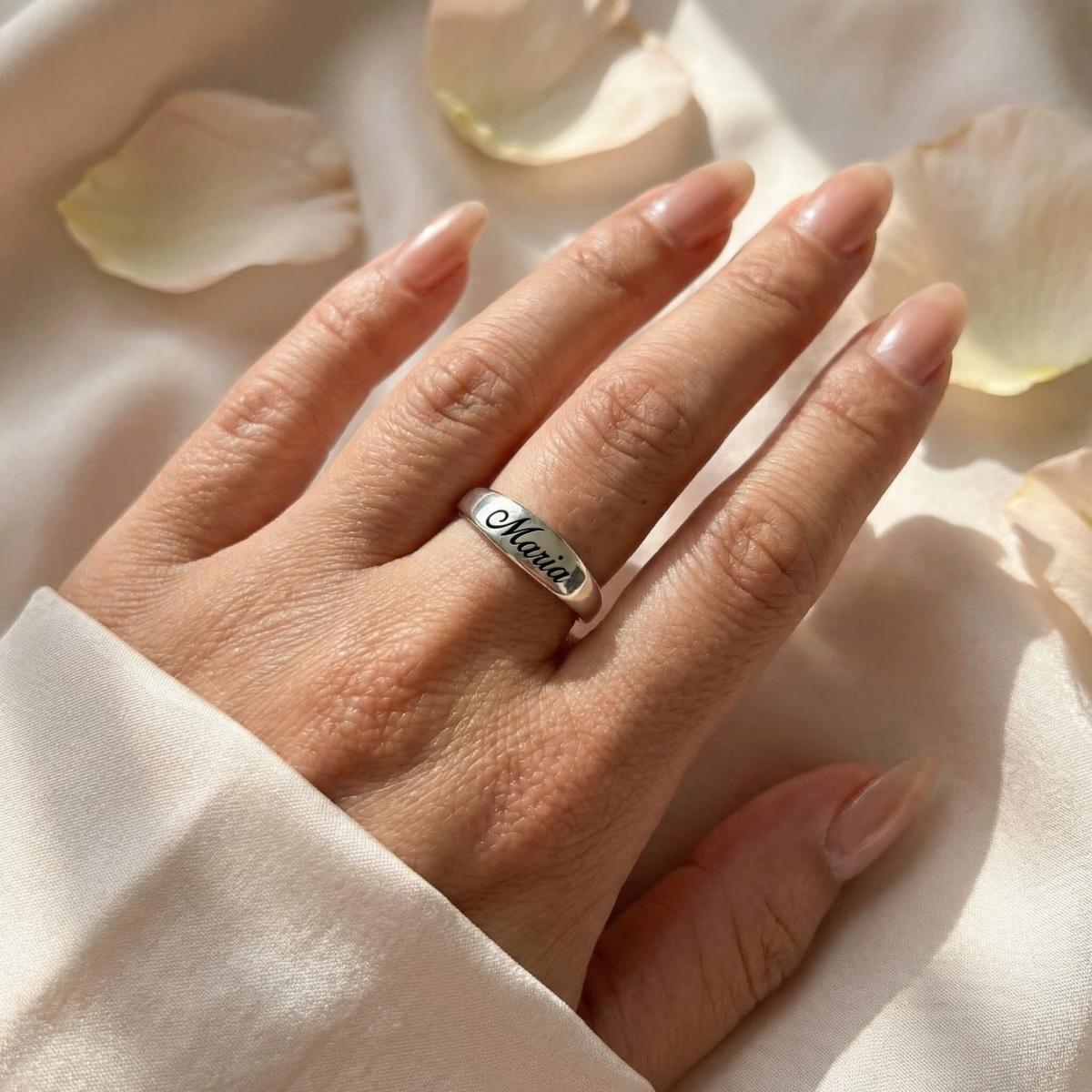 Елегантен и модерен сребърен пръстен с изчистен, отворен дизайн, който позволява леко регулиране на размера. Акцентът е заоблената продълговата плочка, идеална за персонална гравюра - име, инициали или дата, превръщайки бижуто в уникален и личен подарък.